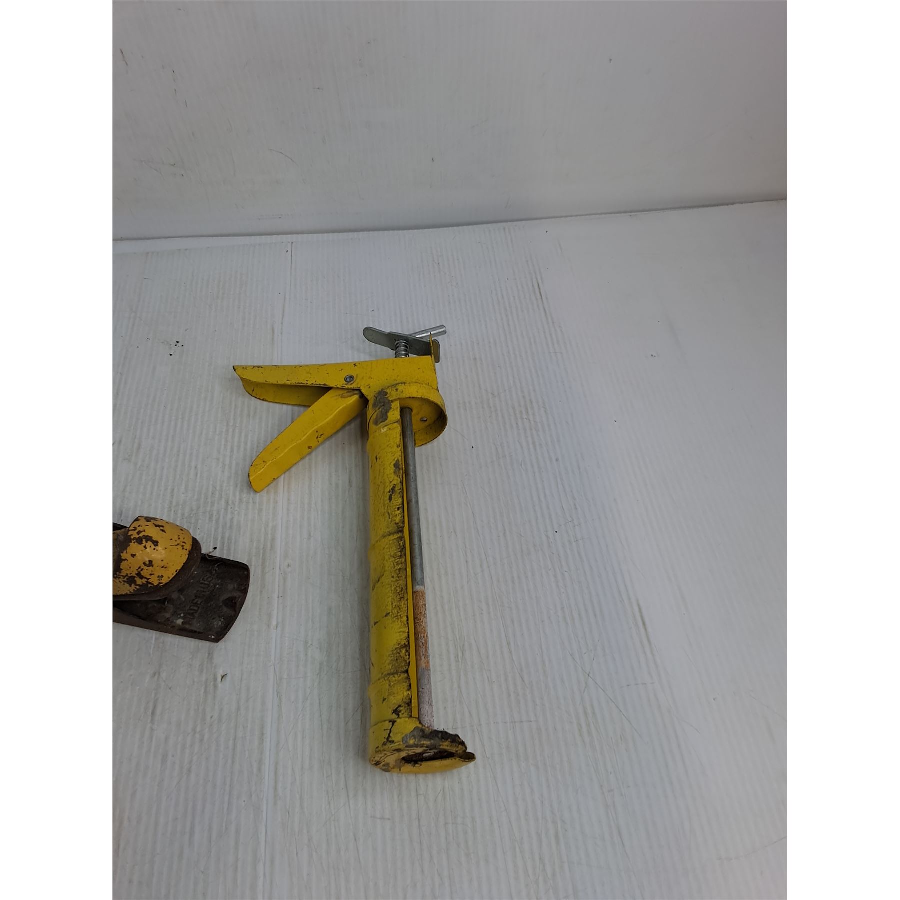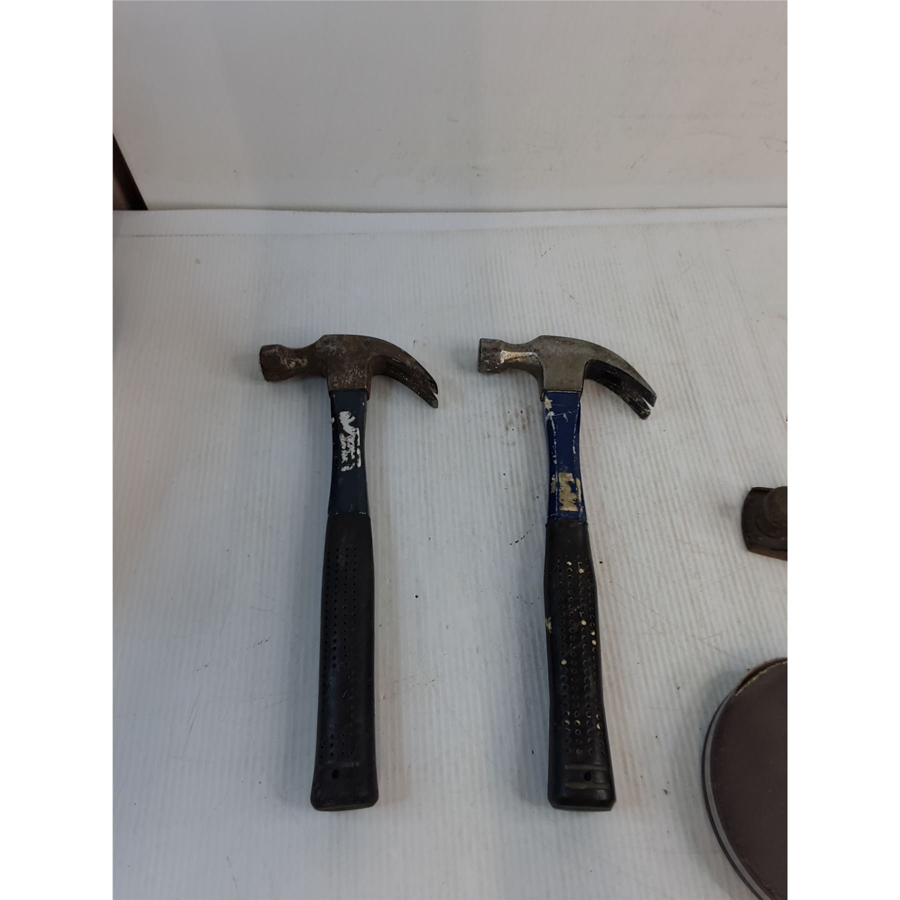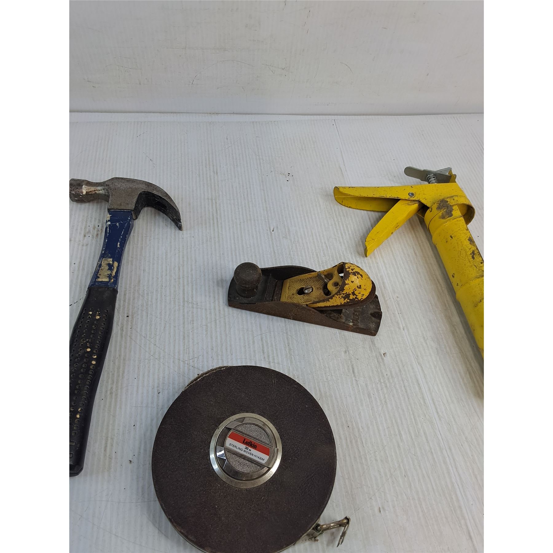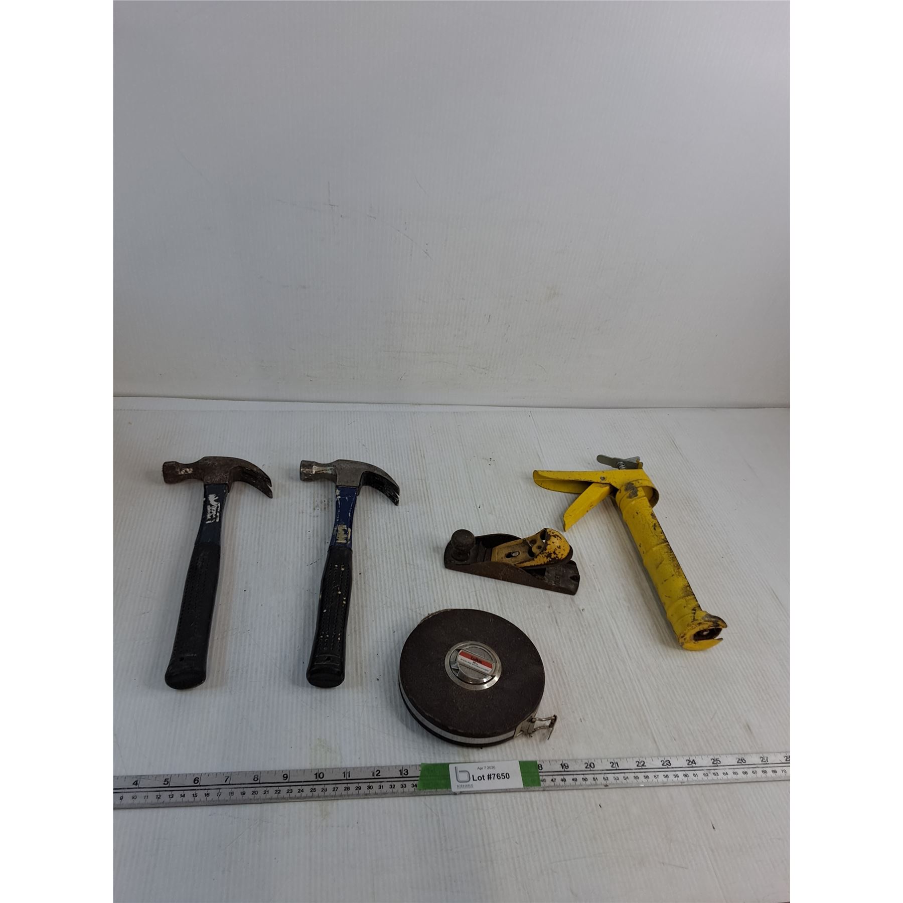 Lot 7650 Vintage Two-Tone Block Plane, (2) Hammers, Tape Measure, Manual Caulking Gun