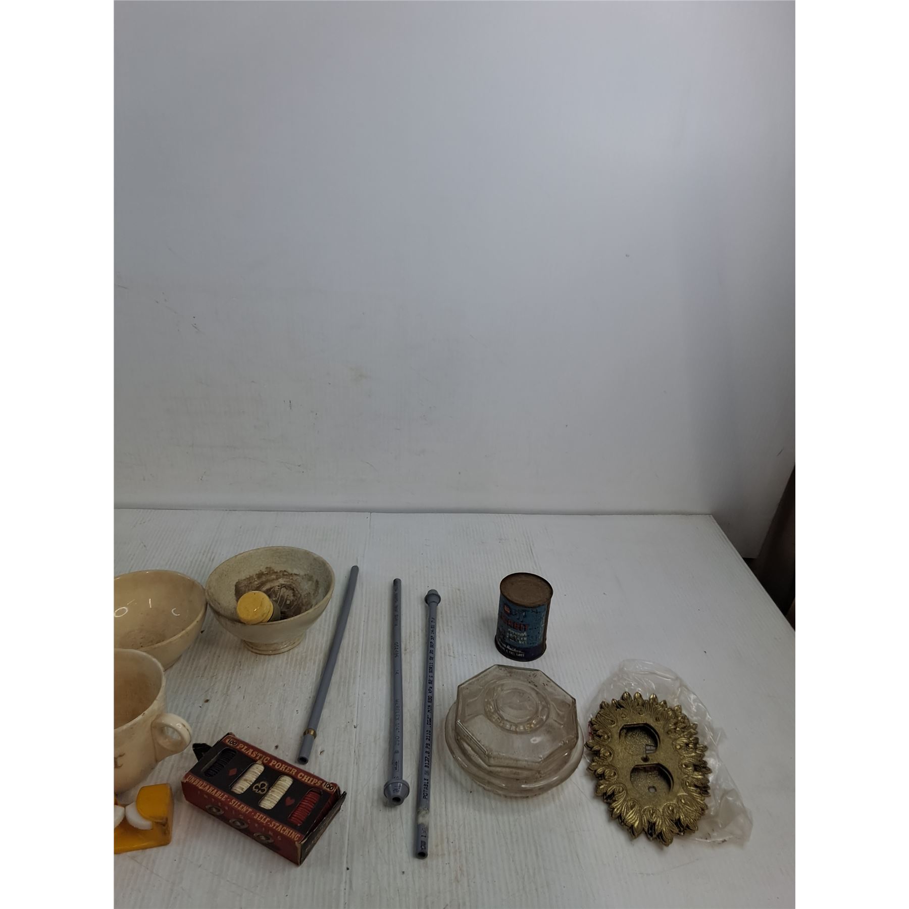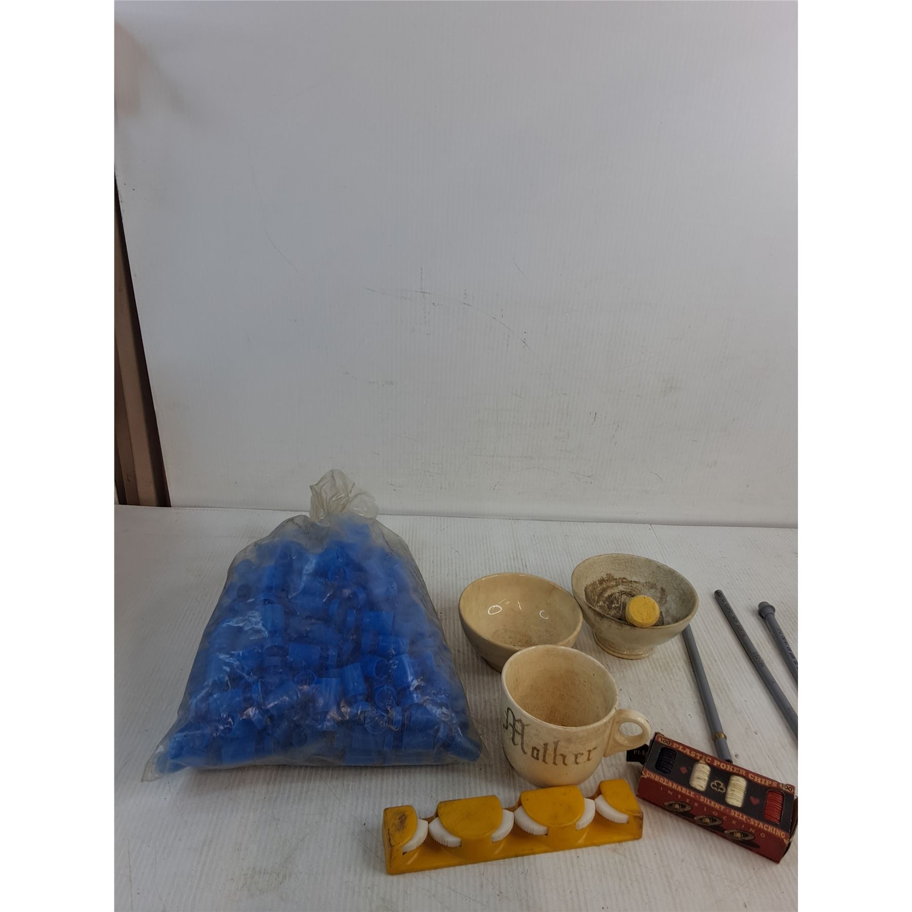 Lot 7677 Mug, Bowls, Plastic Poker Chips, Decorative Outlet Covers, Misc
