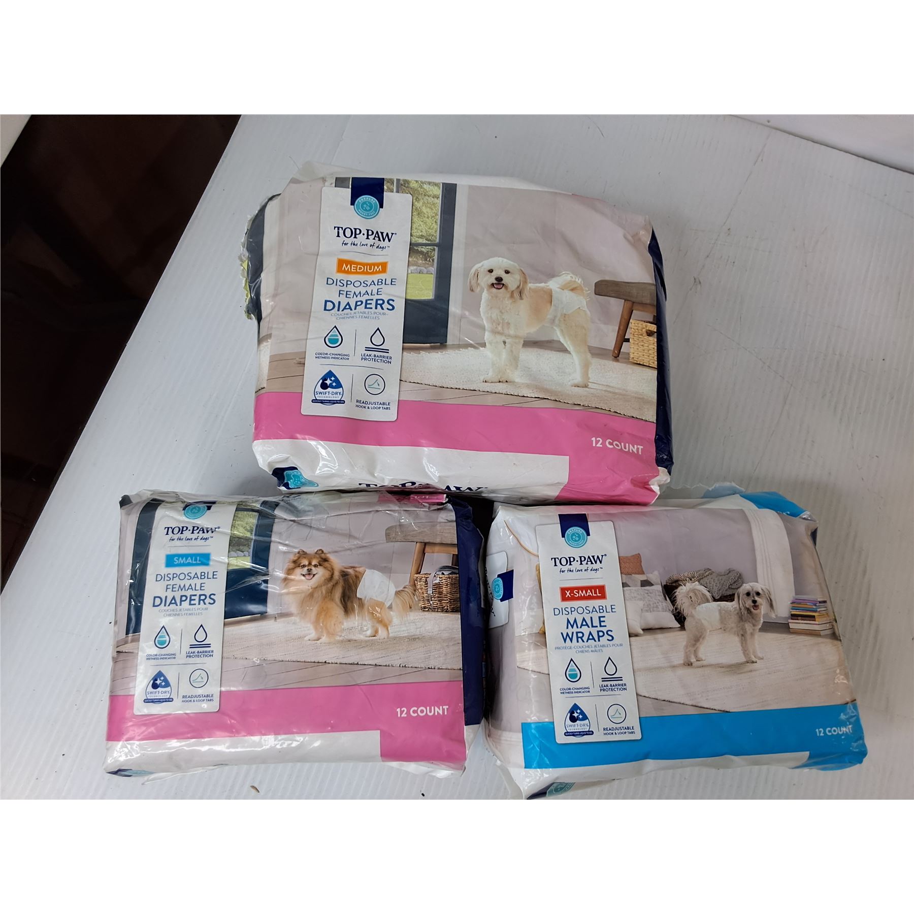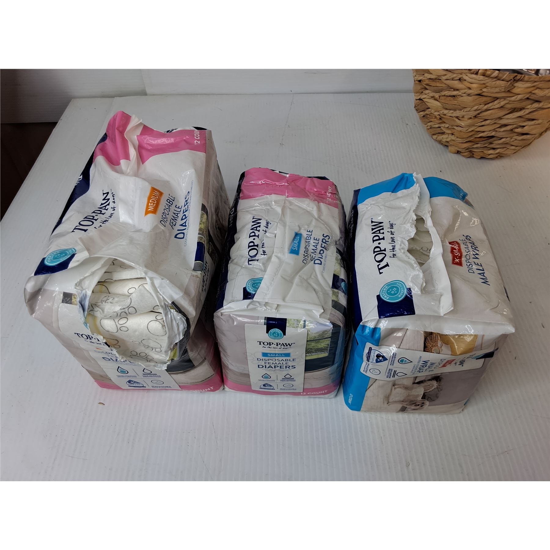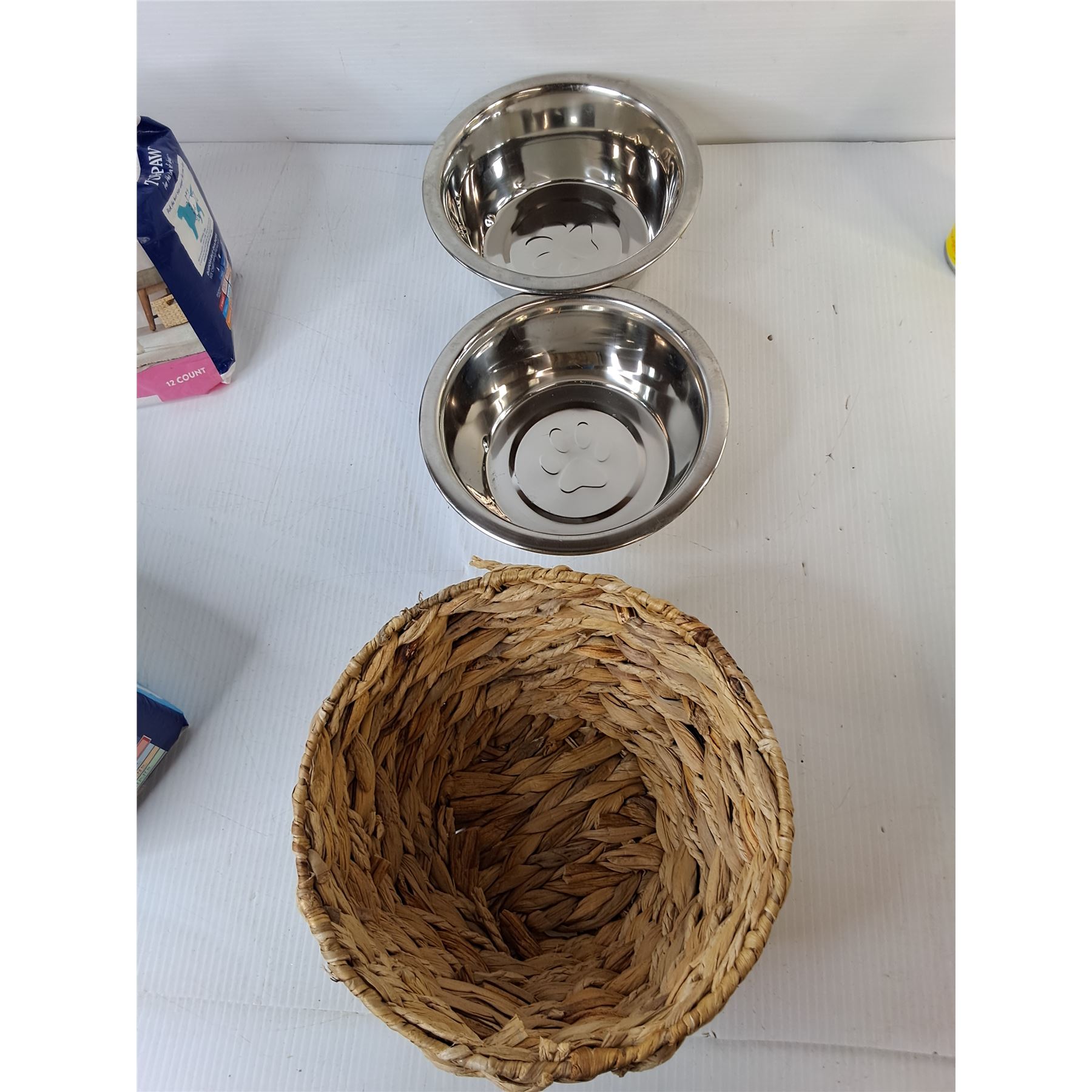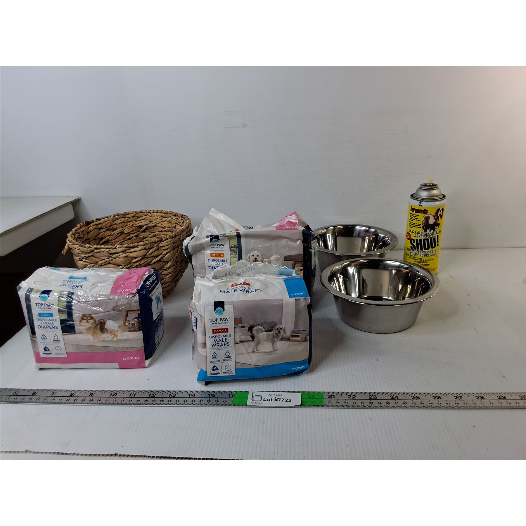 Lot 7722 Dog Diapers, Pet Repellant Training Spray, Pet Bowls, Wicker Basket 8.5" Diameter