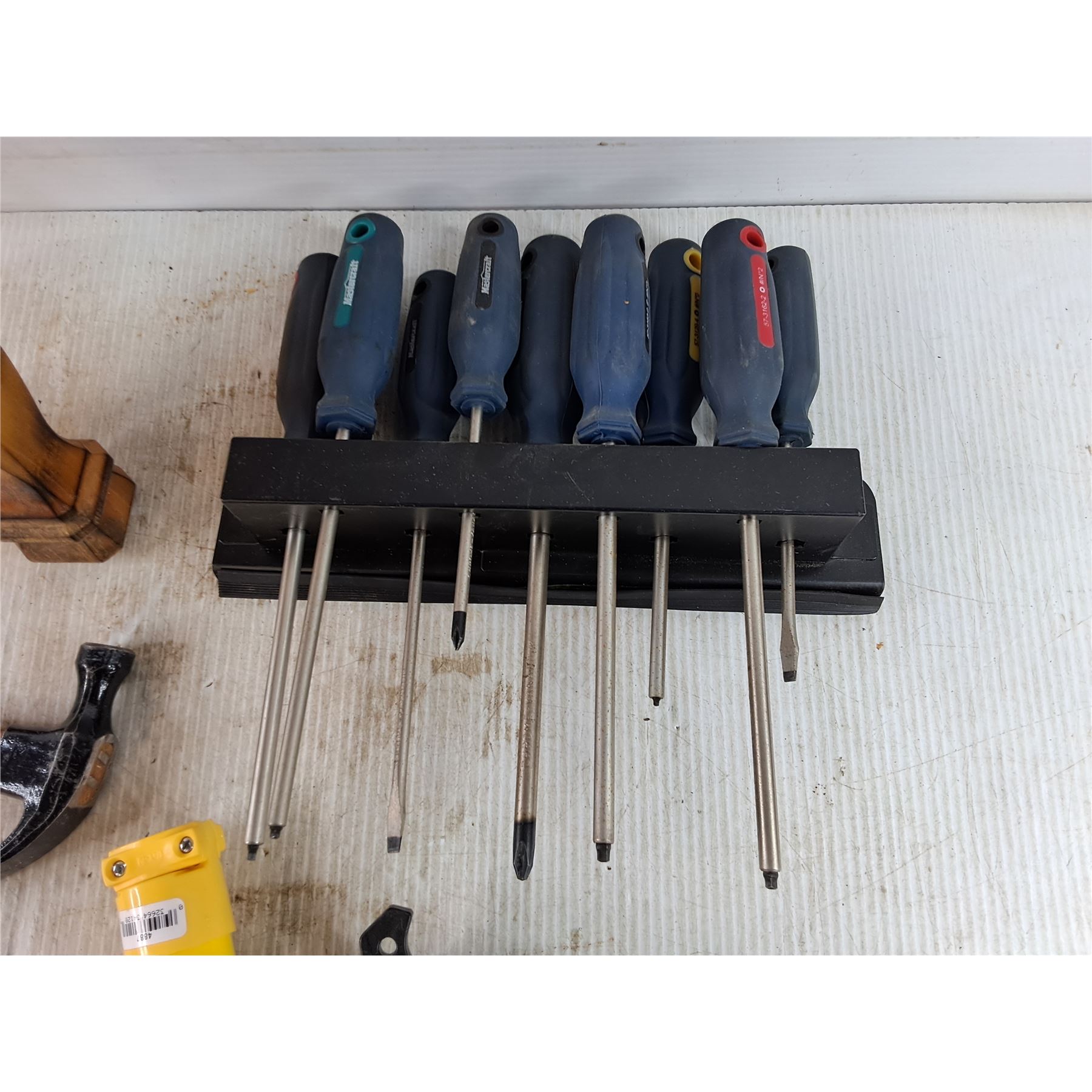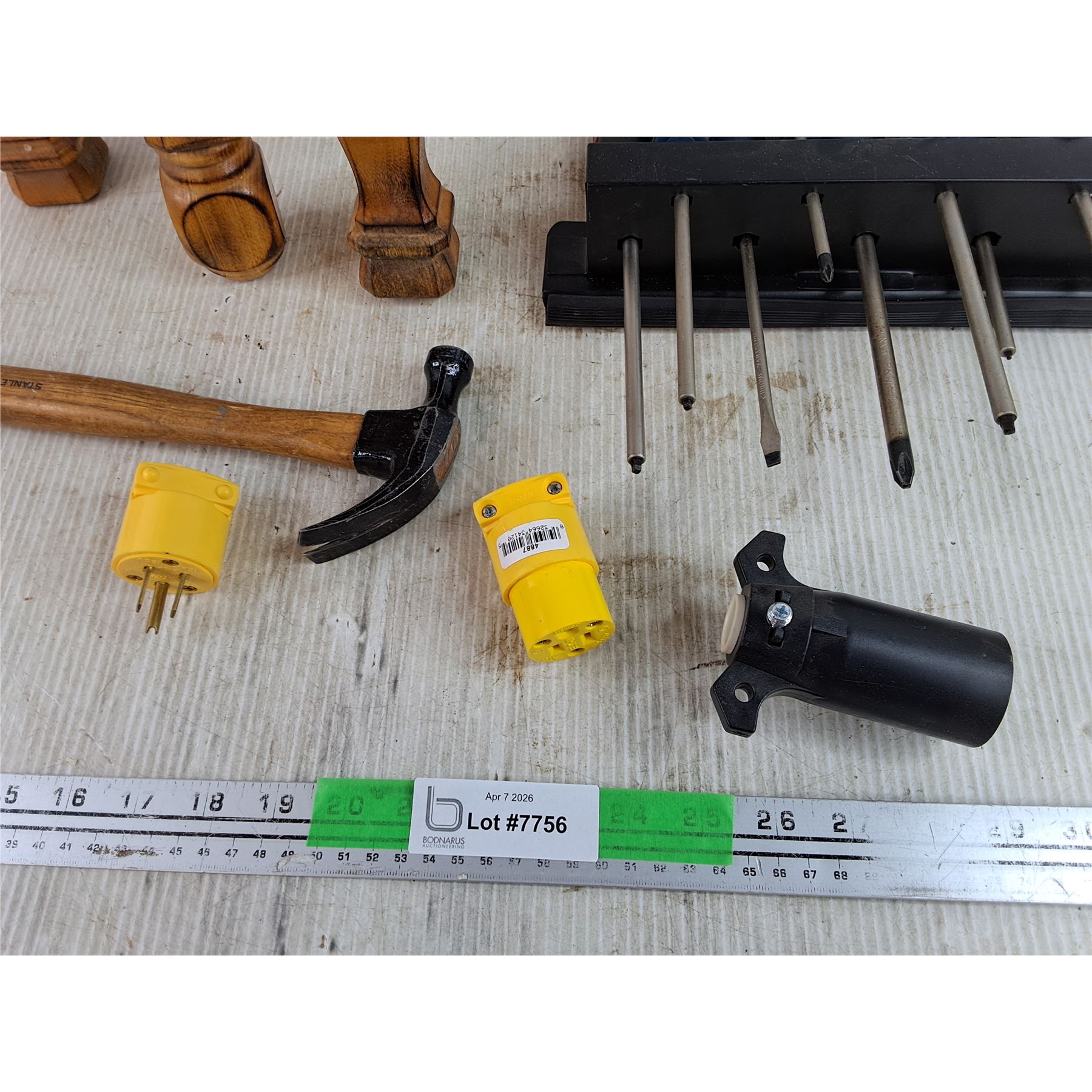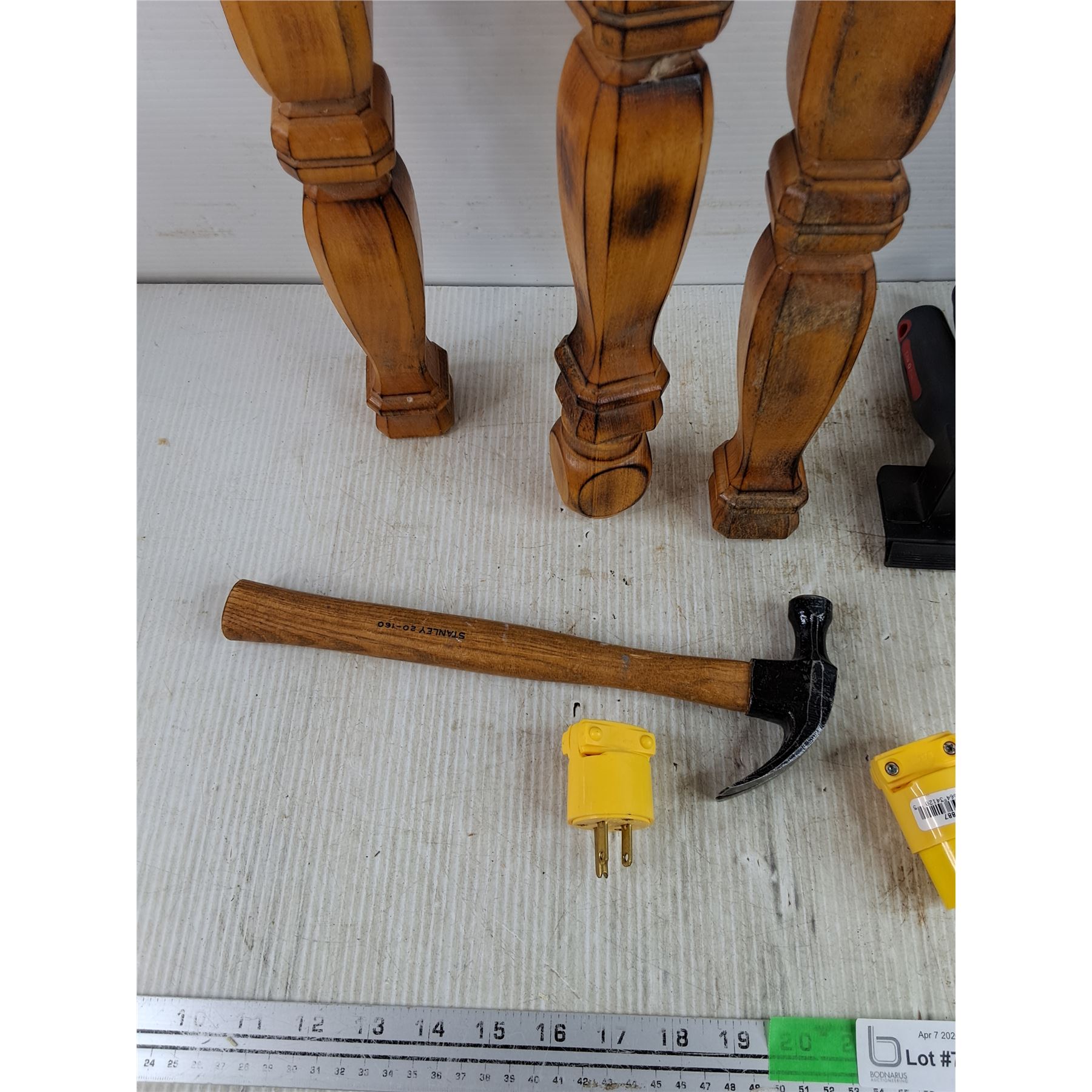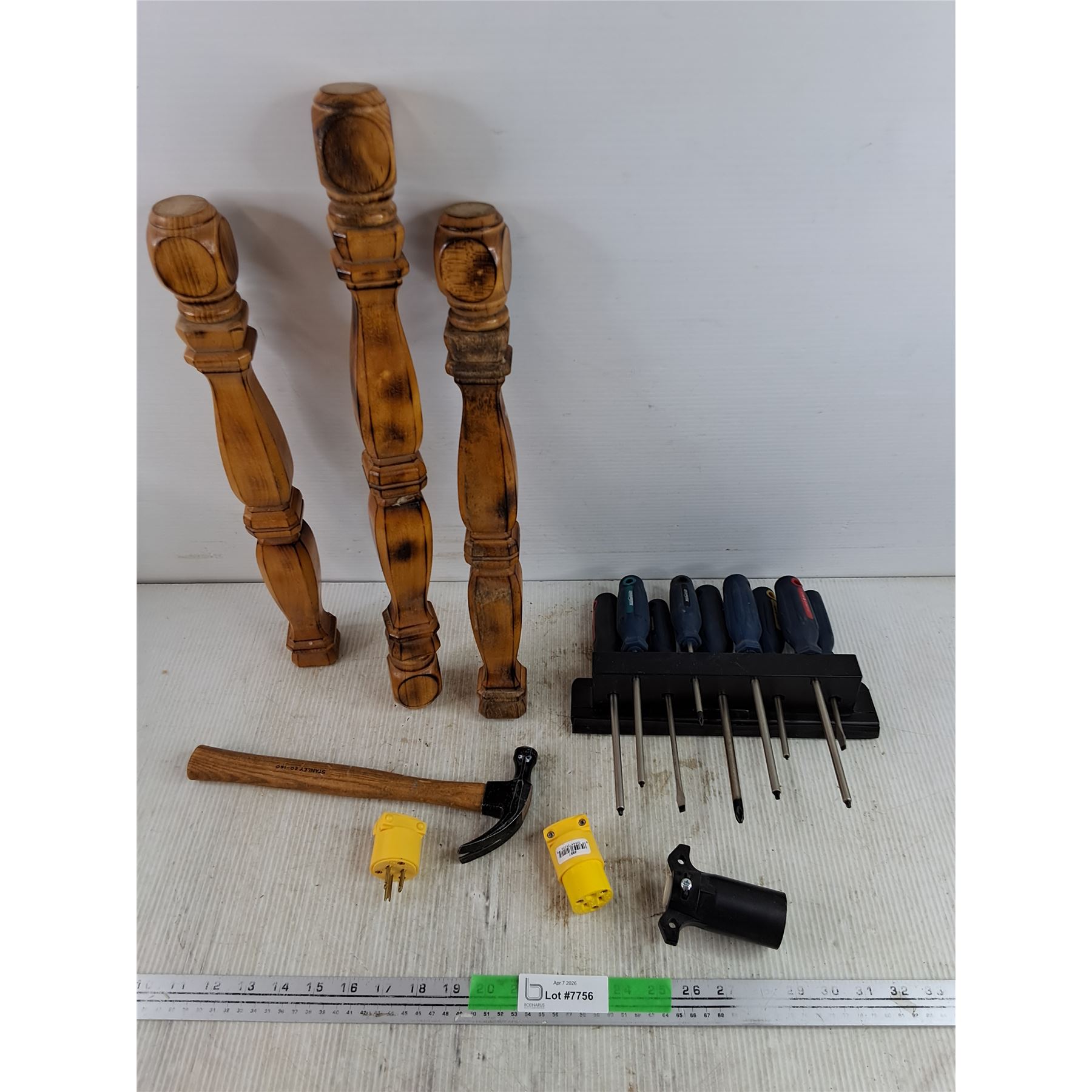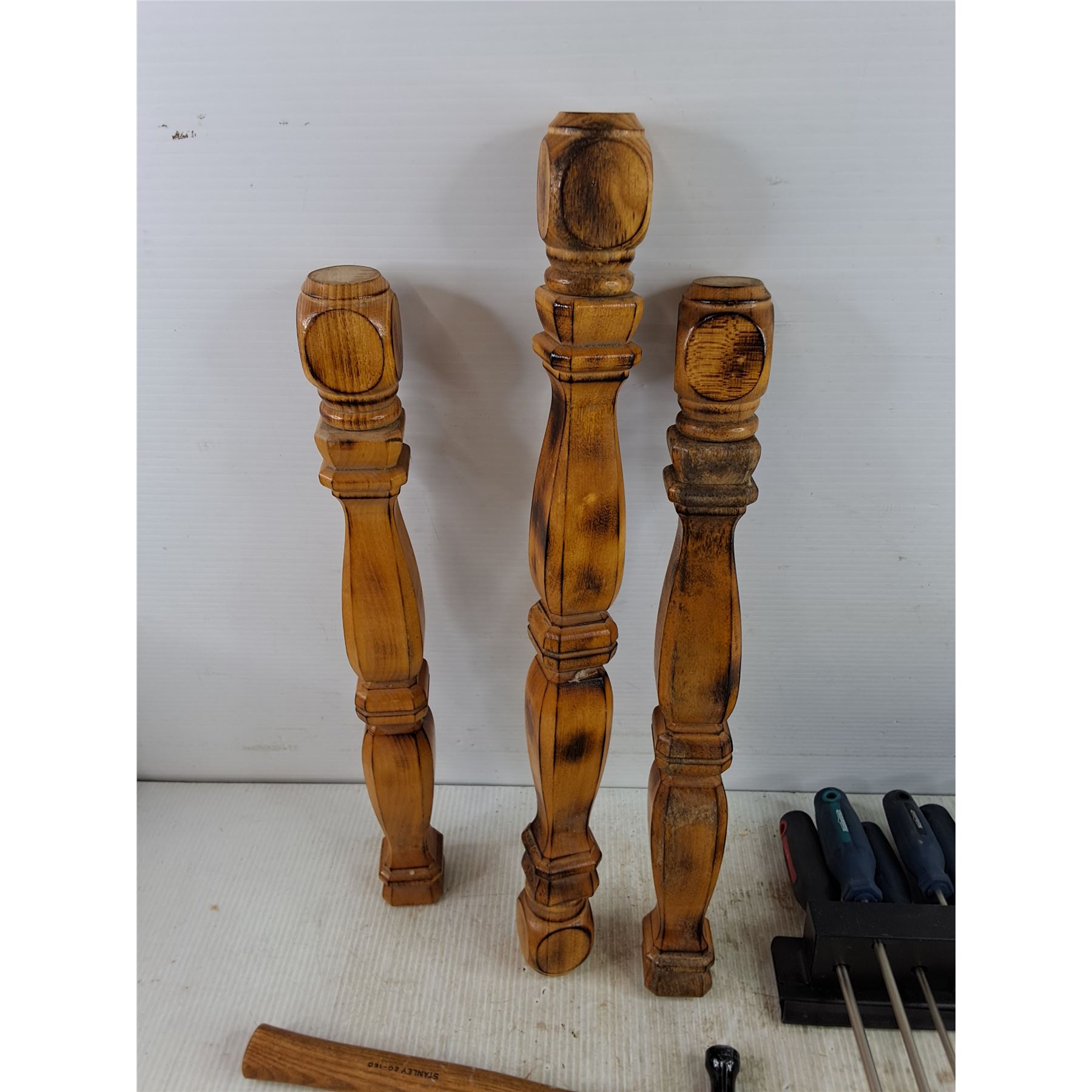 Lot 7756 (3) Wooden Furniture Legs 18" & 21", Screwdrivers, Magnetic Screwdriver Rack, Hammer & Plugs