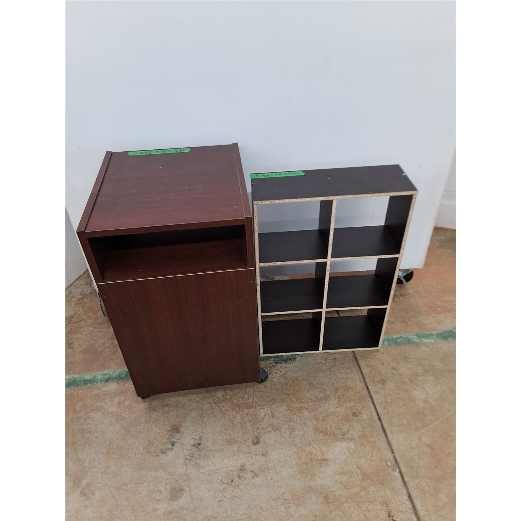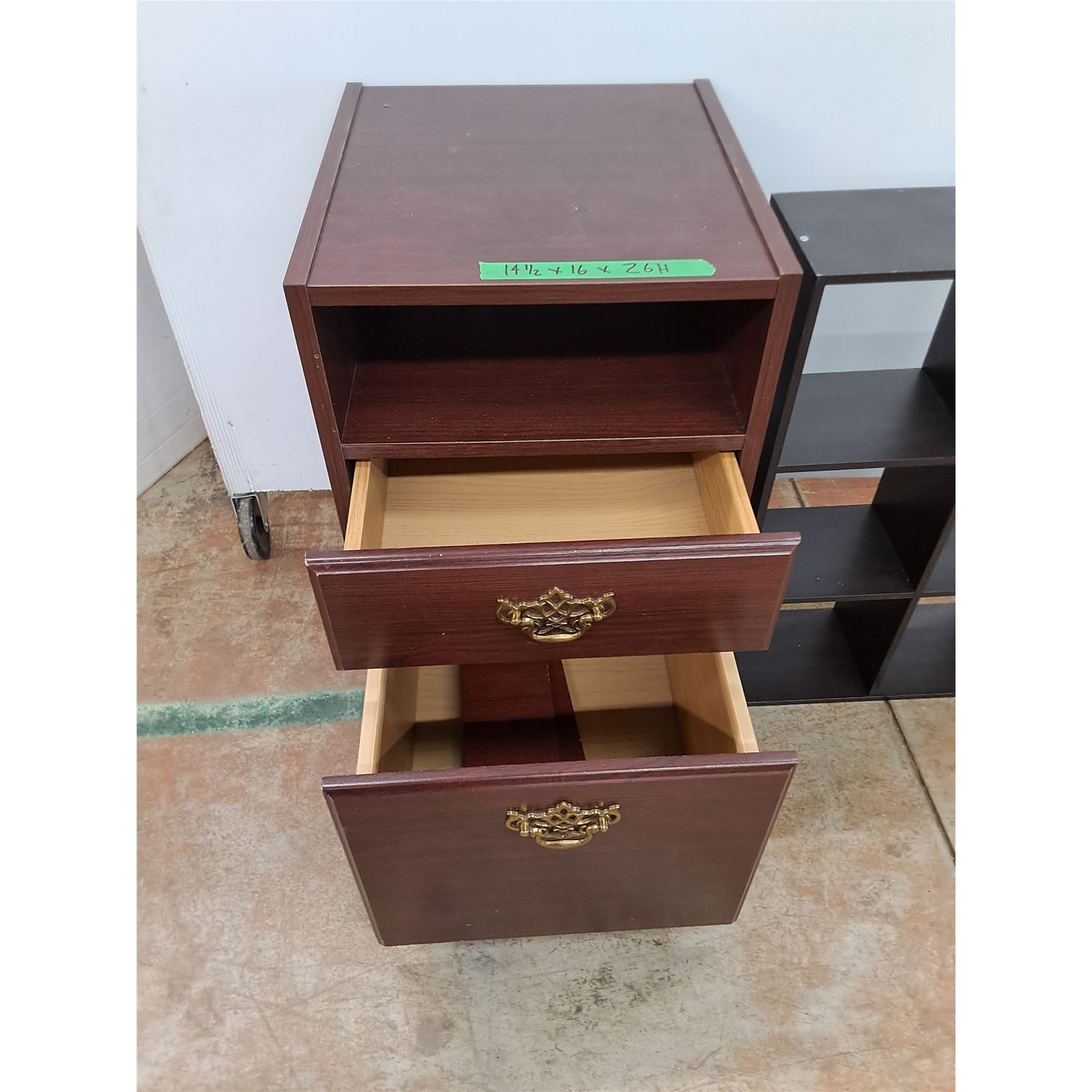 Lot 3043 * MDF 2-Drawer Night Stand on Casters - 15x16x26", MDF Display Shelf - Pickup Only