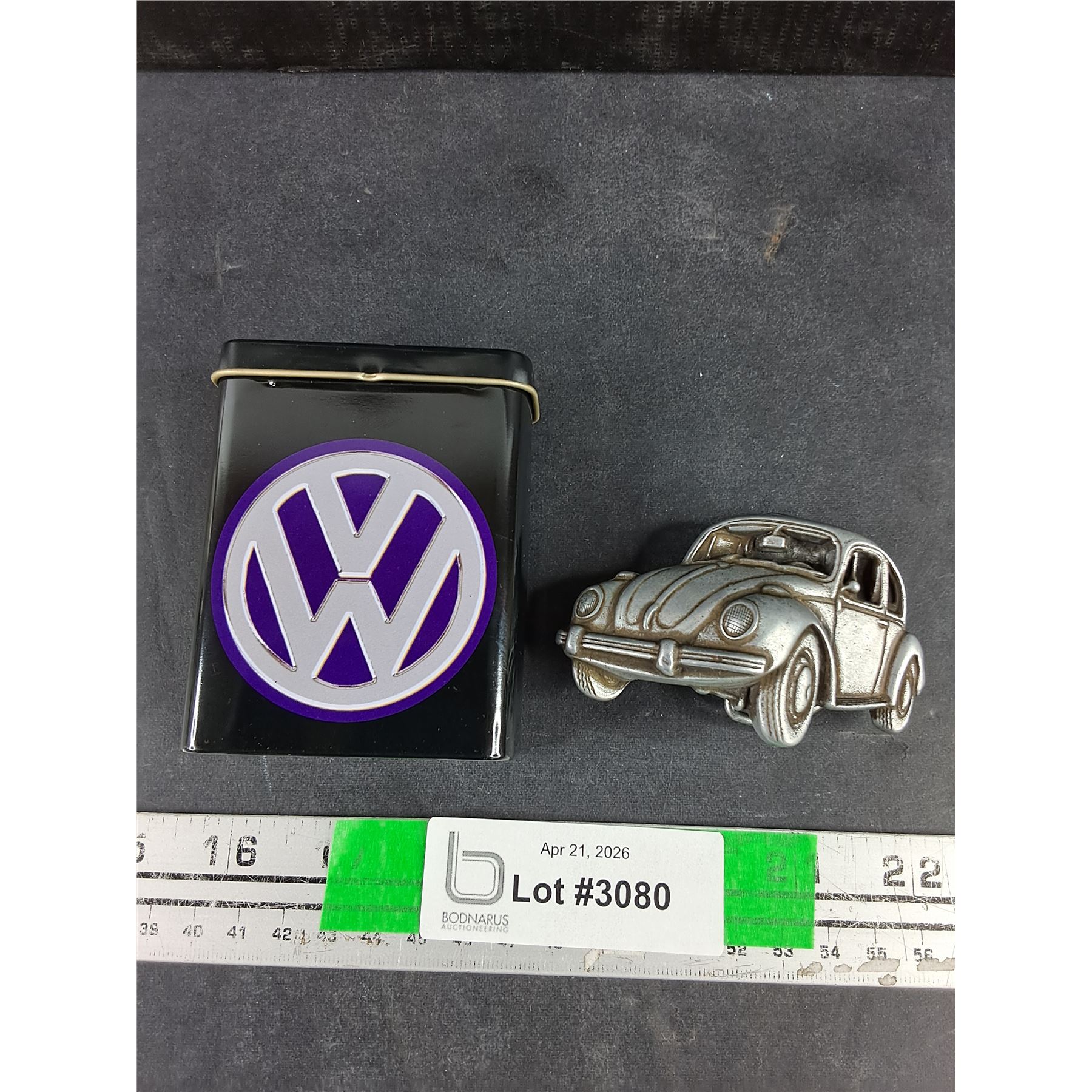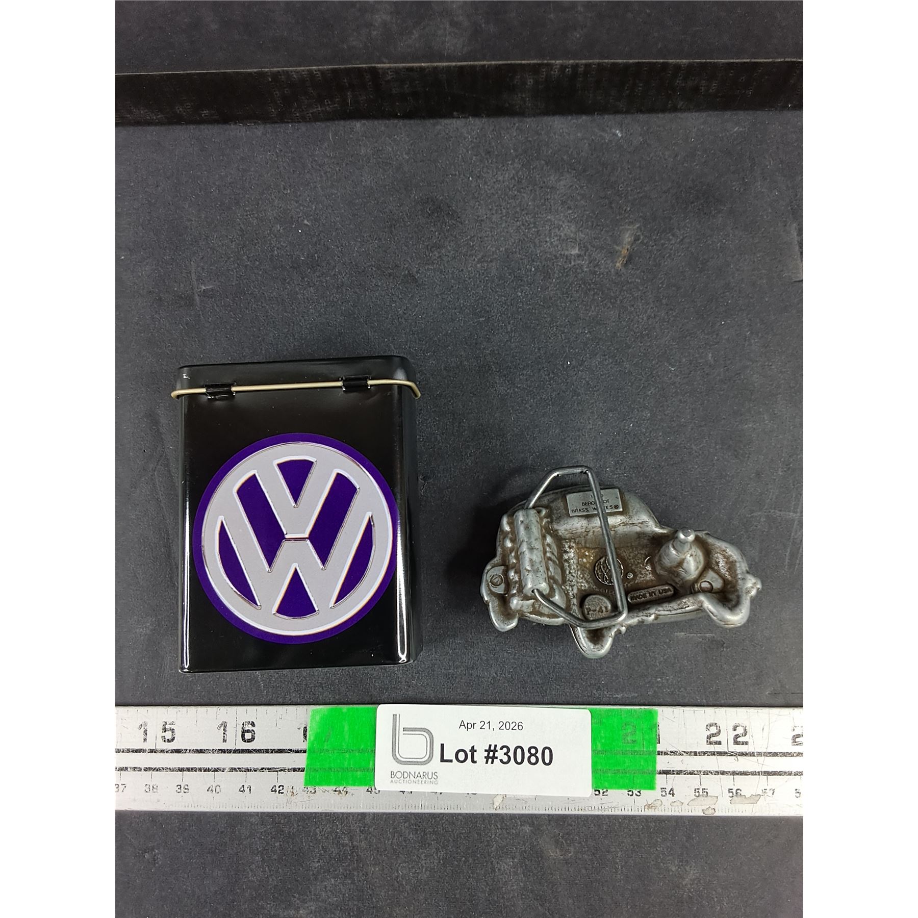 Lot 3080 Volkswagen Pocket Tobacco Can, VW Beetle Belt Buckle