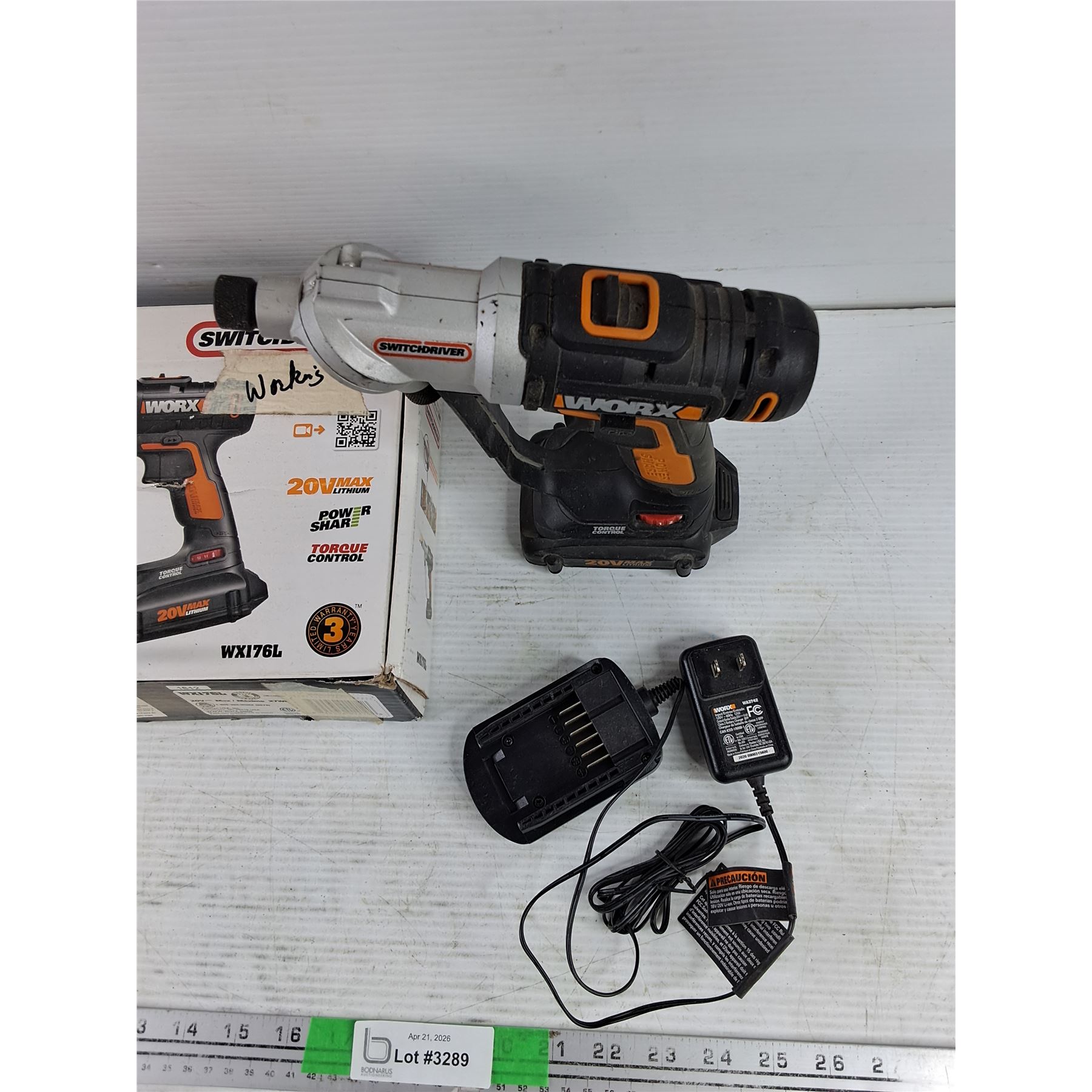 Lot 3289 SwitchDriver Worx 20V Cordless Drill/Driver w/Battery & Charger - Powers On, As Is