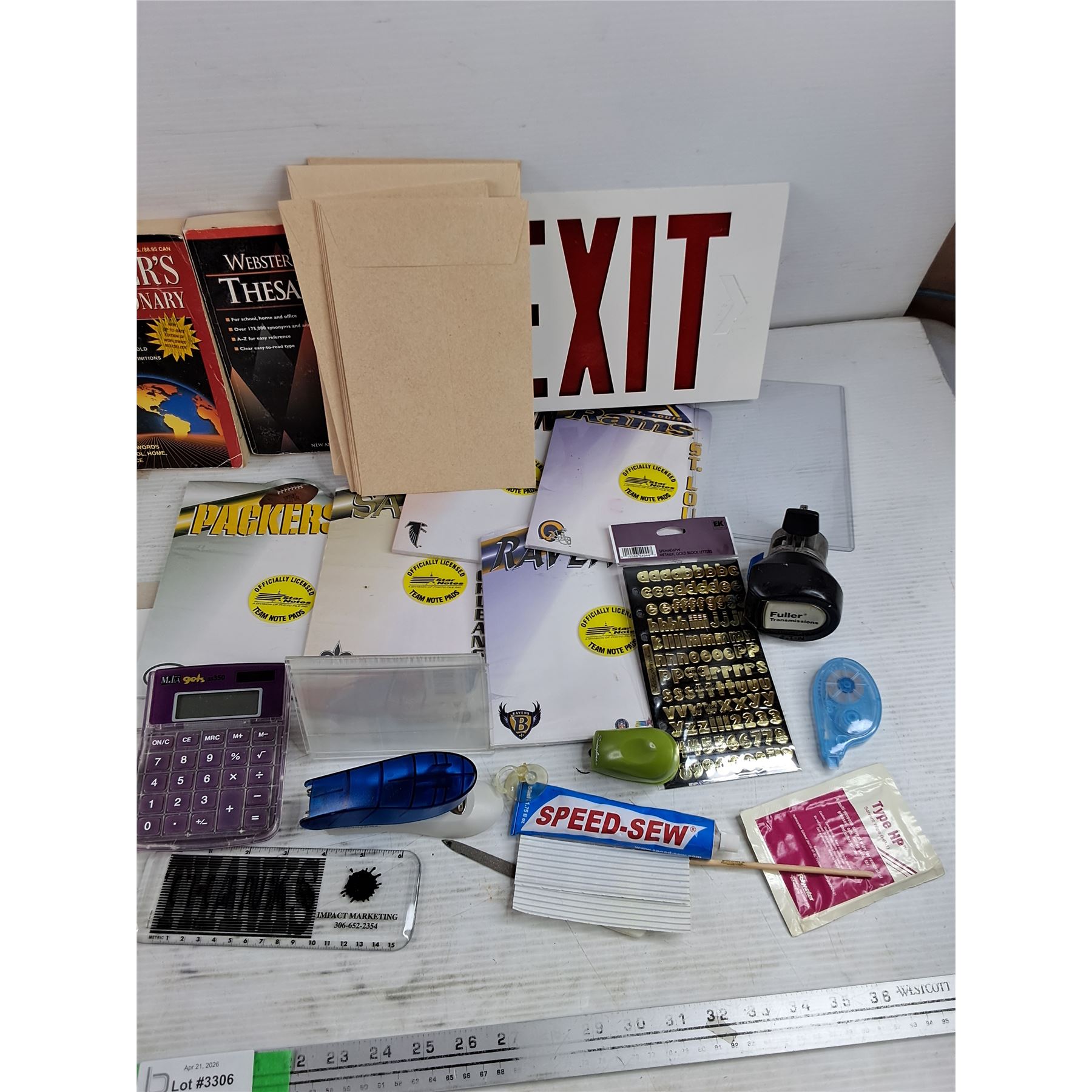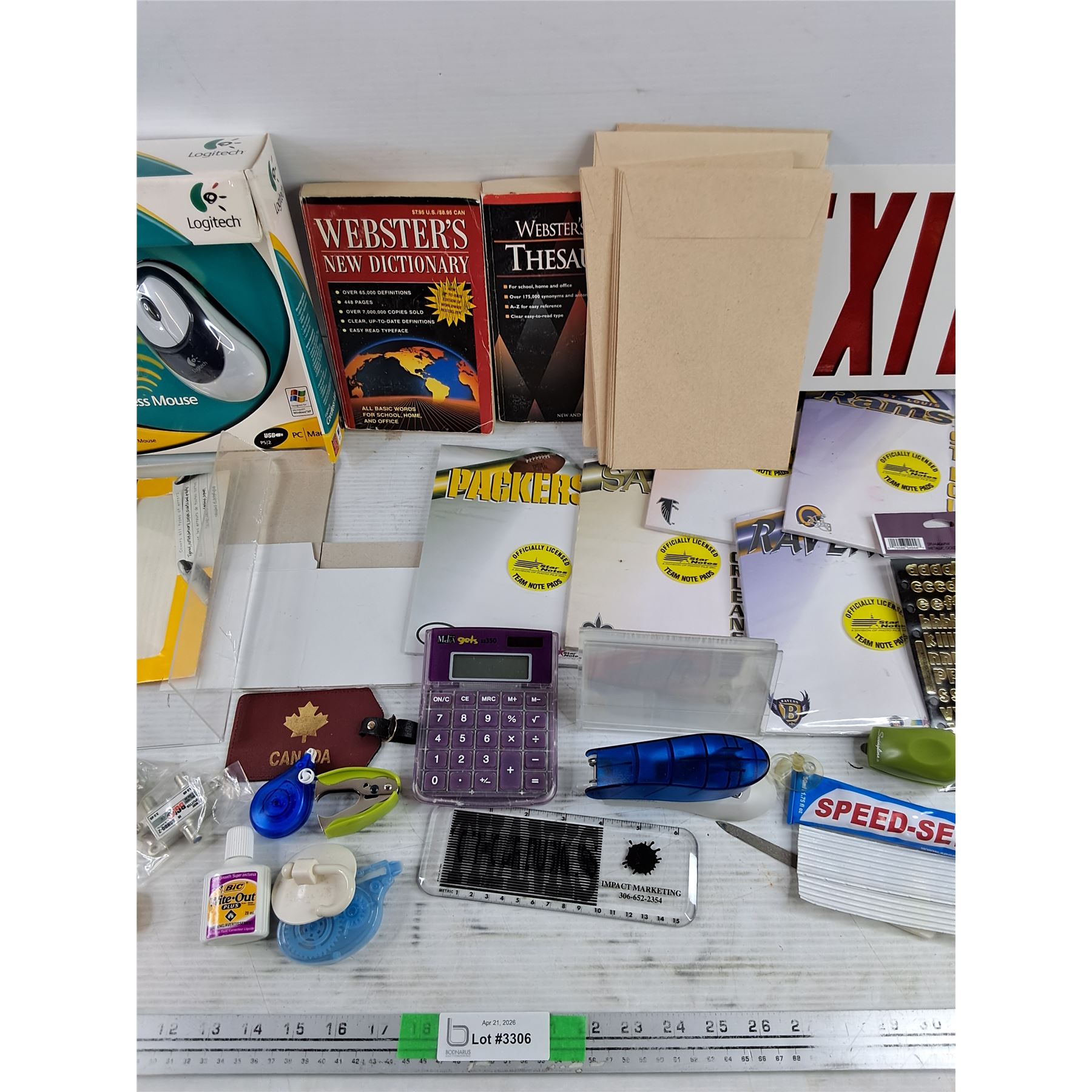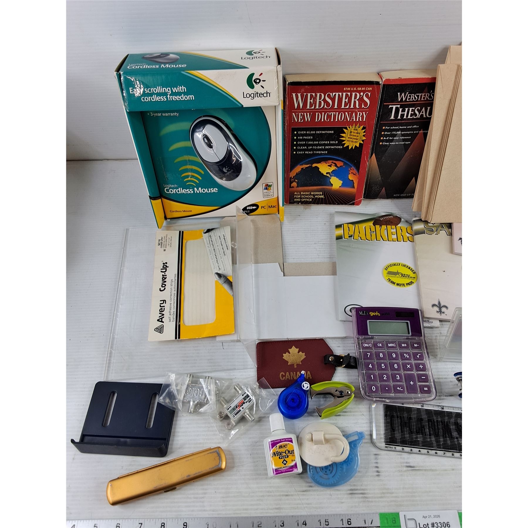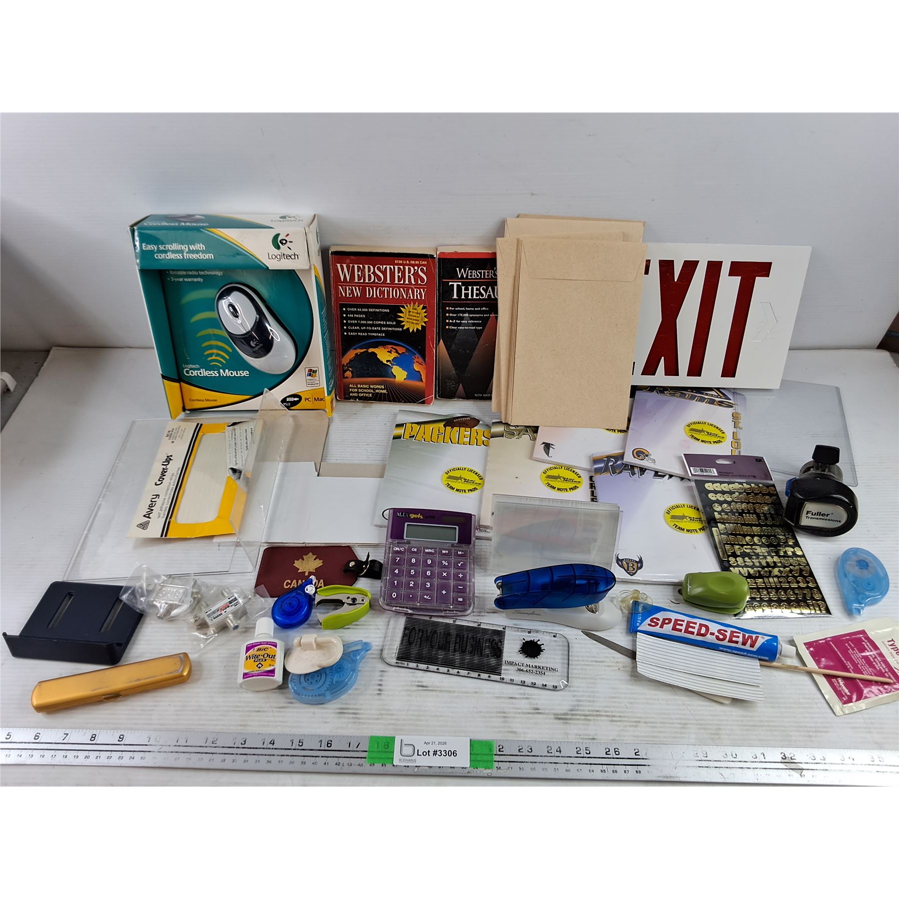 Lot 3306 Logitech Cordless Mouse, Websters Dictionary, Envelopes, Exit Sign, Stapler, Misc