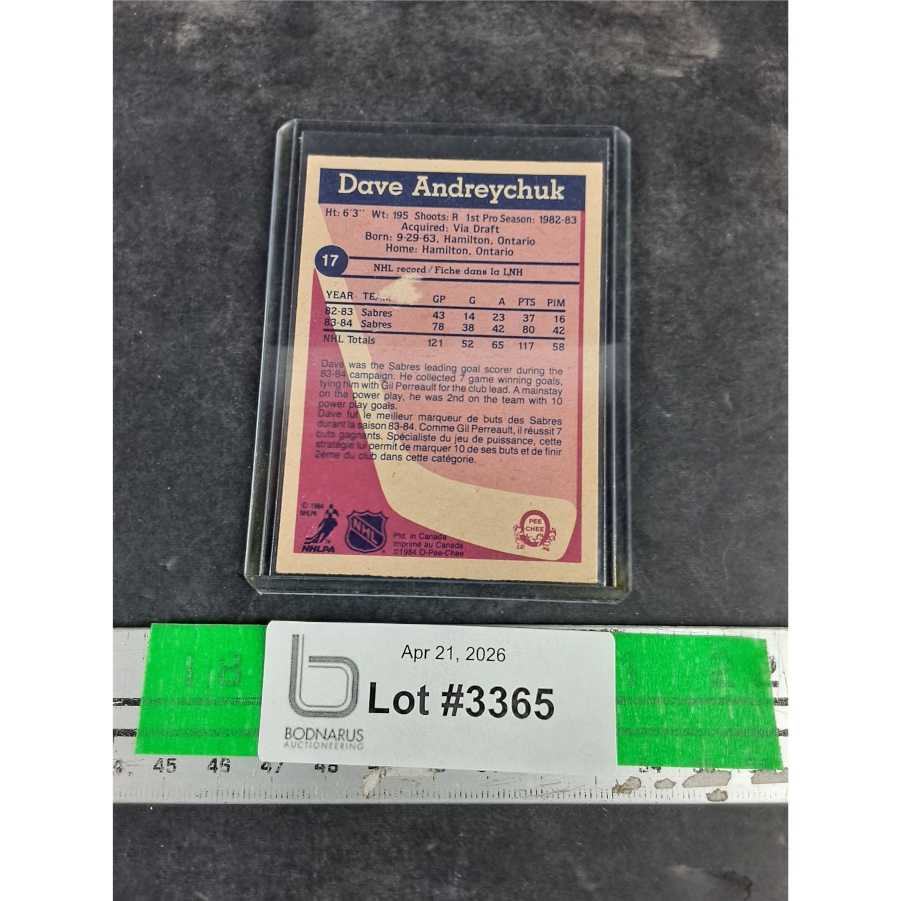 Lot 3365 Vintage O Pee Chee Dave Andreychuk Sabres Trading Hockey Card - CANNOT AUTHENTICATE
