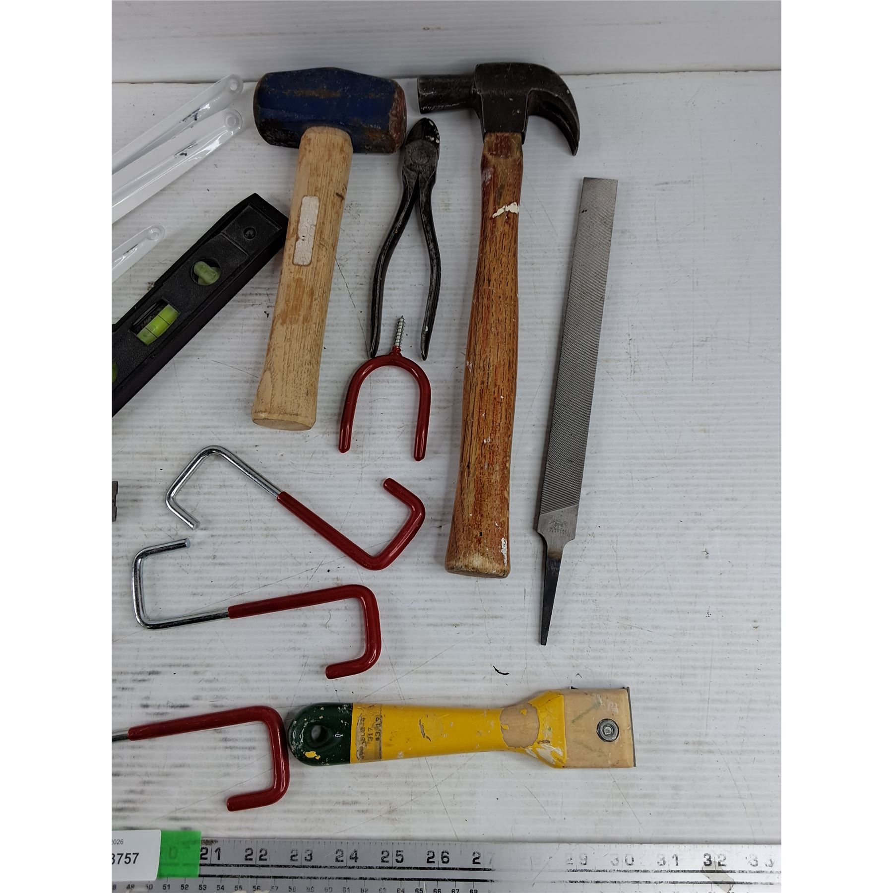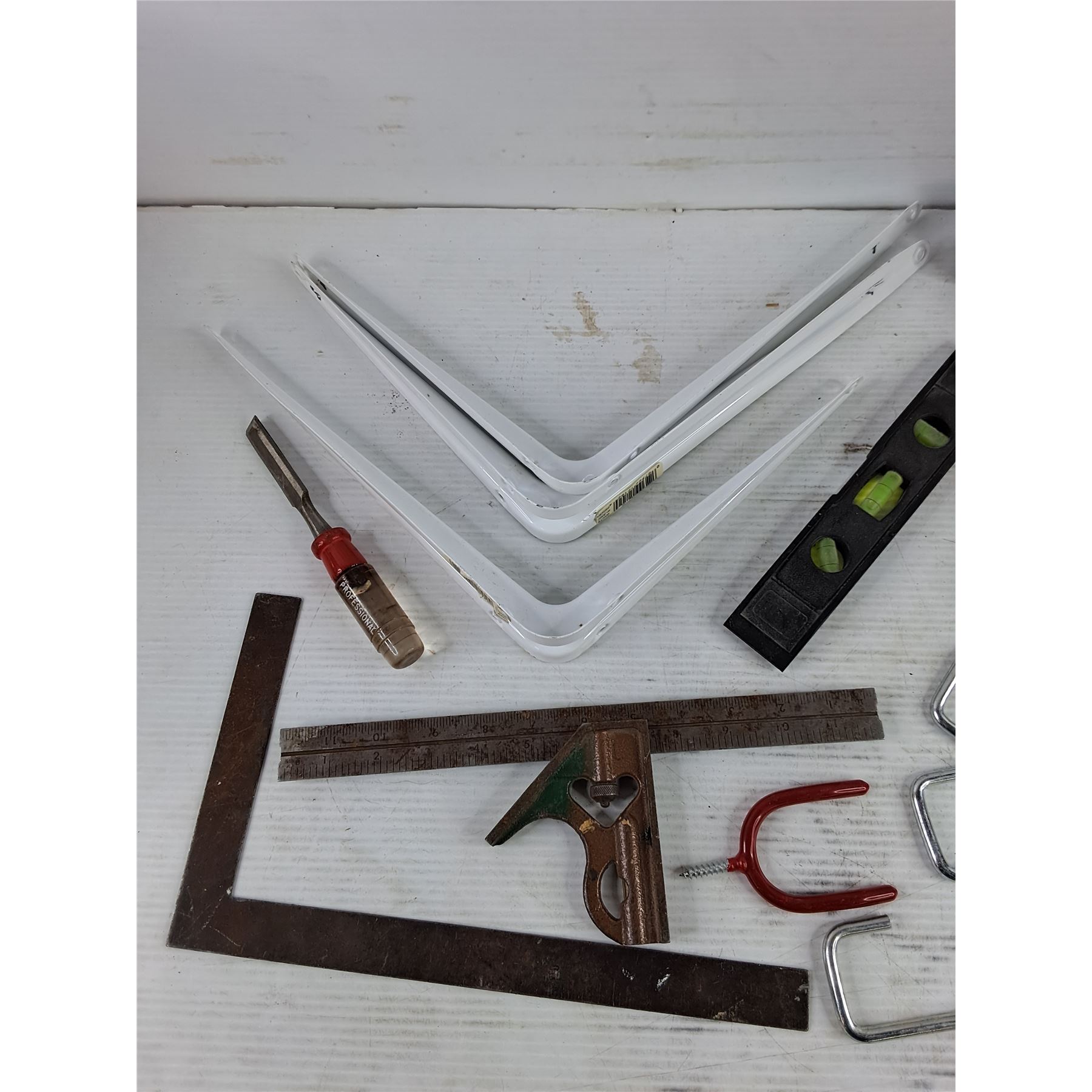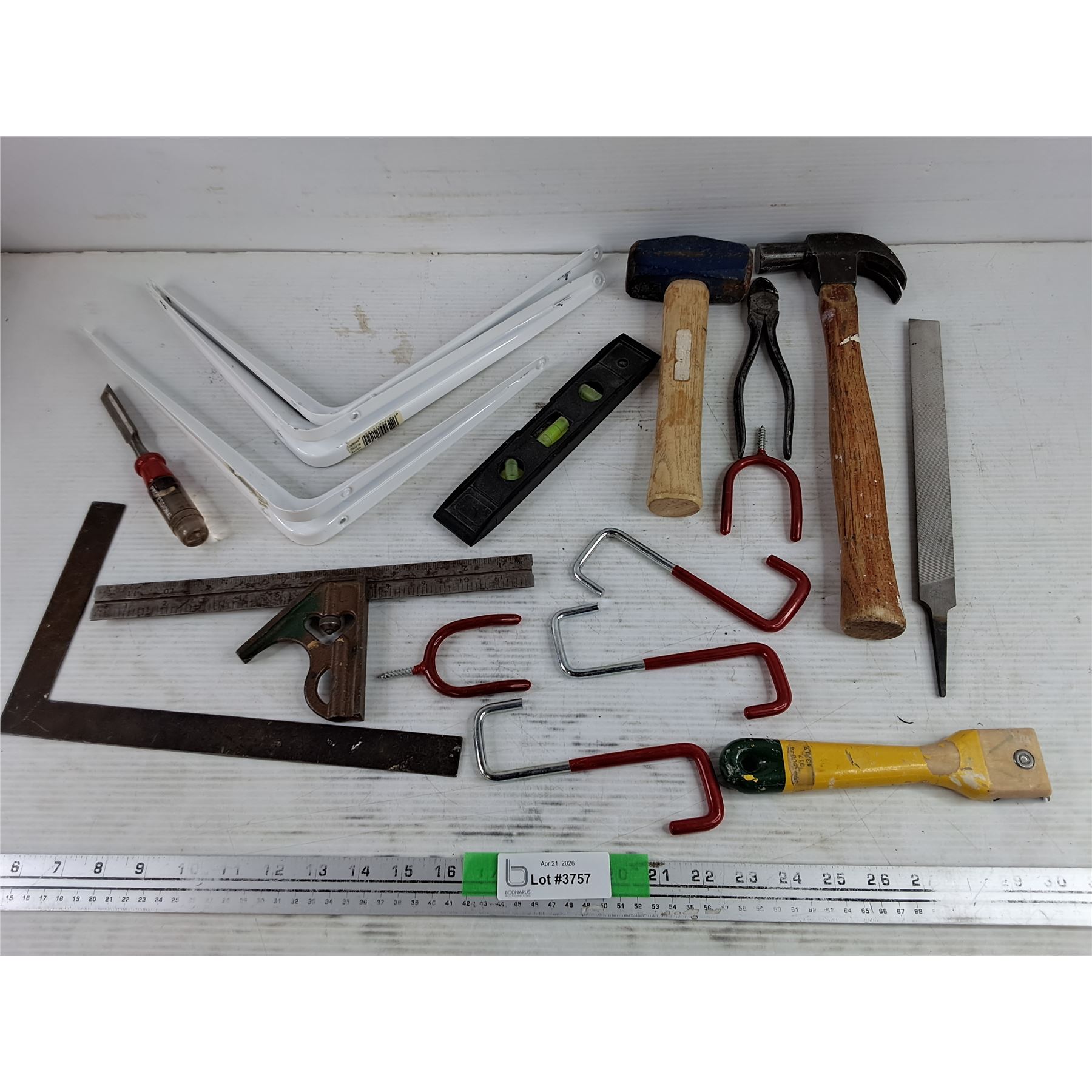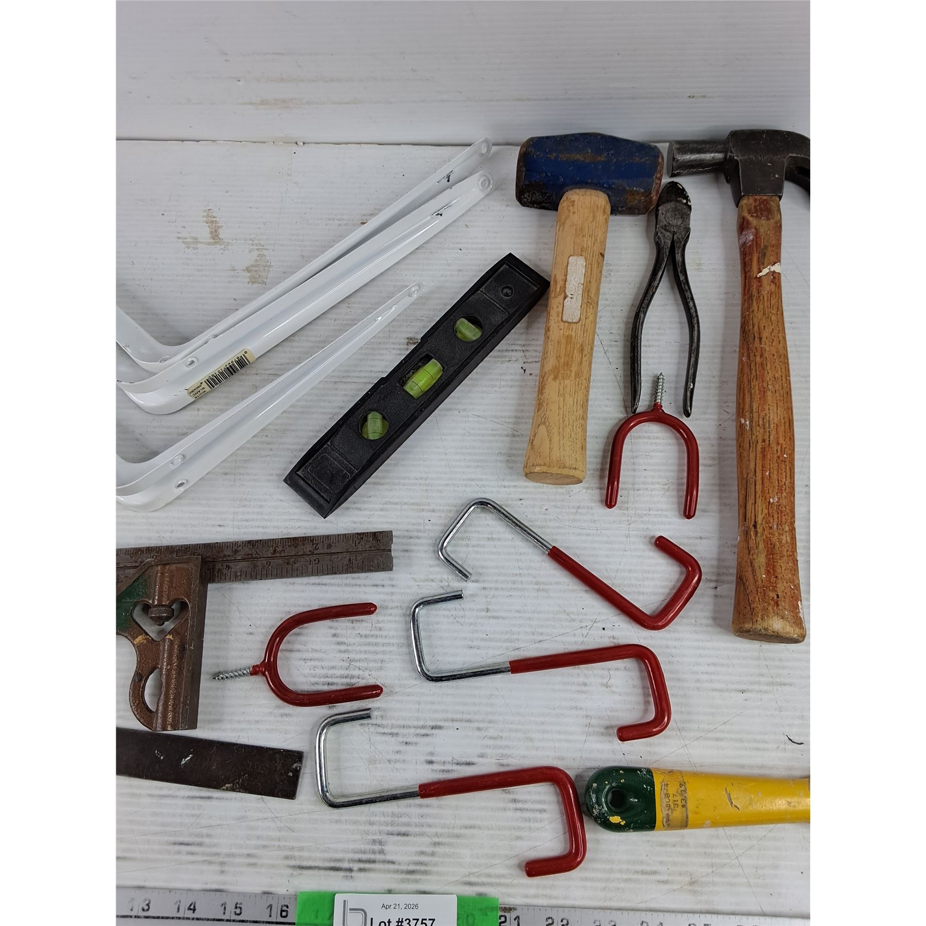 Lot 3757 Shelf Brackets 12" x 9", Hammer, Mallet, Scraper, Level, Square, Misc
