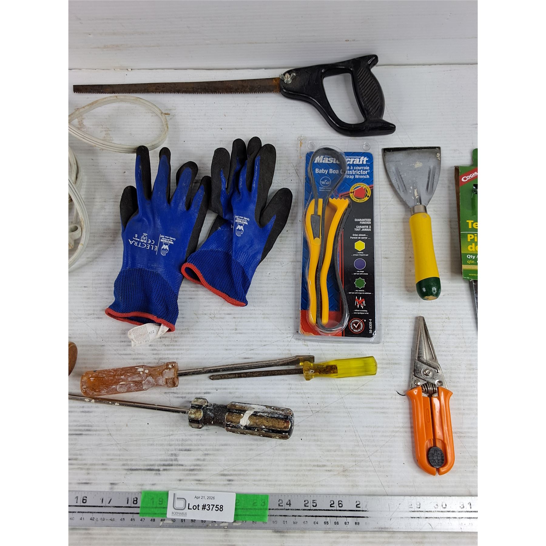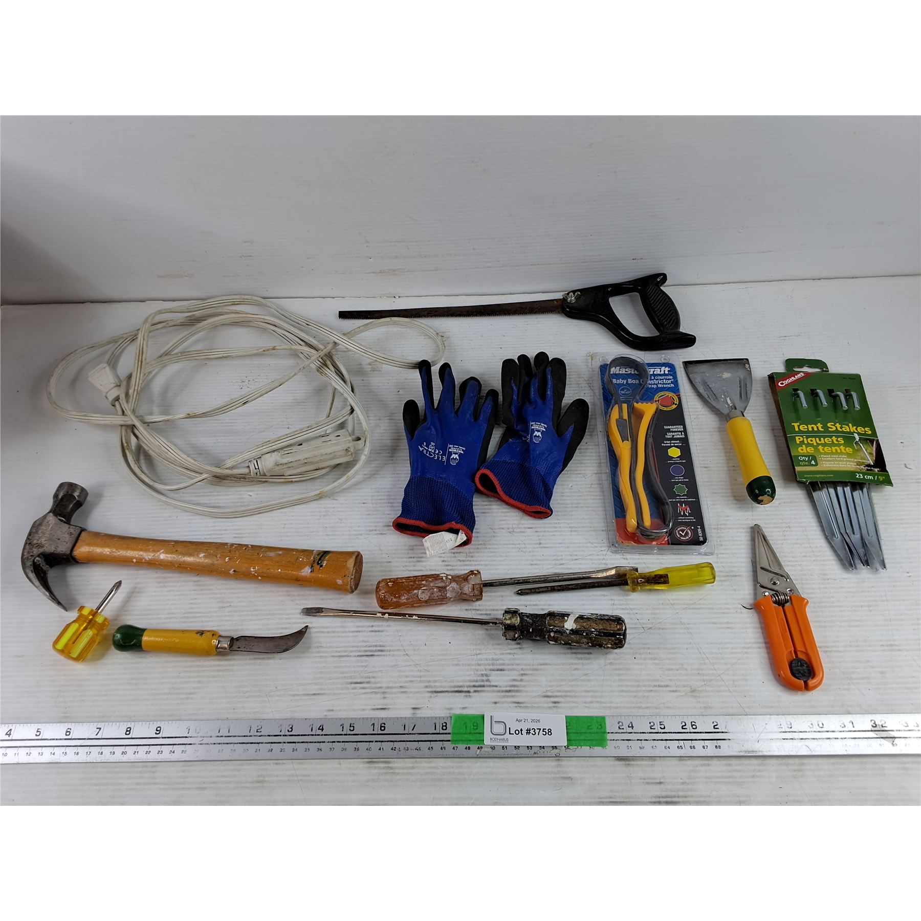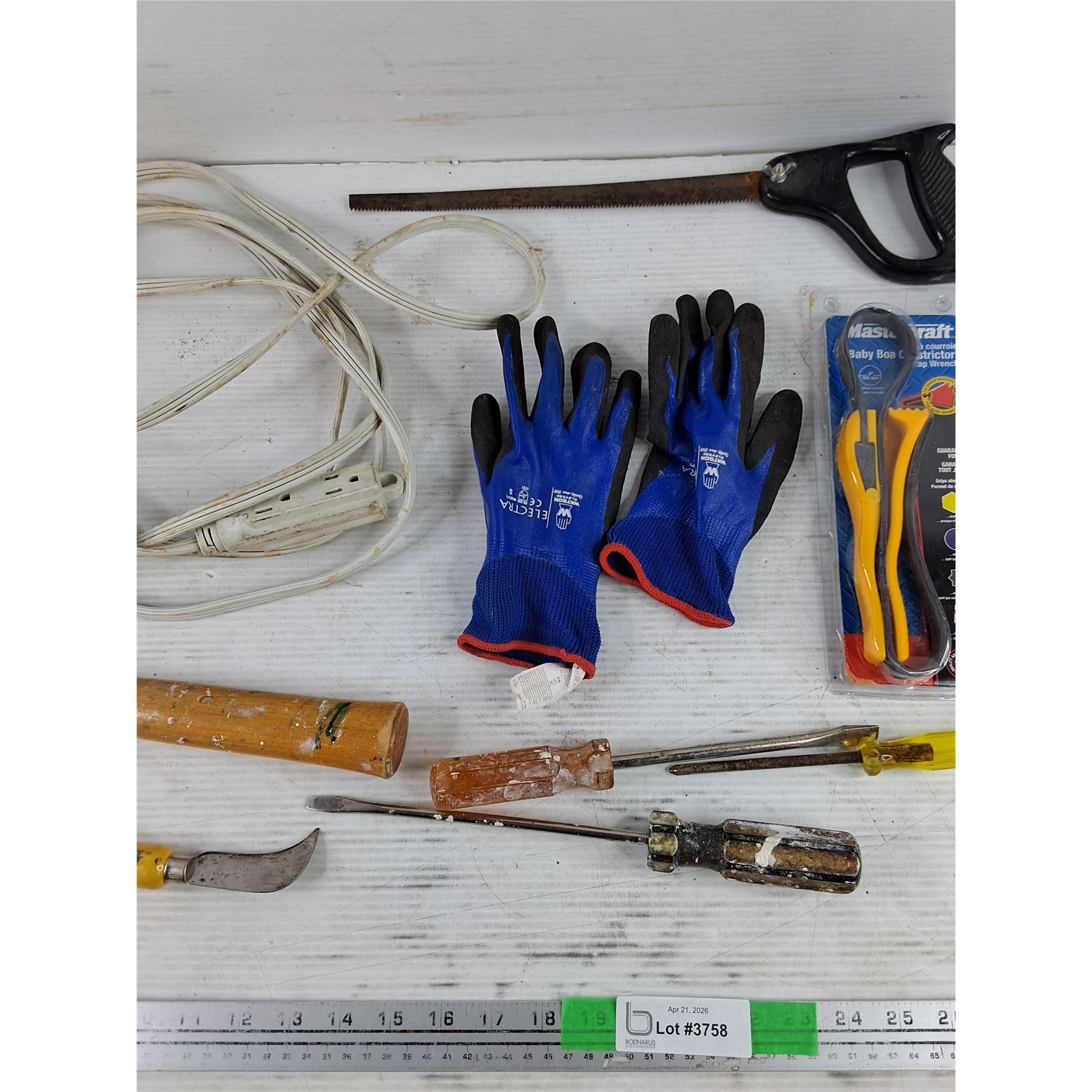 Lot 3758 Hole Saw, Hammer, Work Gloves, Strap Wrench, Extension Cord, Screwdrivers, Misc