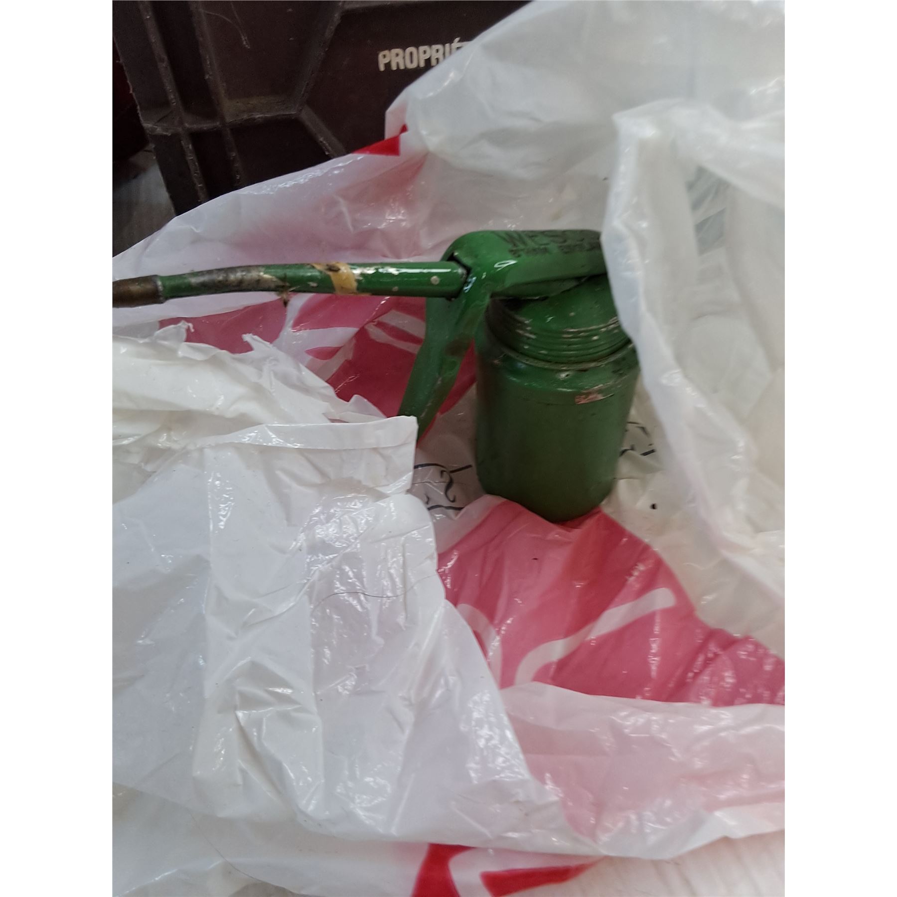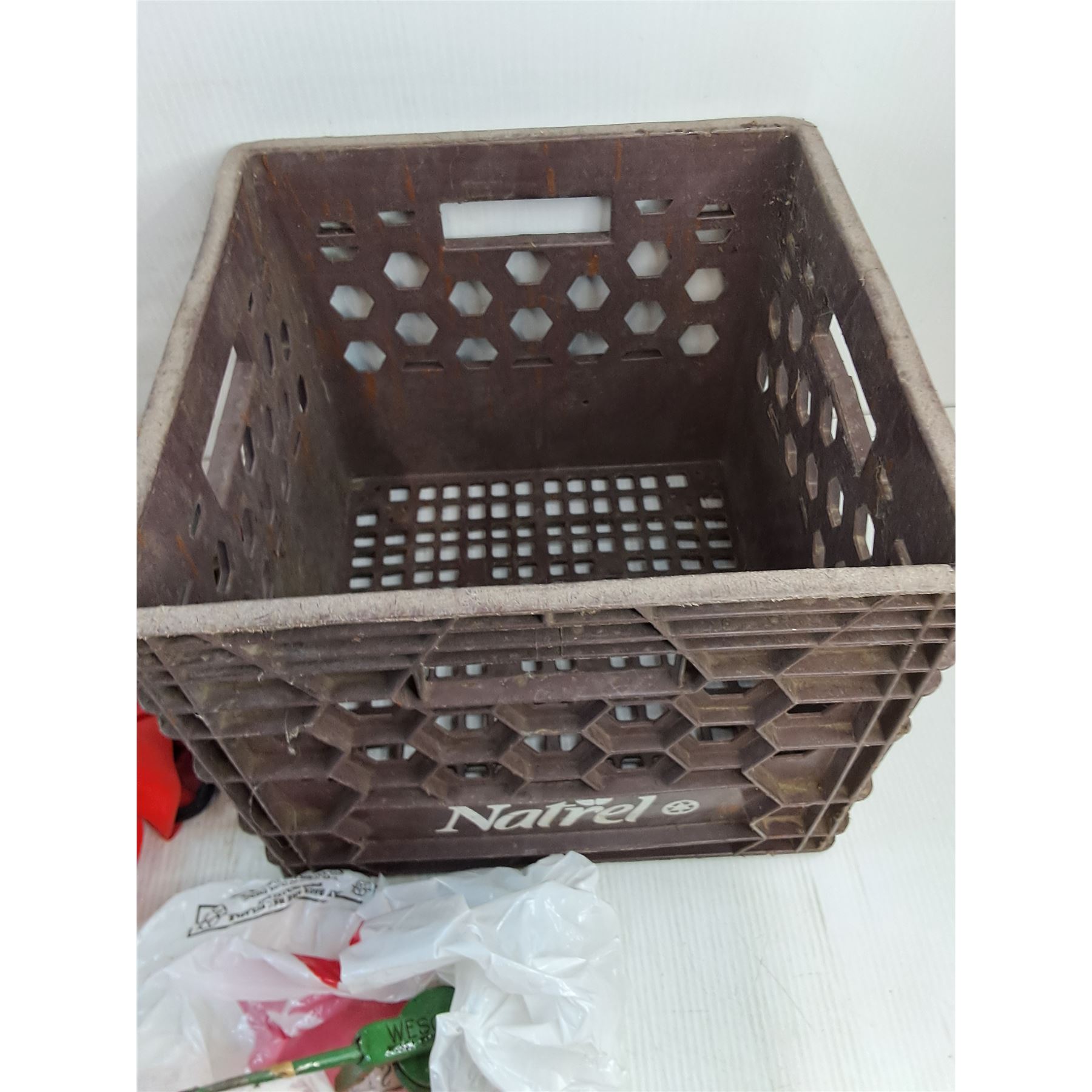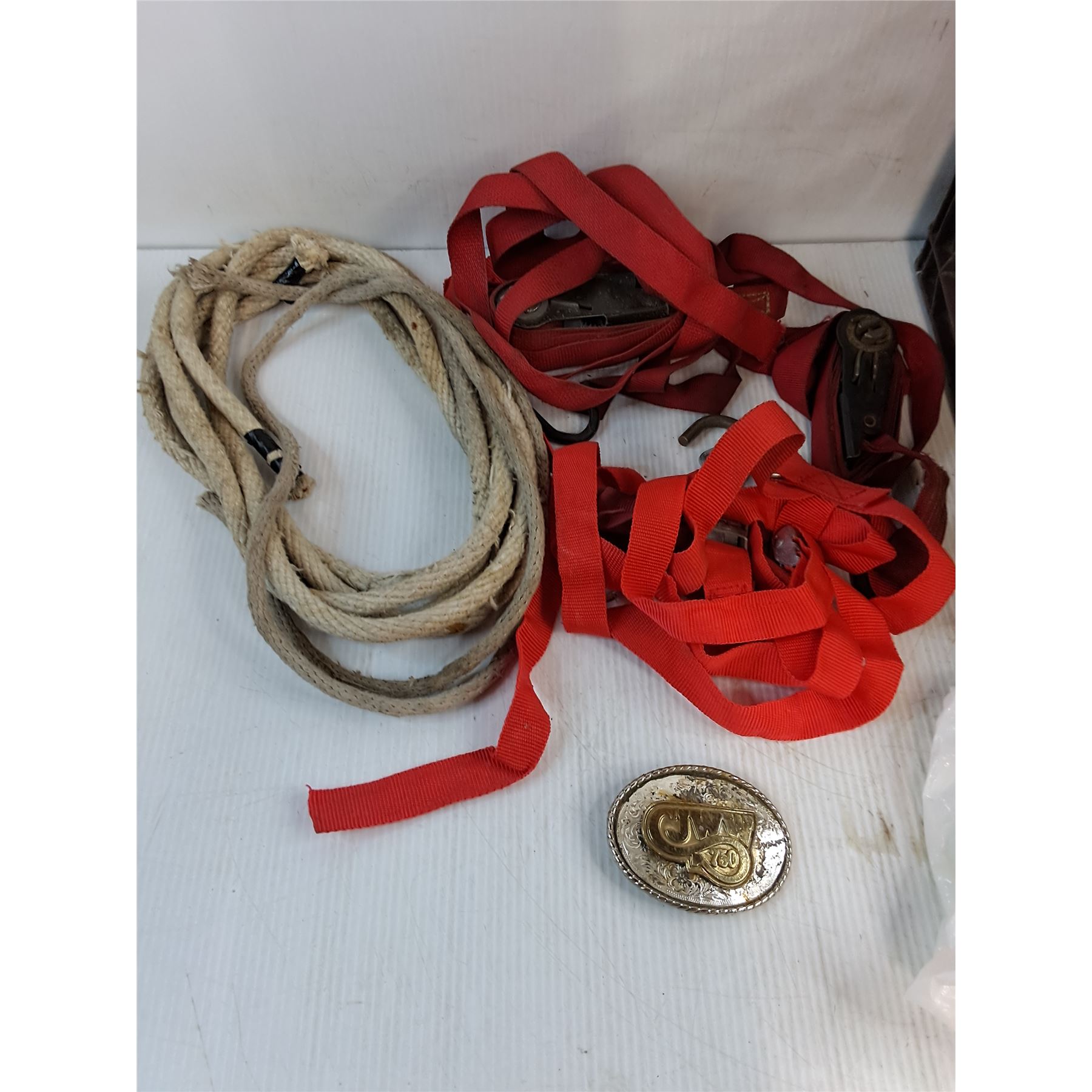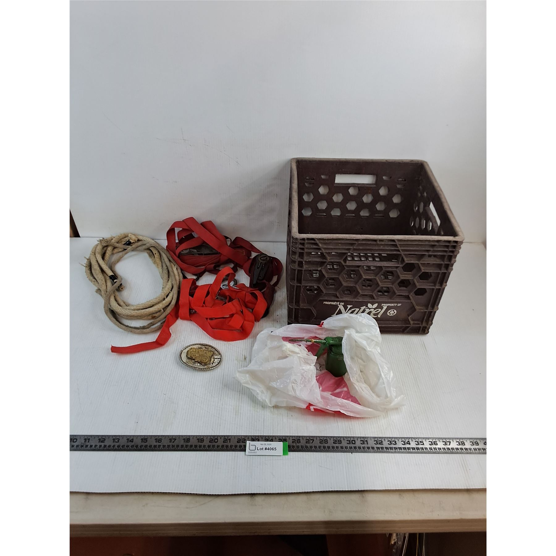Lot 4065 Milk Crate, Rope, Lock Down Tie Straps, Oil Can w/Oil, CJWW Brass Belt Buckle - PICK UP