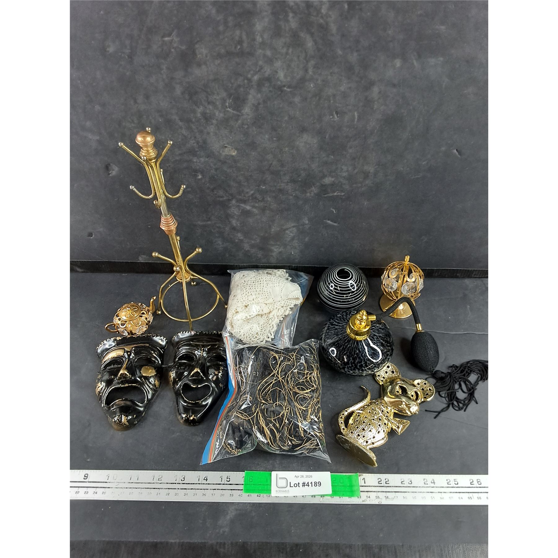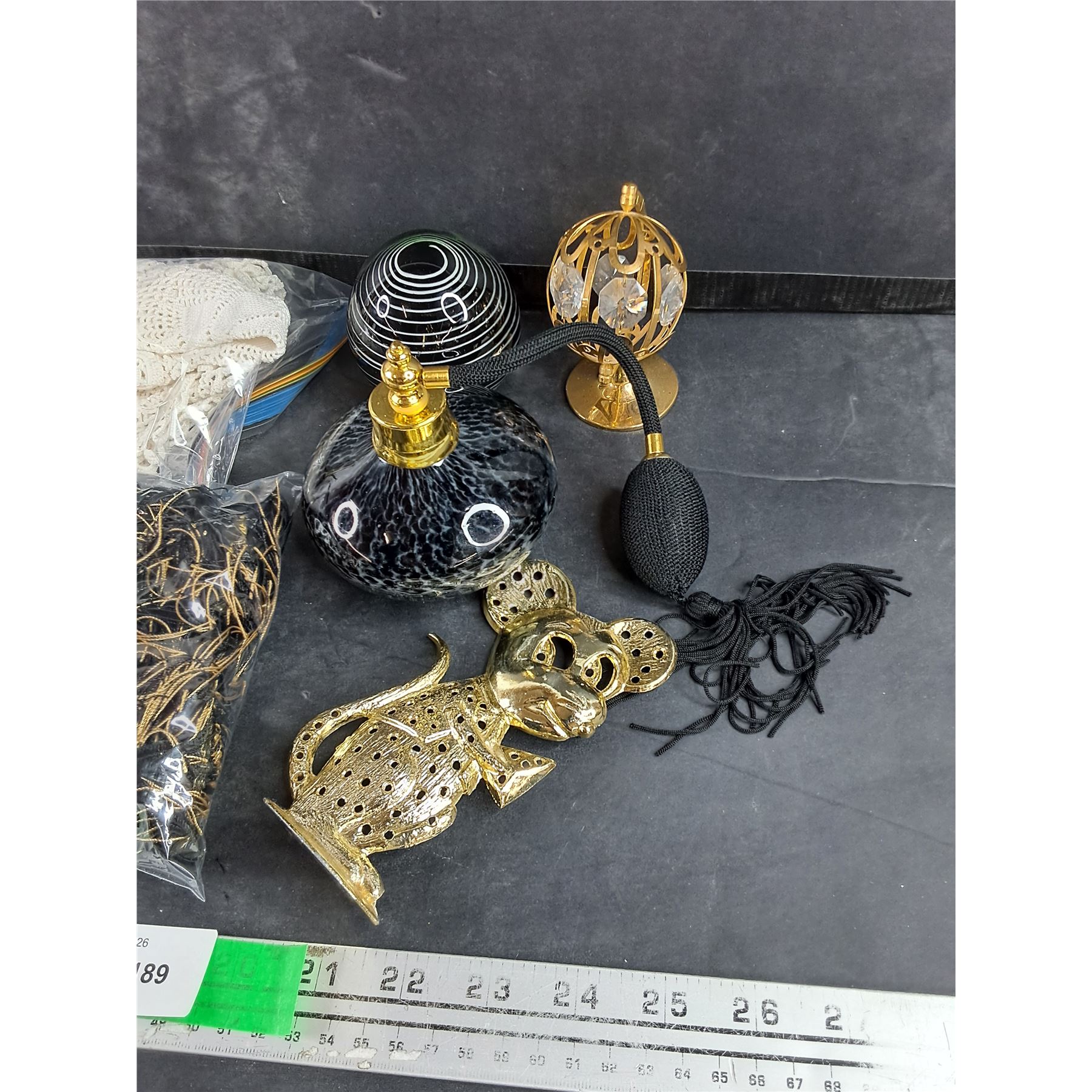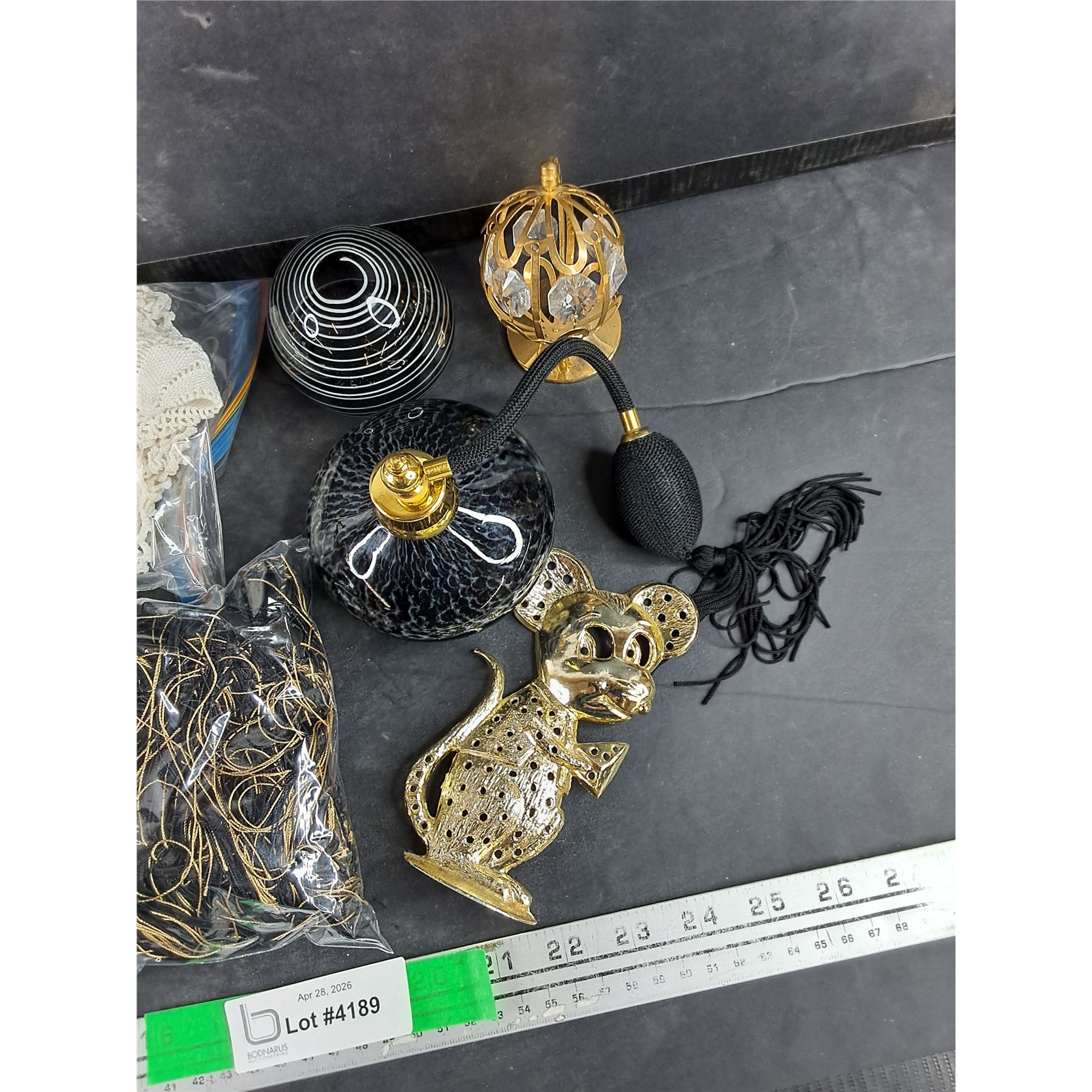 Lot 4189 Vintage Vanity Lot - Black Glass Atomizer, Crystal Globe, Tea Pot, Mouse Earring Tree, Misc