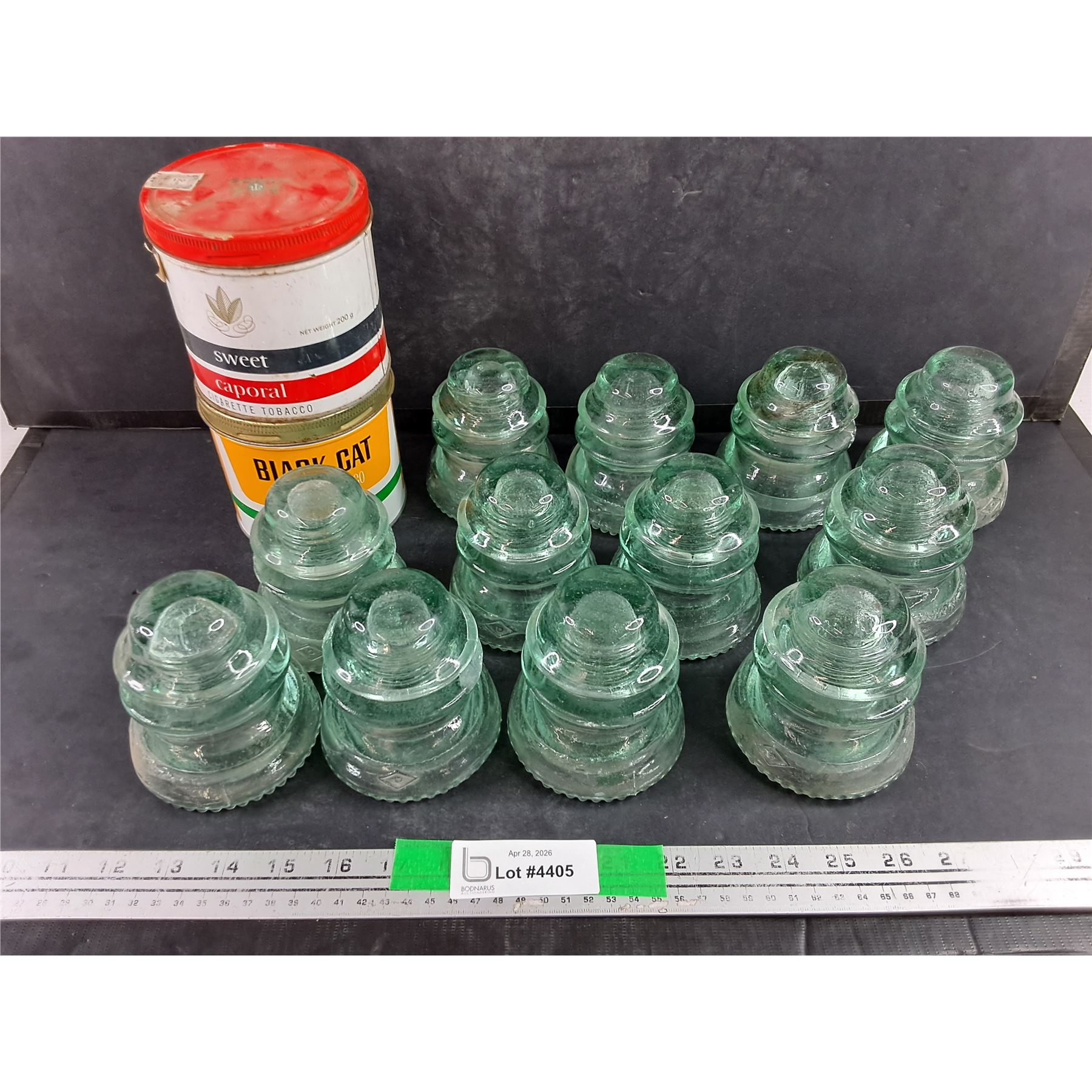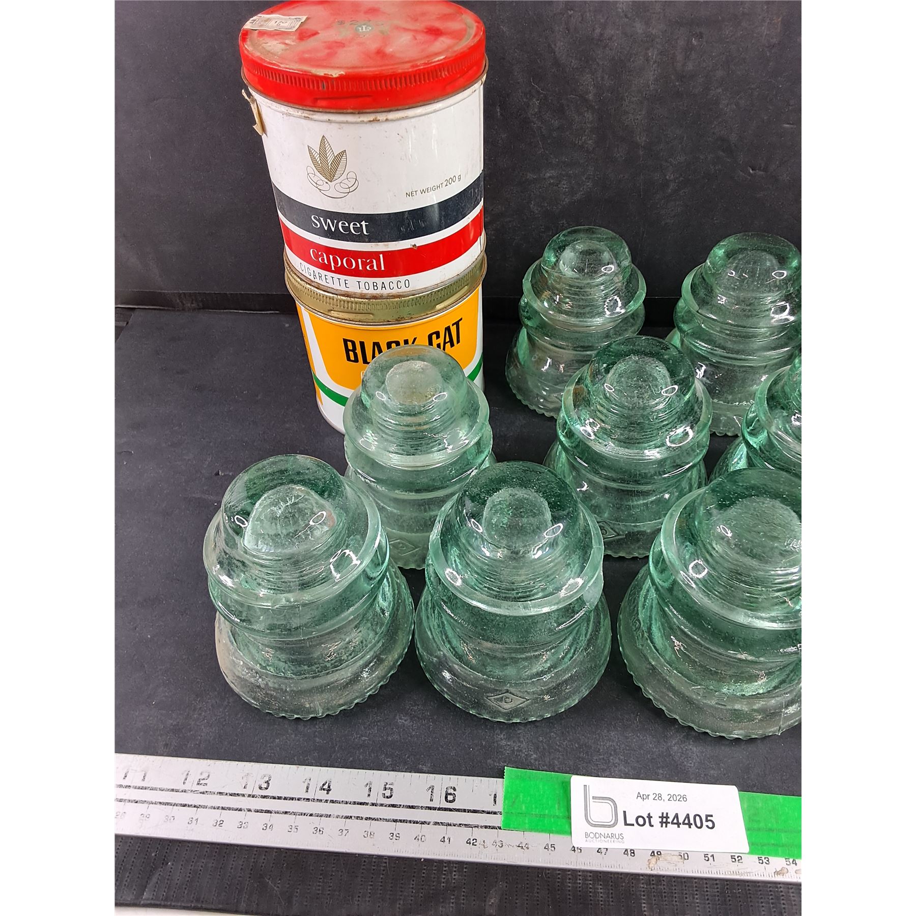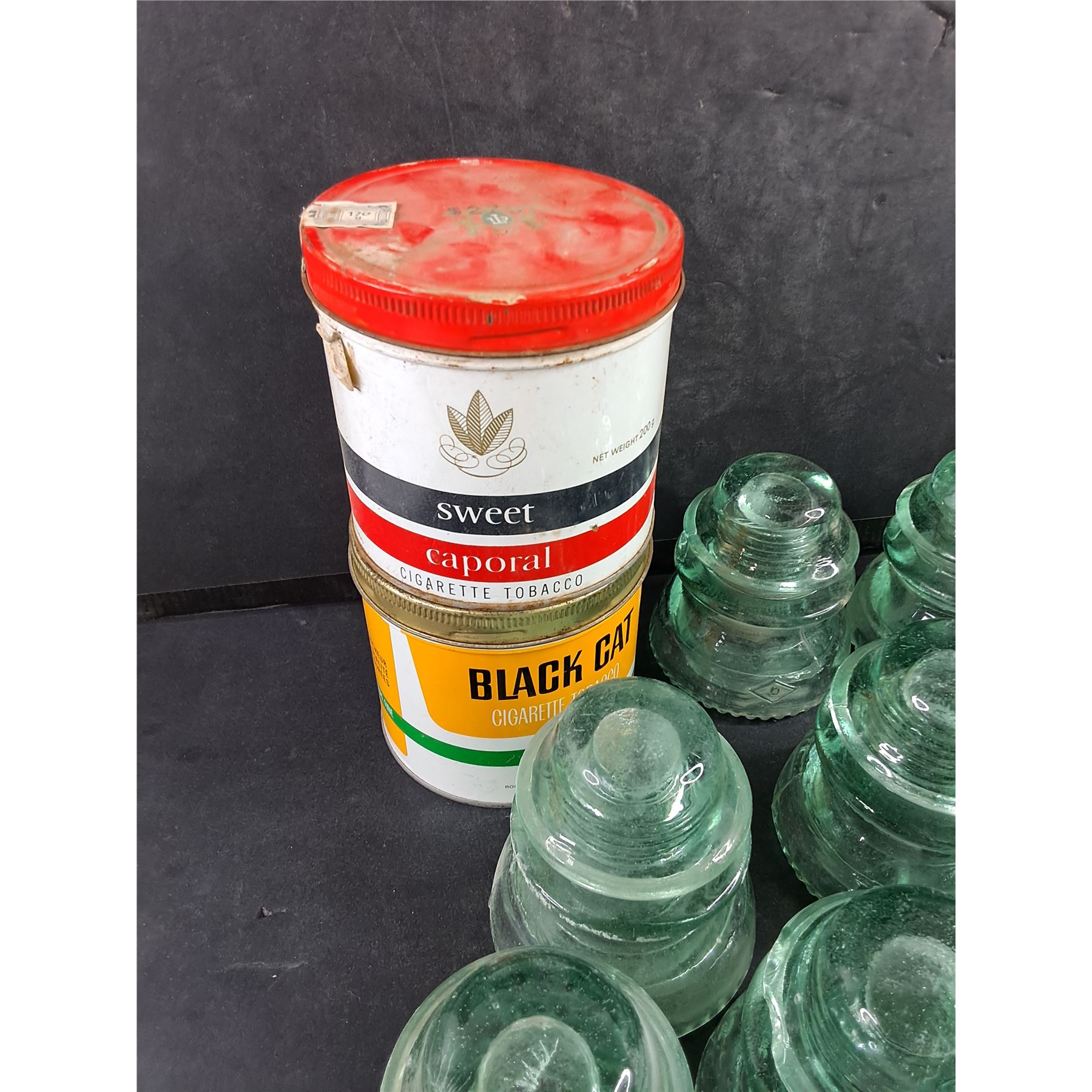 Lot 4405 Glass Insulators, Sweet Caporal & Black Cat Tobacco Cans