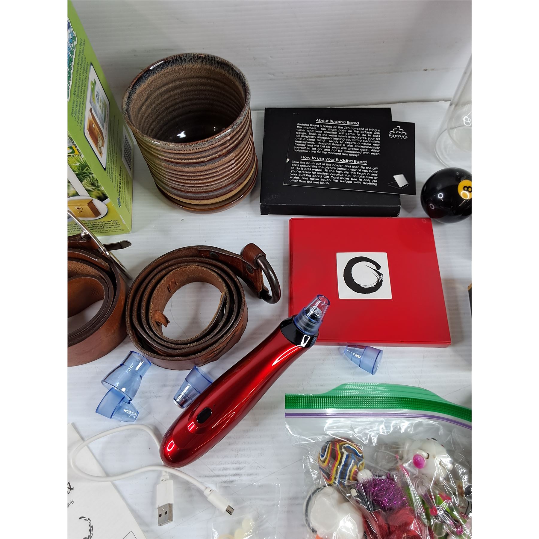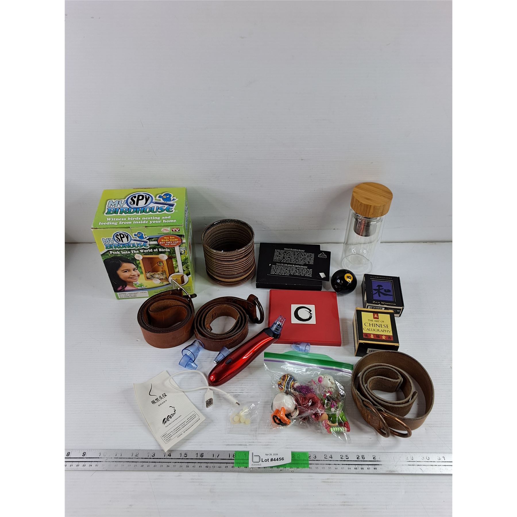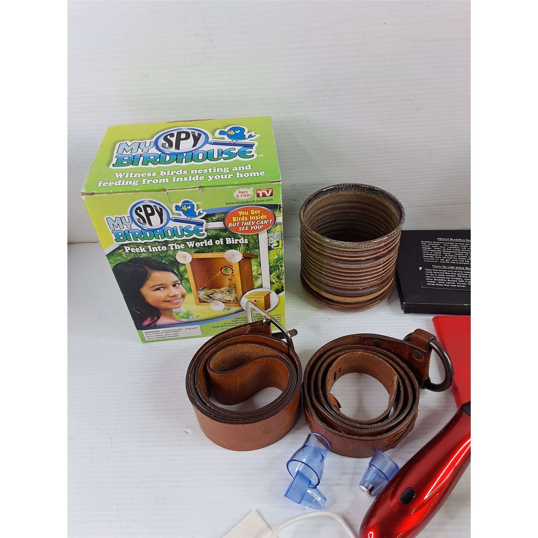 Lot 4456 My Spy Birdhouse, Buddha Board, Belts, Plant Pot, Misc