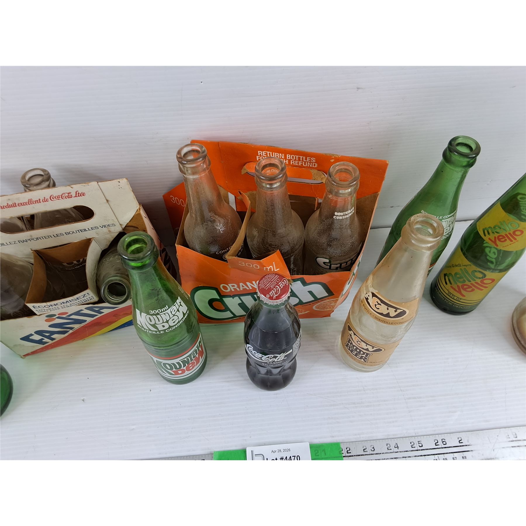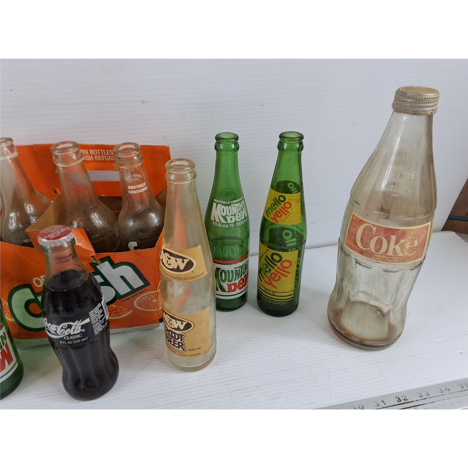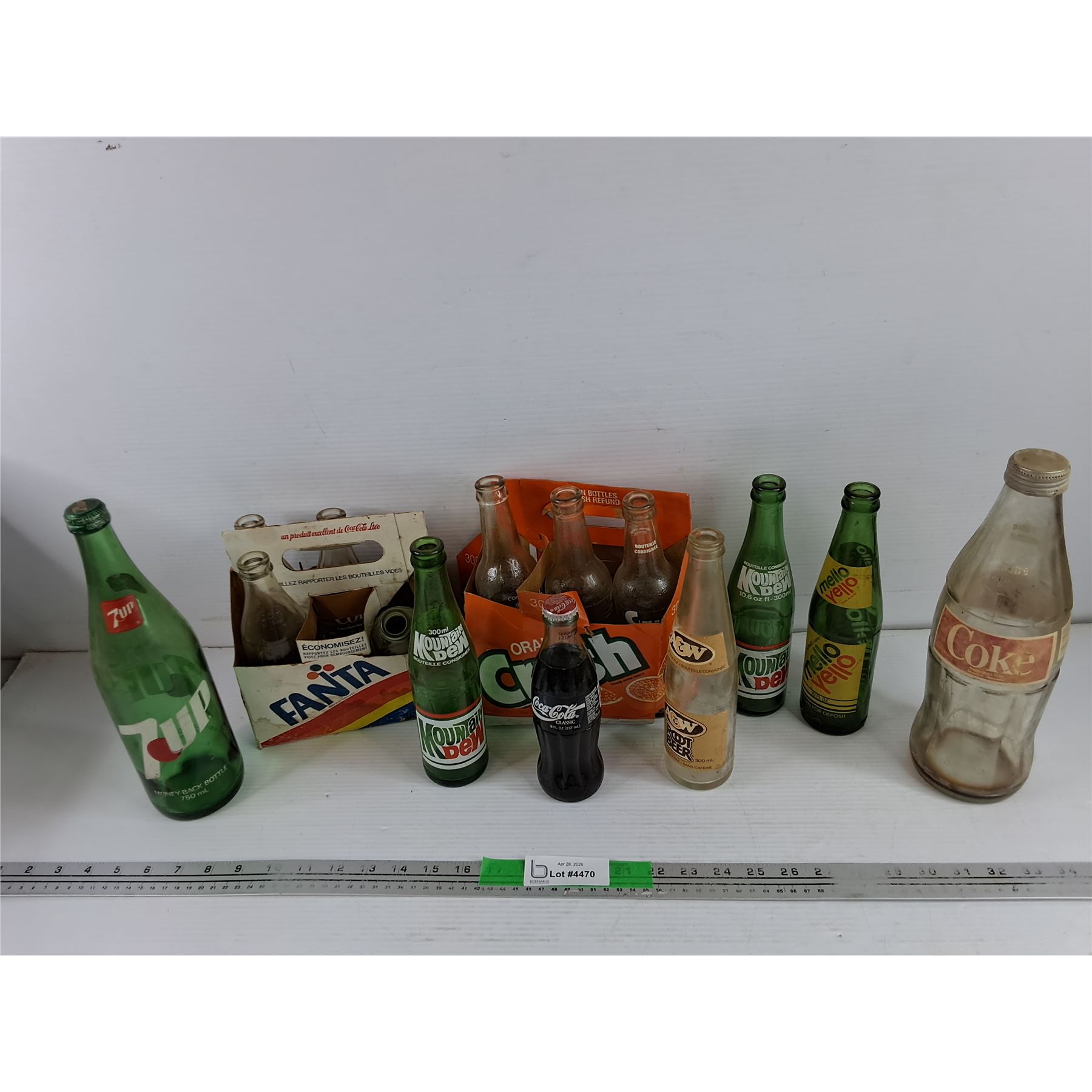Lot 4470 Vintage Glass Pop Bottles - 7UP, Mountain Dew, Root Beer, Sealed Coca Cola Geoff Petrie Bottle