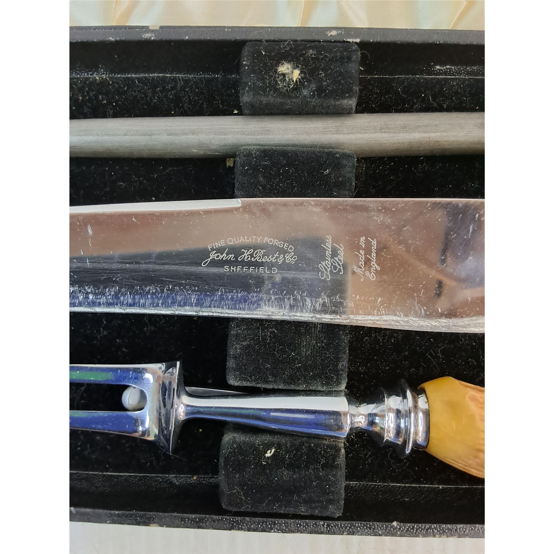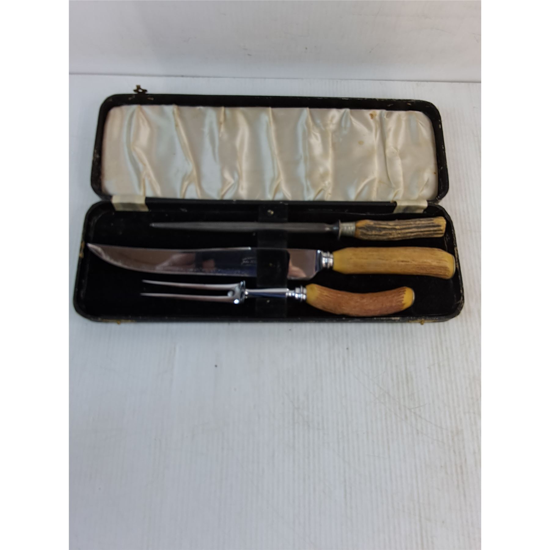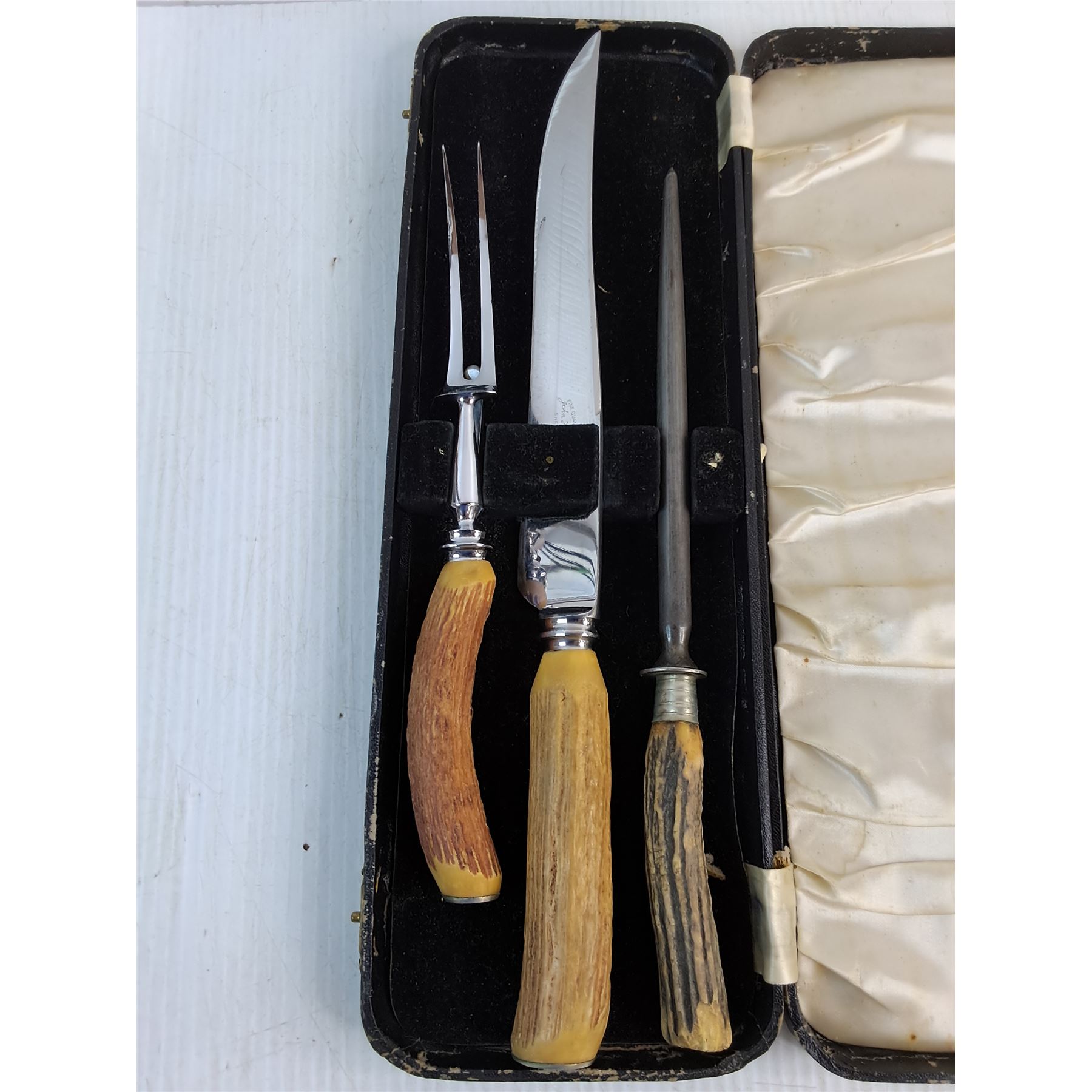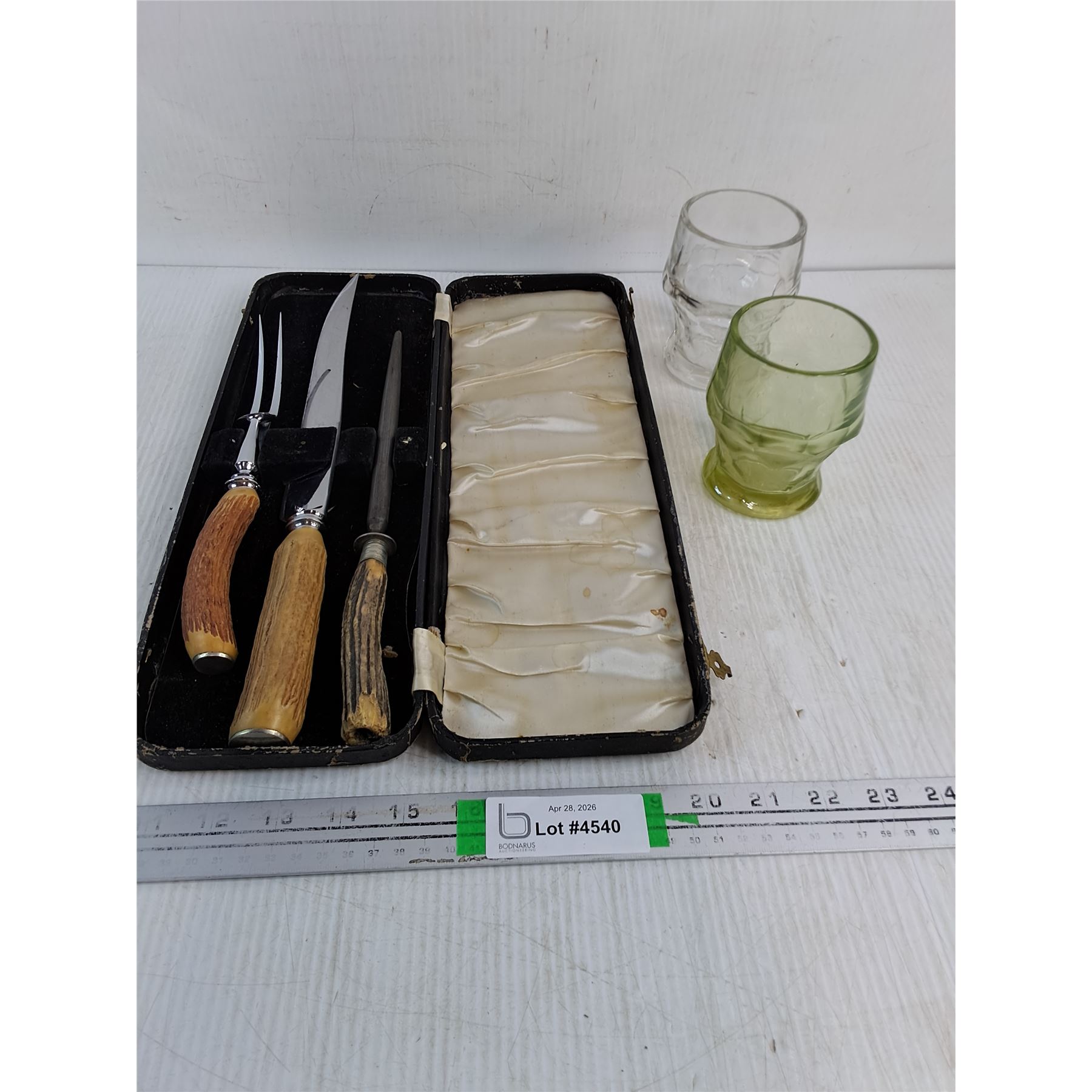 Lot 4540 Vintage Sheffield Carving Set Featuring Stag Handles and (2) Vintage Honeycomb Shot Glasses