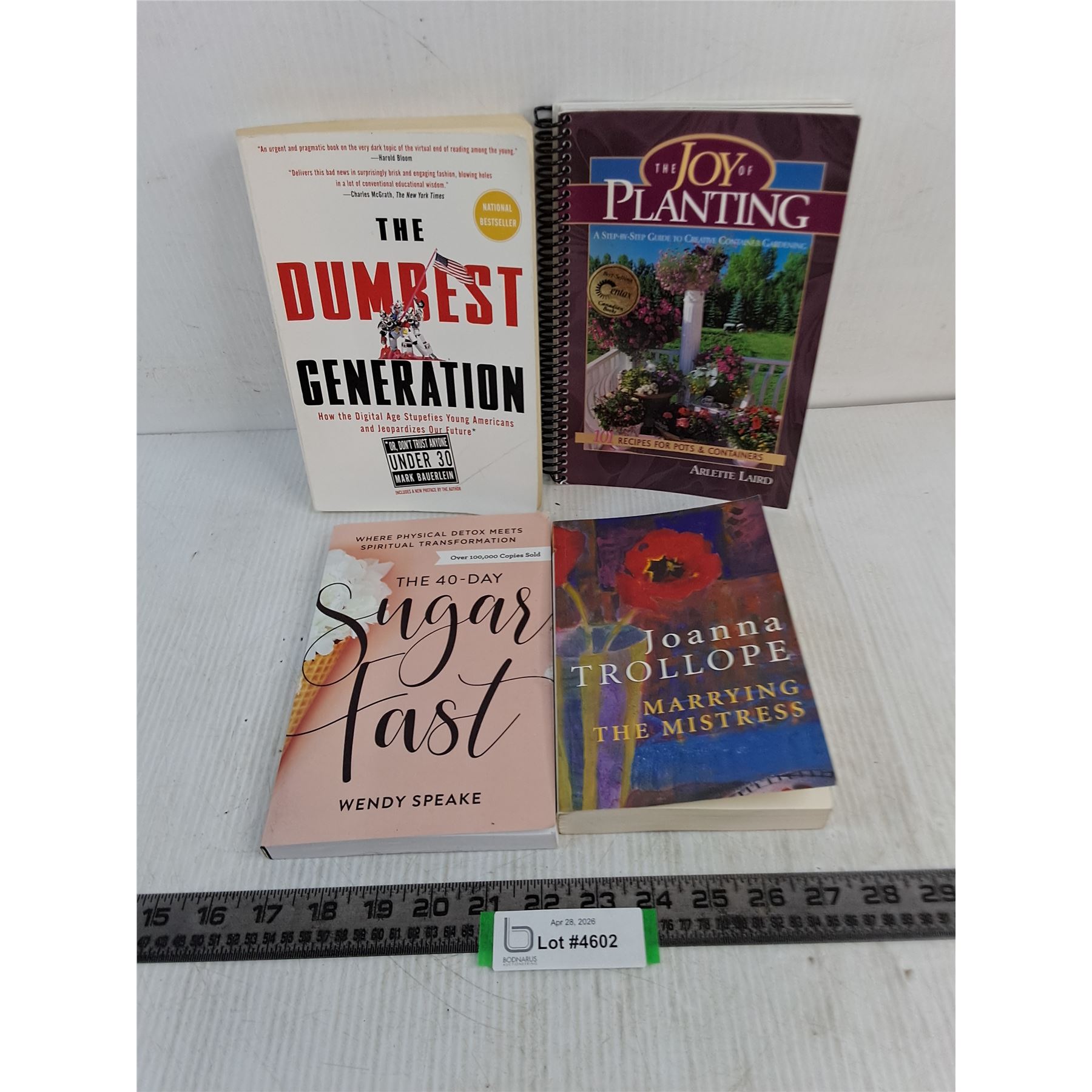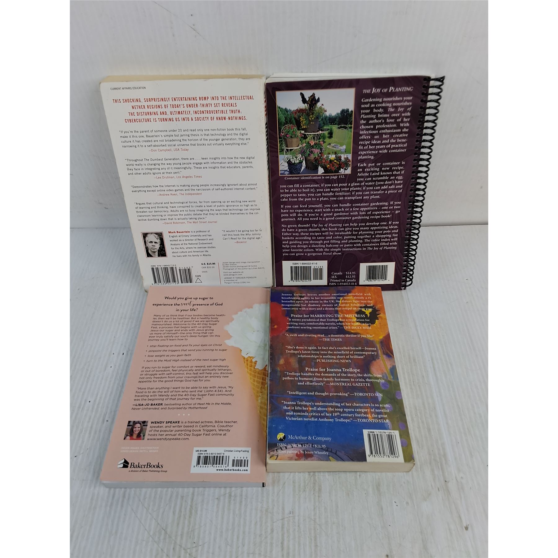 Lot 4602 (4) Books (The Dumbest Generation, Sugar Fast, Marrying The Mistress, Joy of Planting)