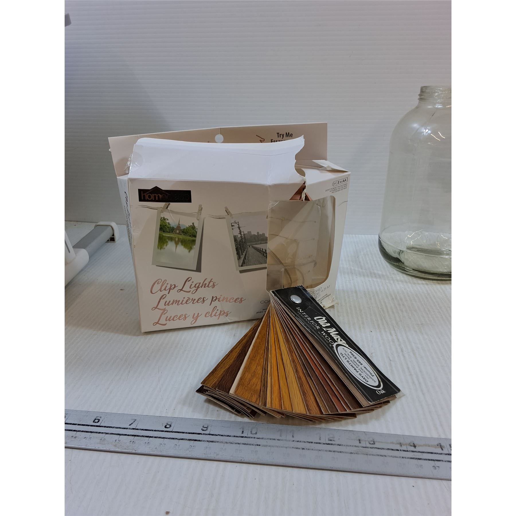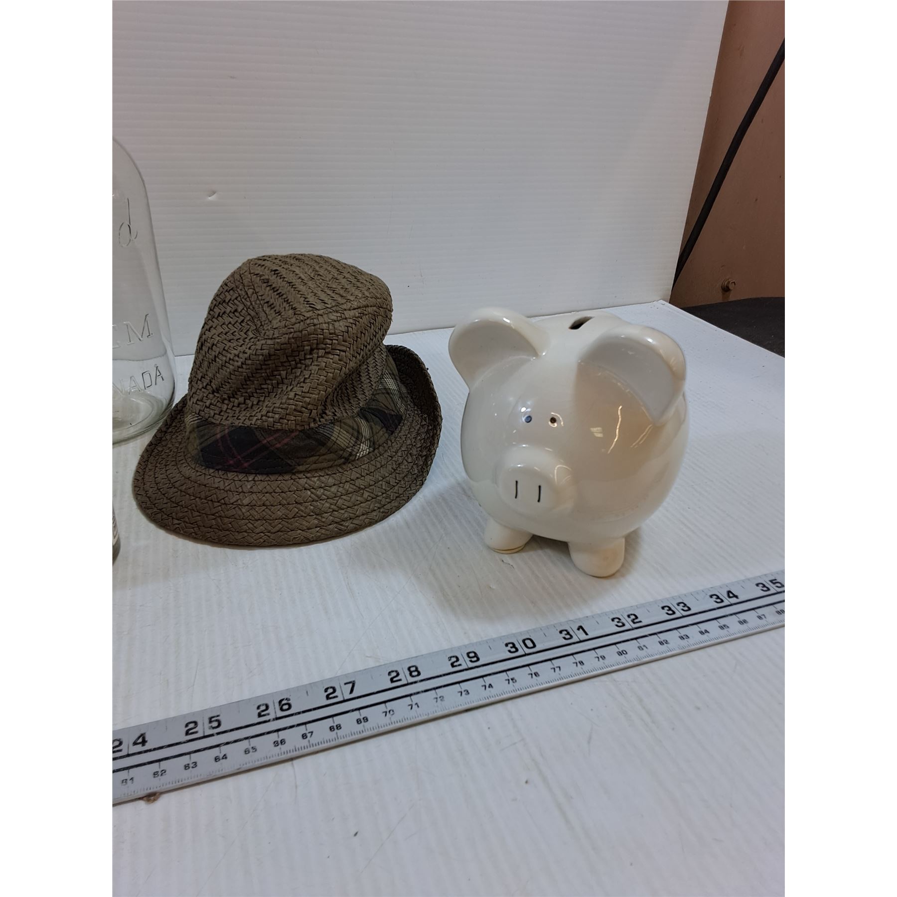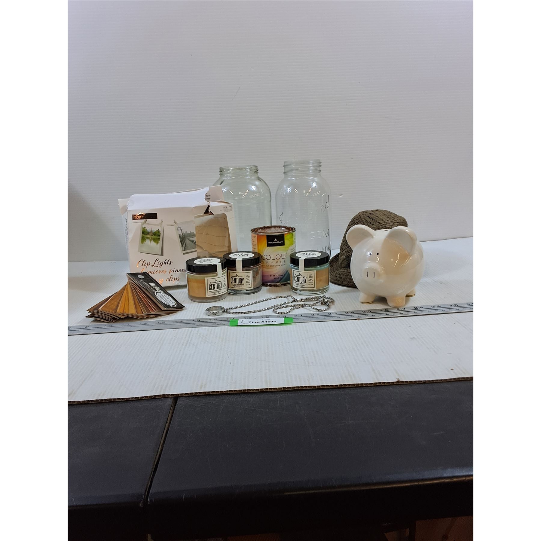 Lot 4696 (2)Mason jars, Necklace,Paint, Hat, Piggy Bank, Flooring Samples