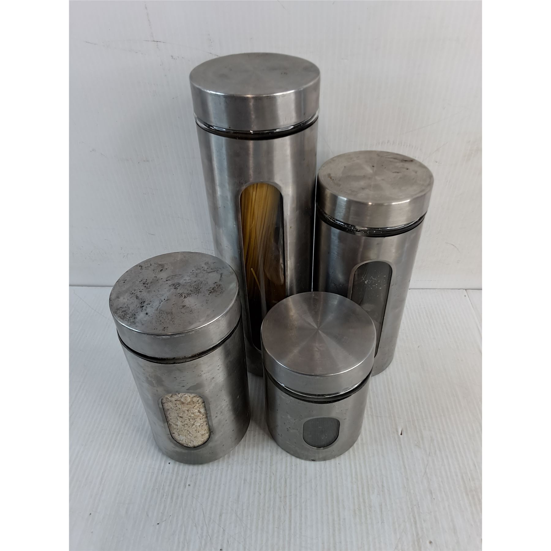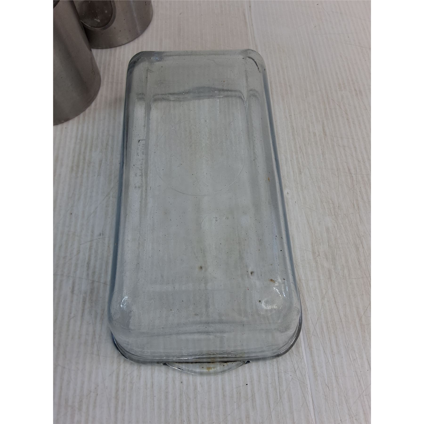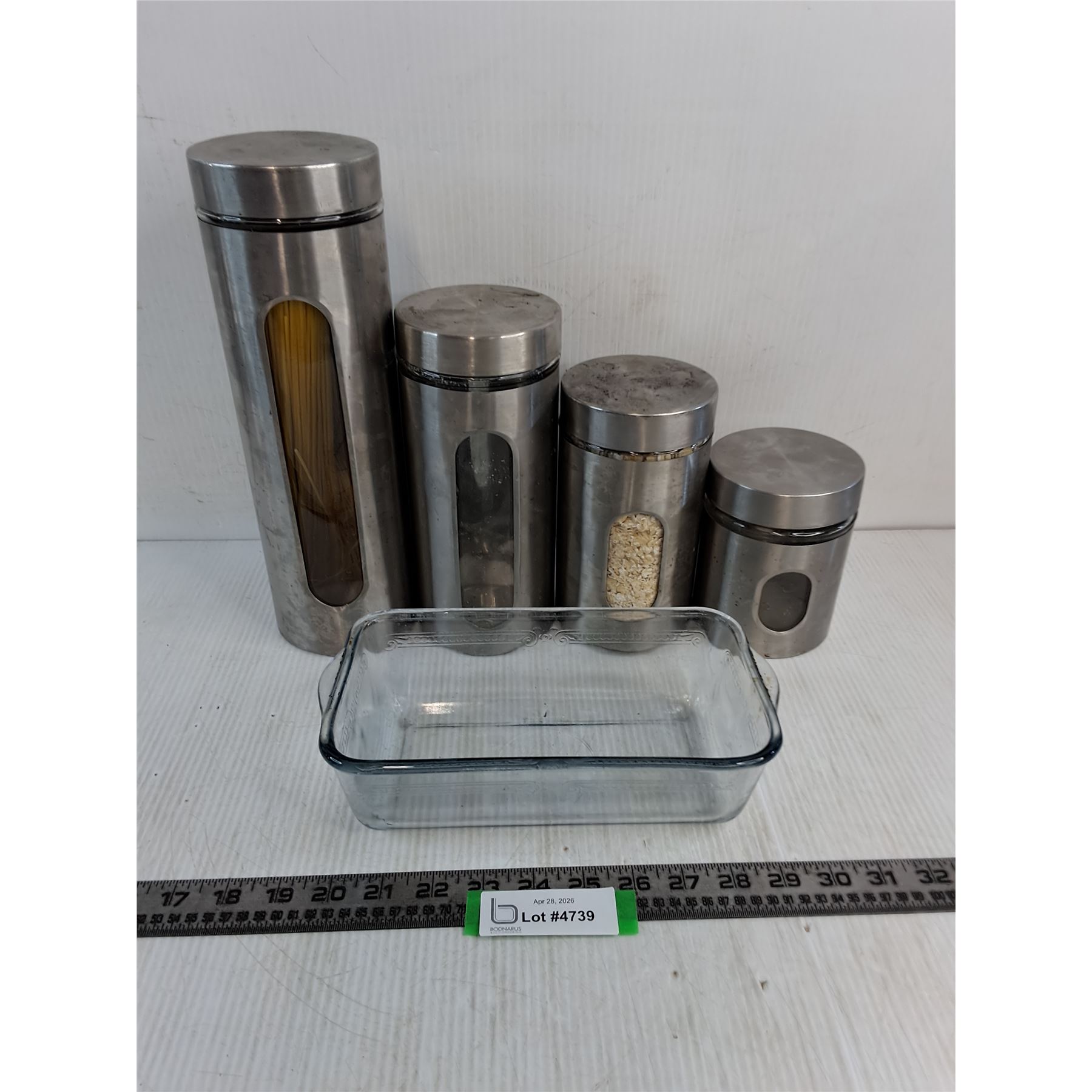 Lot 4739 Set of 4 Stainless Steel Dry Goods Canisters w/Contents, Glass Casserole Dish - Cannot Ship