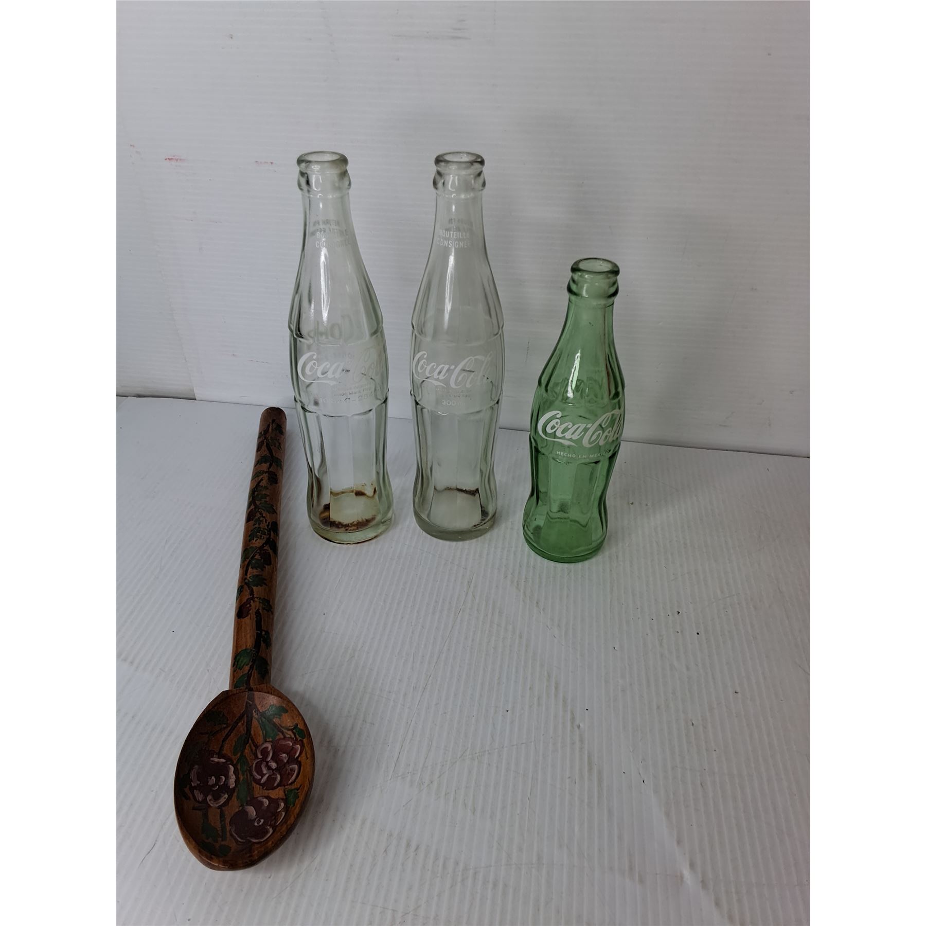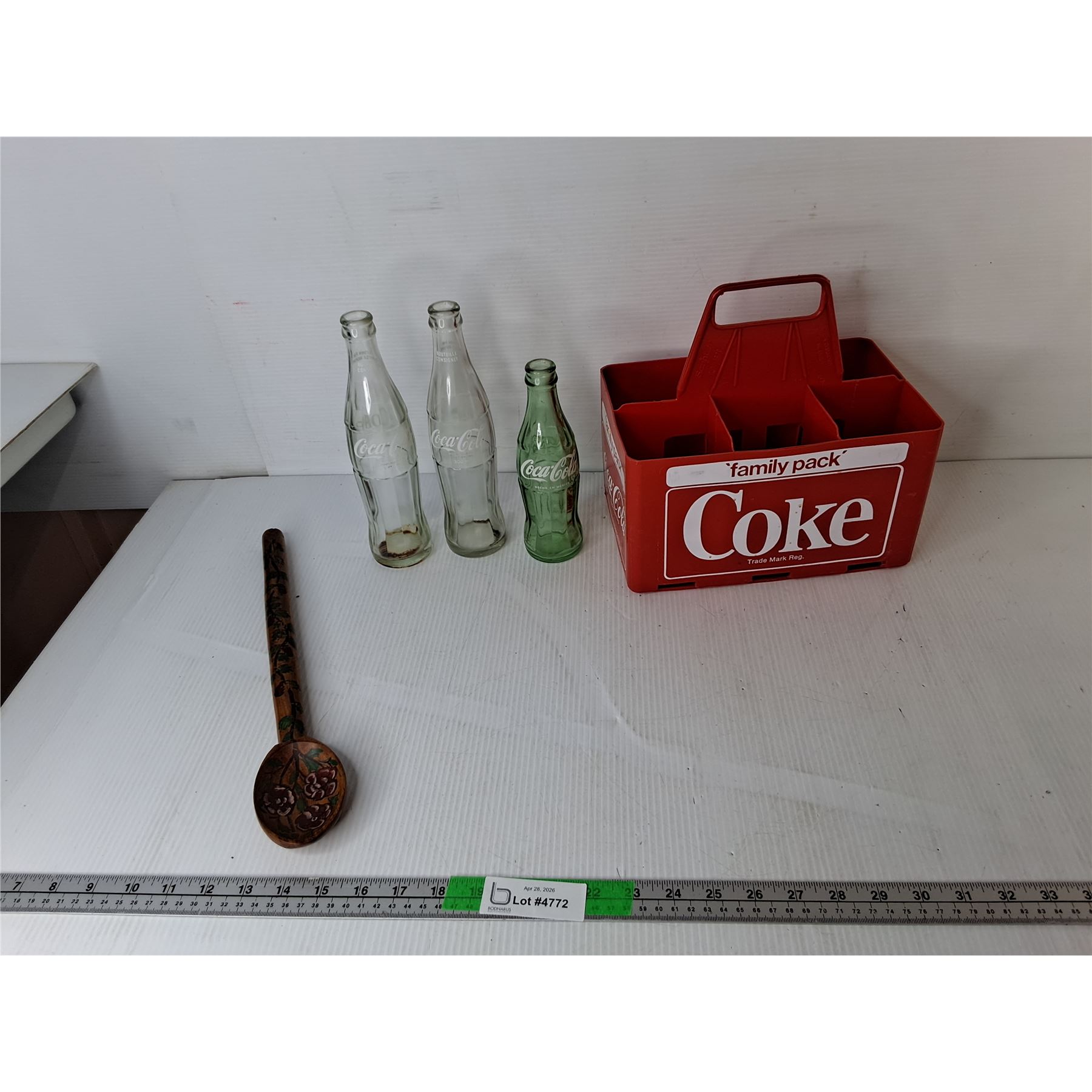 Lot 4772 Wooden Stirring Spoon, Glass Coca-Cola Bottles & Bottle Carrier