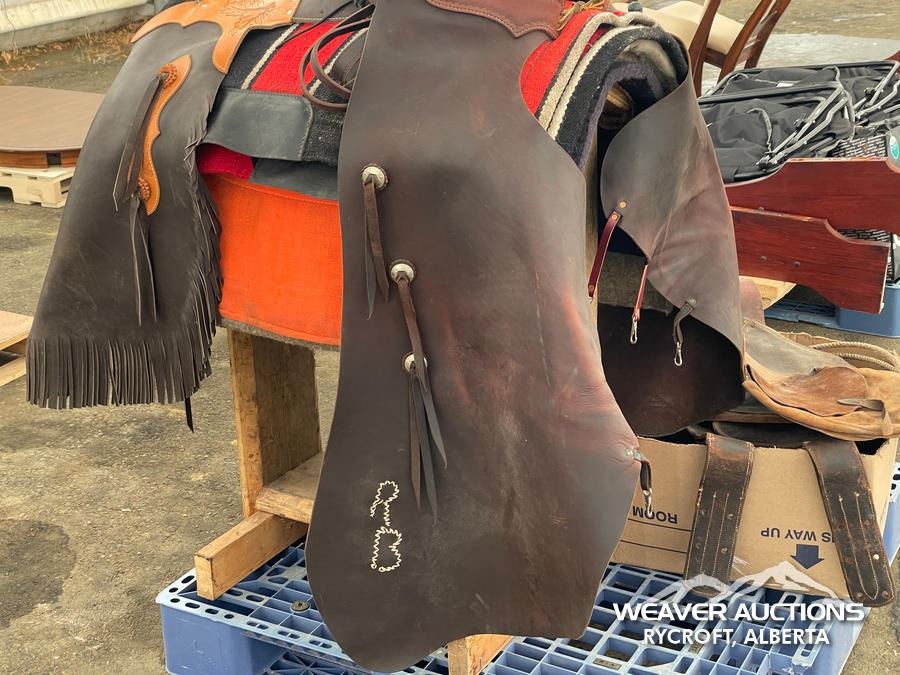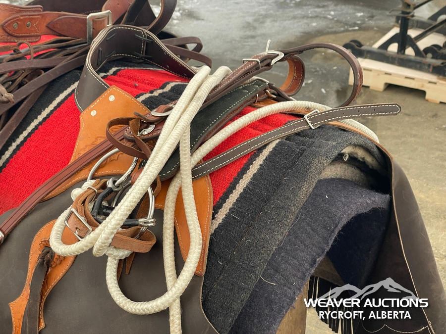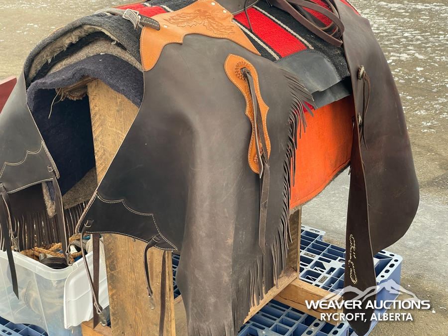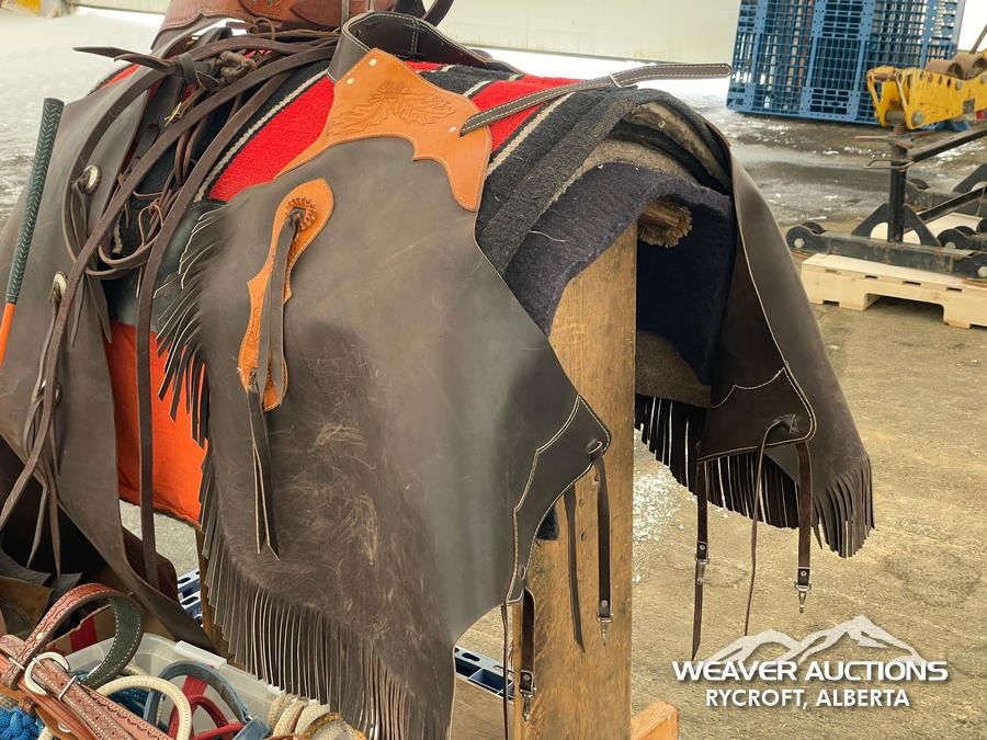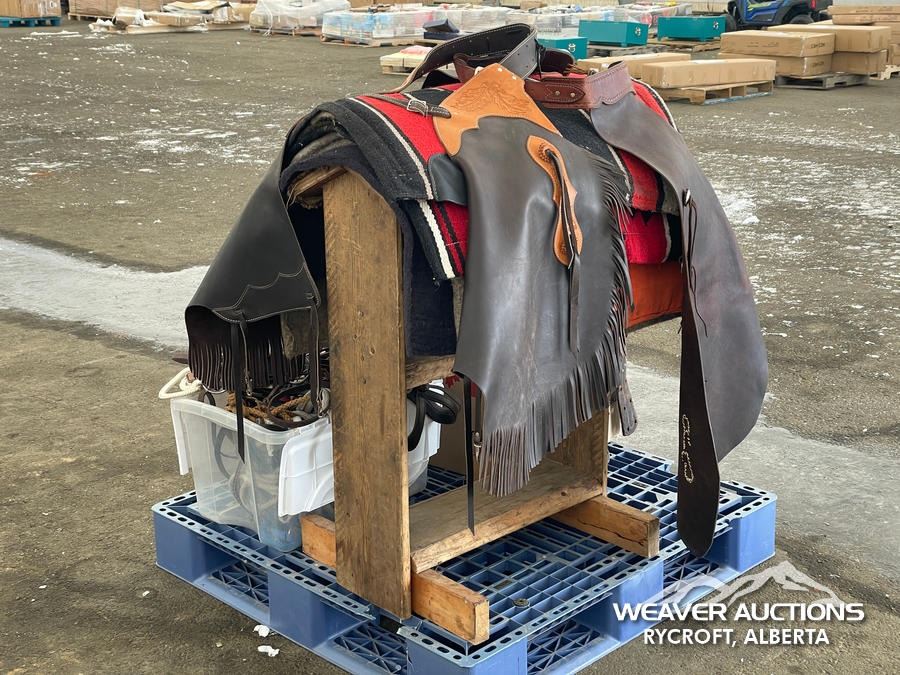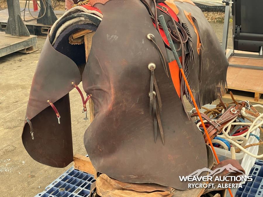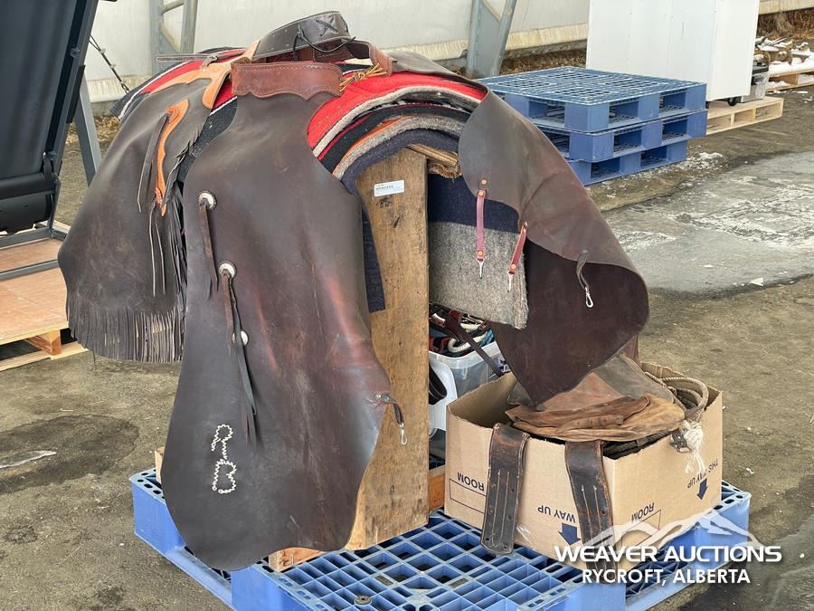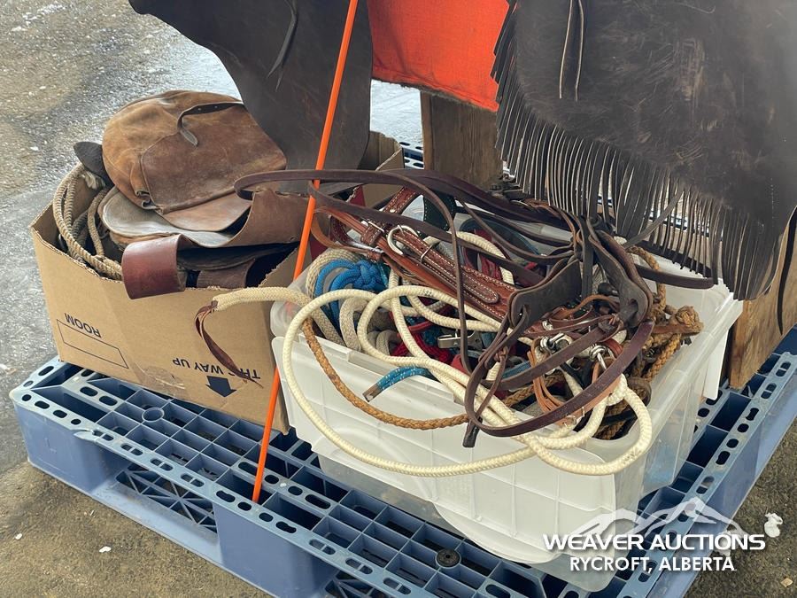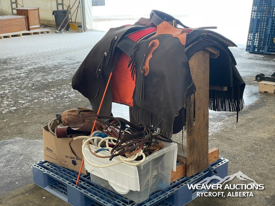 Specifications: (1) SADDLE STAND, (2) SADDLE PADS, (1) PAIR OF CHAPS, (1) PAIR OF CHINKS, (2) PRO CHOICE SADDLE PADS, HORSEMANSHIP BRIDLE W/IRON SNAFFLE BIT, PARELLI CARROT STICK, ROPE HALTERS, 15 FT. LEAD ROPE, 30 FT. LUNGE ROPE, ASSORTED SADDLE COMPONANTS, LEATHER BRIDLE W/SNAFFLE BIT, (1) PAIR OF SADDLE BAGS, LEATHER RIENS