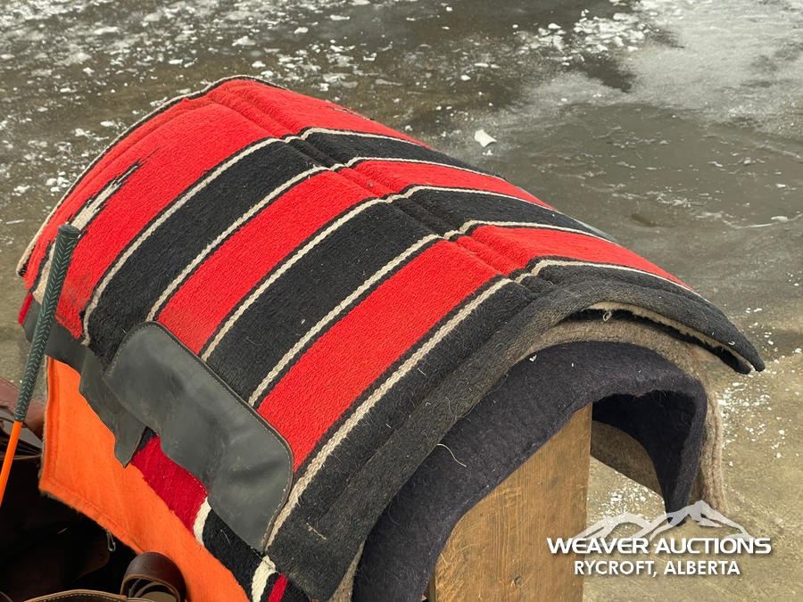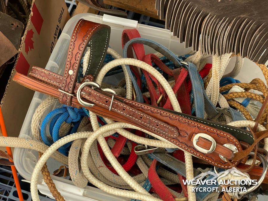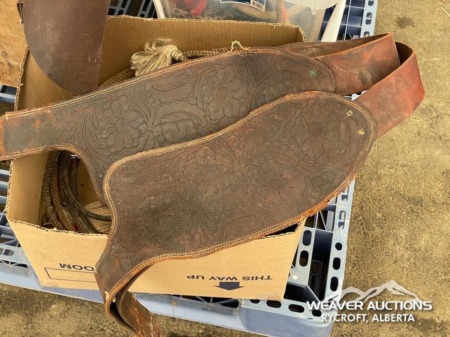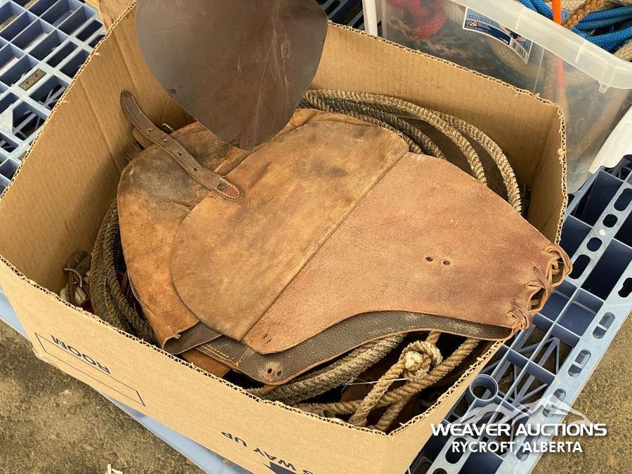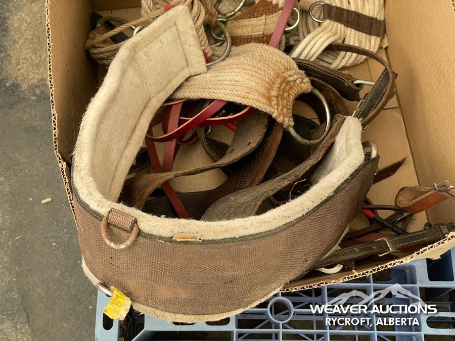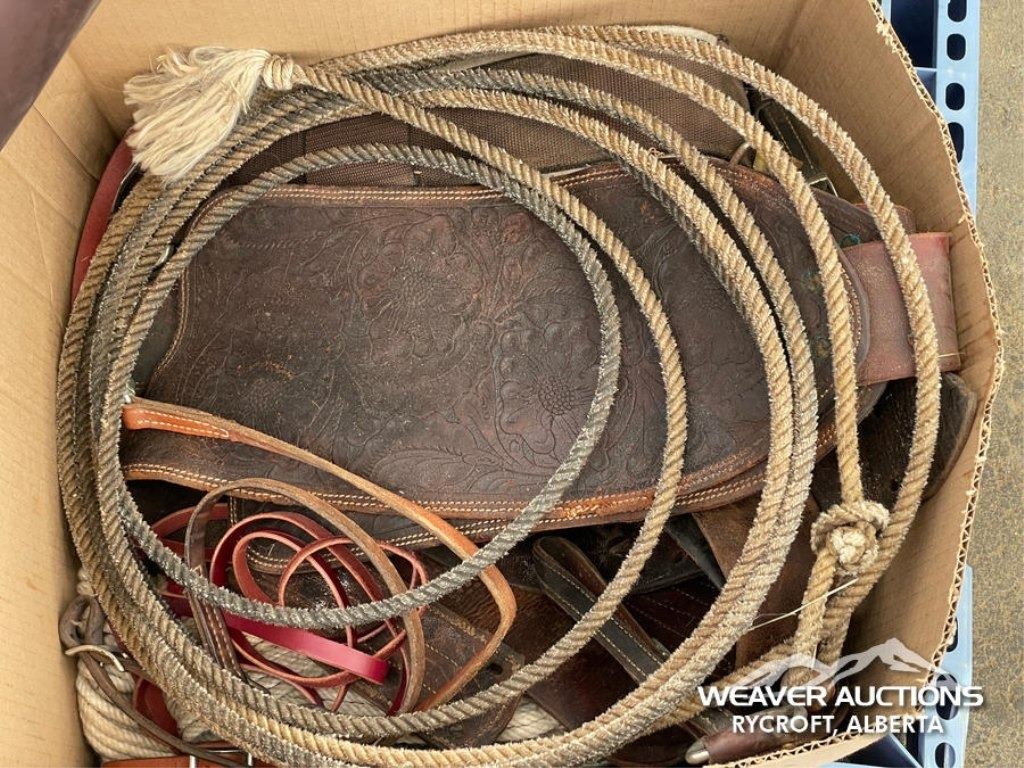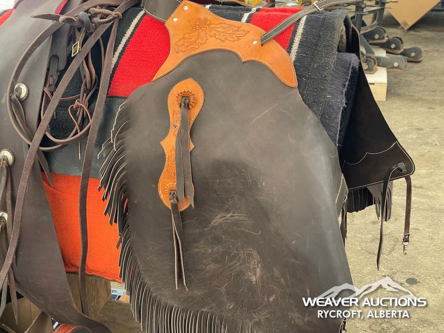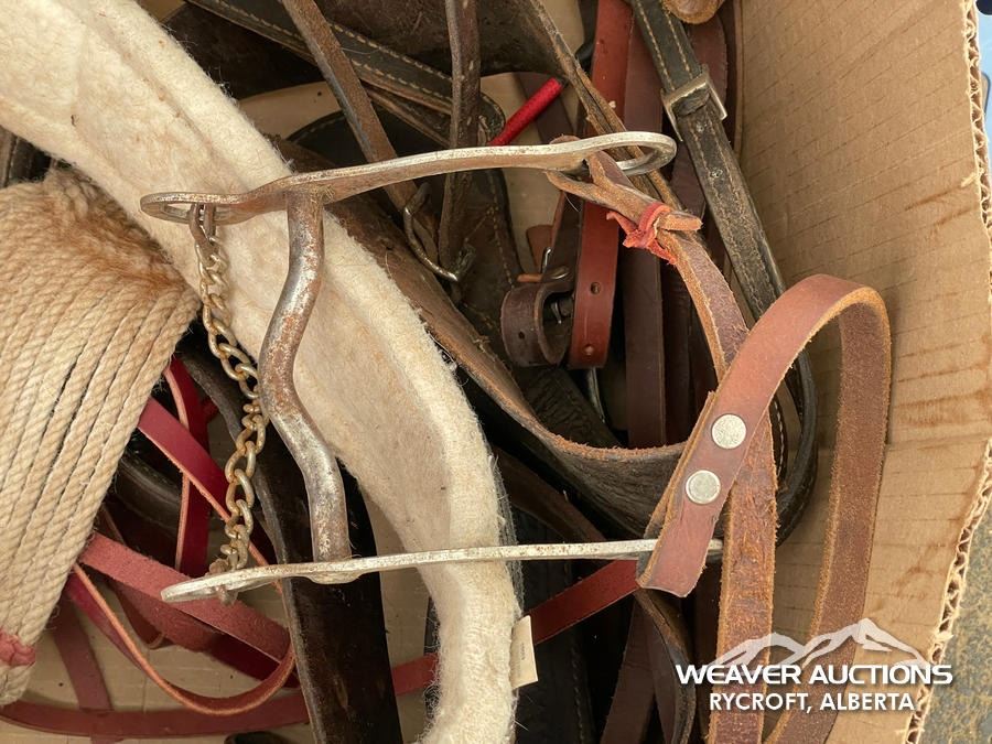 Specifications: (1) SADDLE STAND, (2) SADDLE PADS, (1) PAIR OF CHAPS, (1) PAIR OF CHINKS, (2) PRO CHOICE SADDLE PADS, HORSEMANSHIP BRIDLE W/IRON SNAFFLE BIT, PARELLI CARROT STICK, ROPE HALTERS, 15 FT. LEAD ROPE, 30 FT. LUNGE ROPE, ASSORTED SADDLE COMPONANTS, LEATHER BRIDLE W/SNAFFLE BIT, (1) PAIR OF SADDLE BAGS, LEATHER RIENS