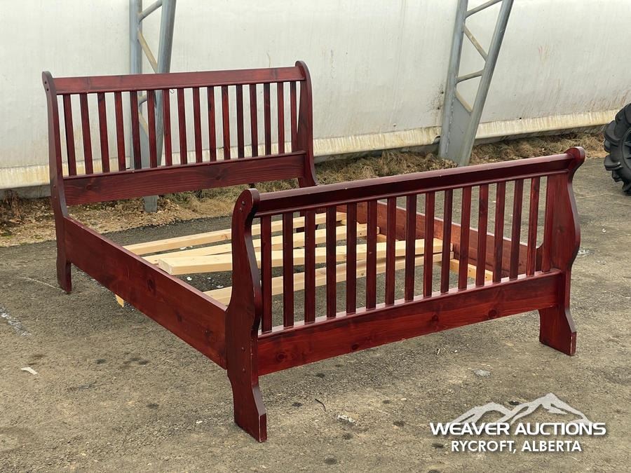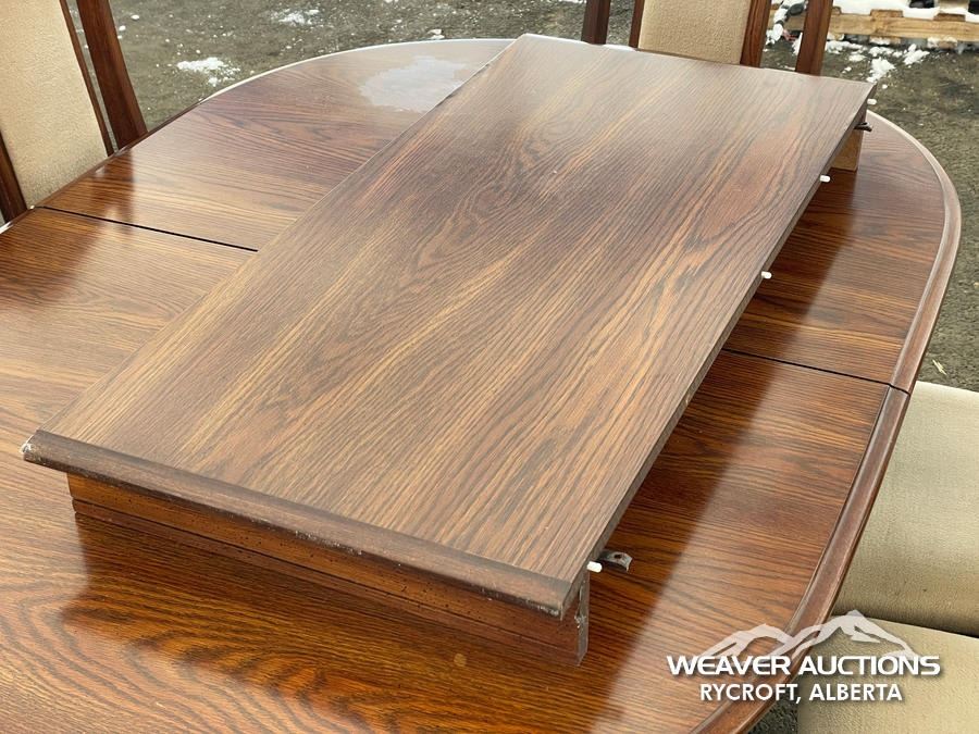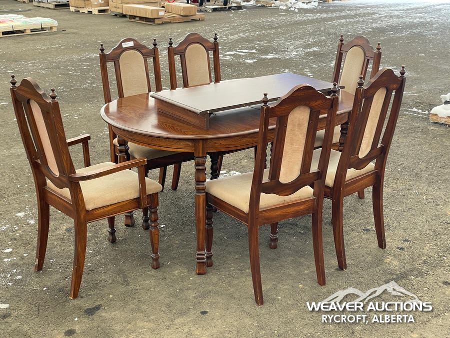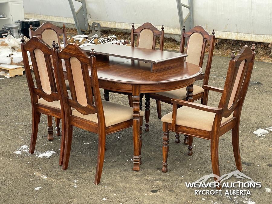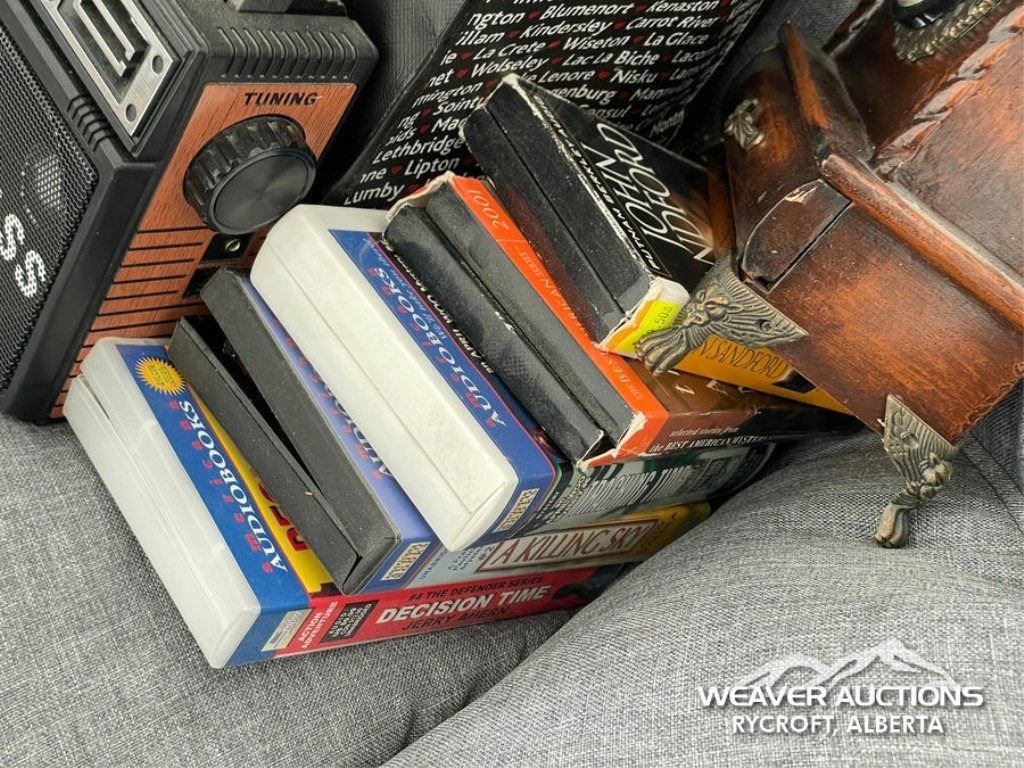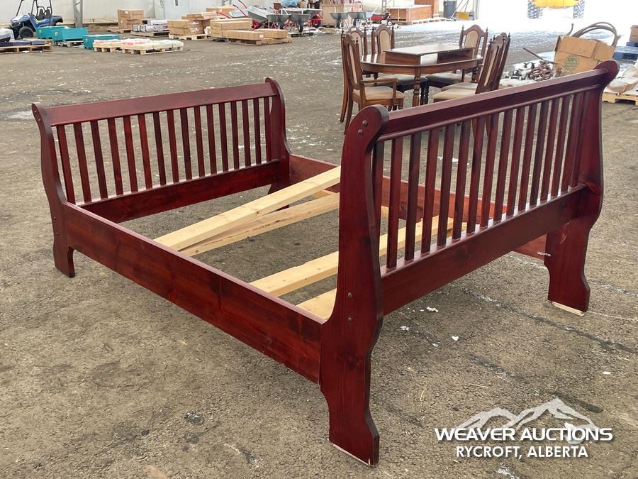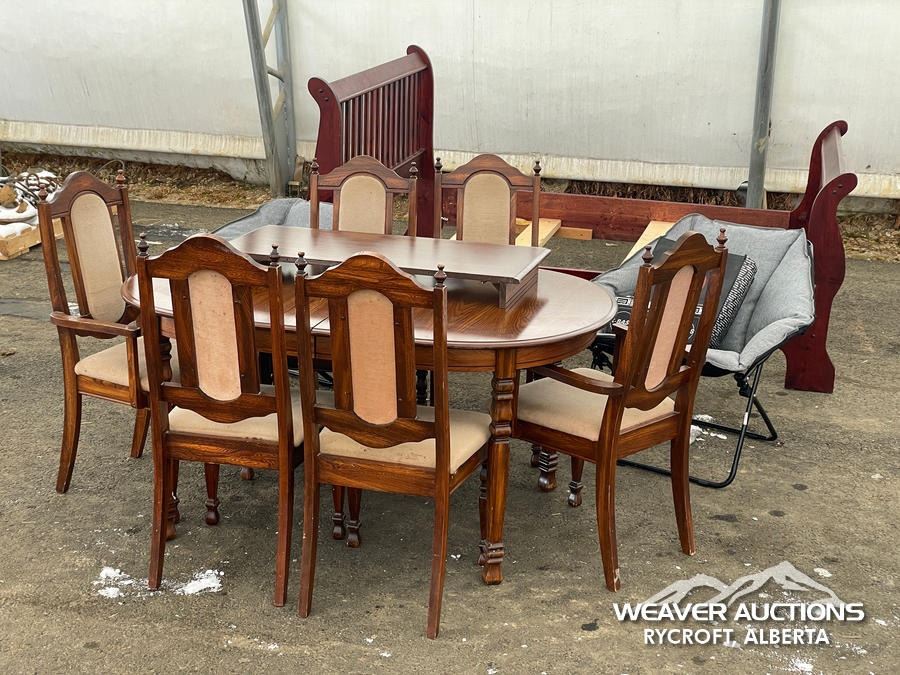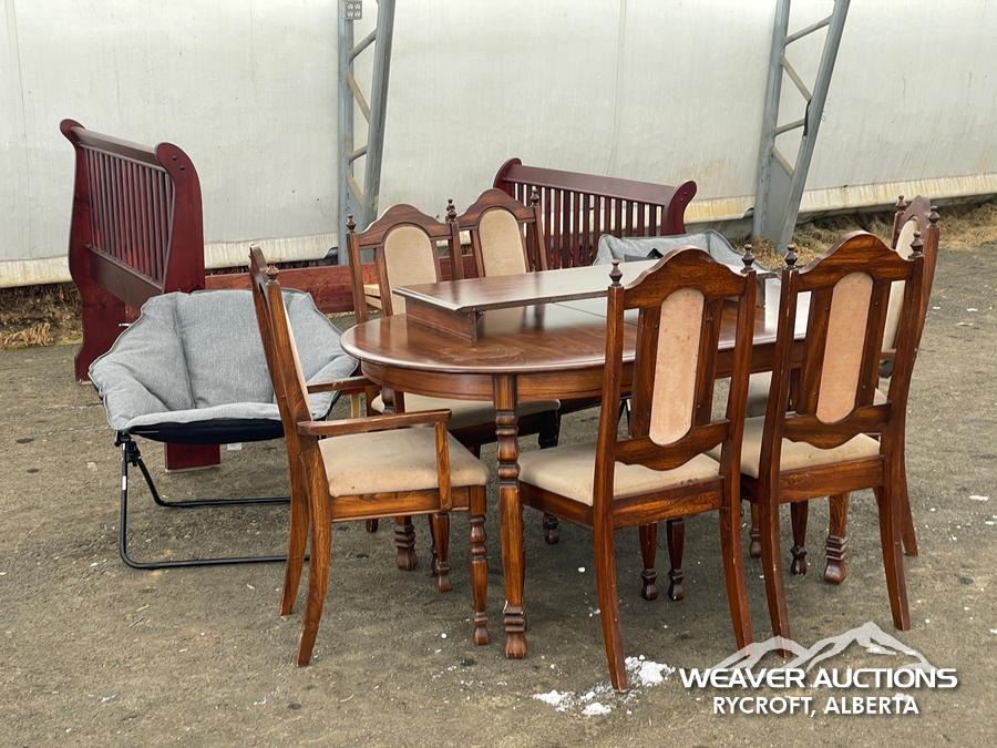 Specifications: SLEIGH BED FRAME, 2 PAPASON CHAIRS, OVAL WOODEN DINNING TABLE, (4) SIDE CHAIRS, (2) END TABLE CHAIRS, (1) TABLE LEAF, (1) CASSET PLAYER W/ASSORTED "BOOK ON TAPE" CASSETTS, (1) ORNAMENTAL CLOCK