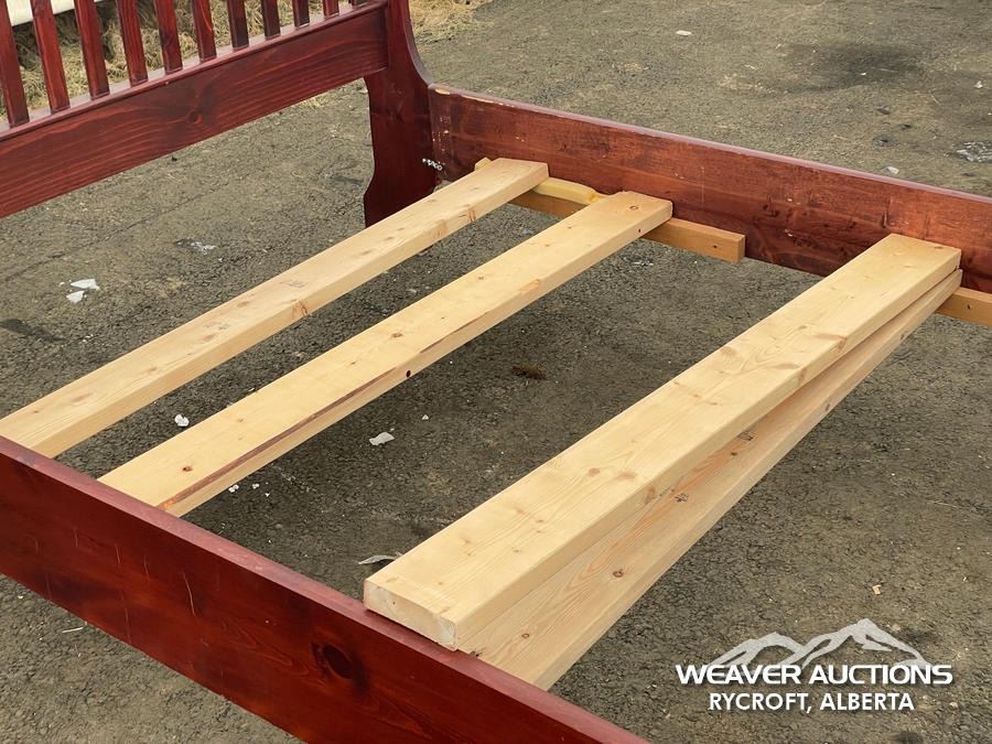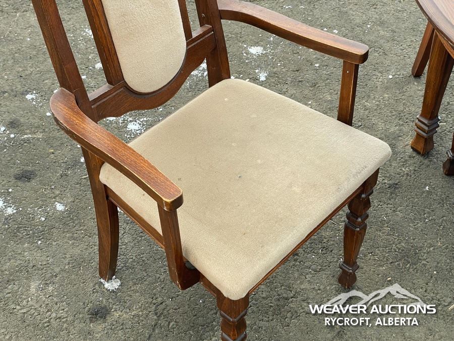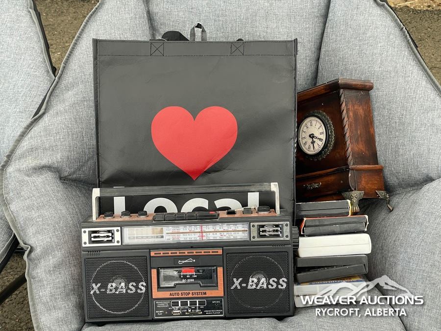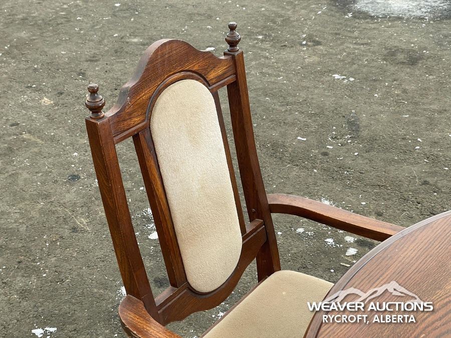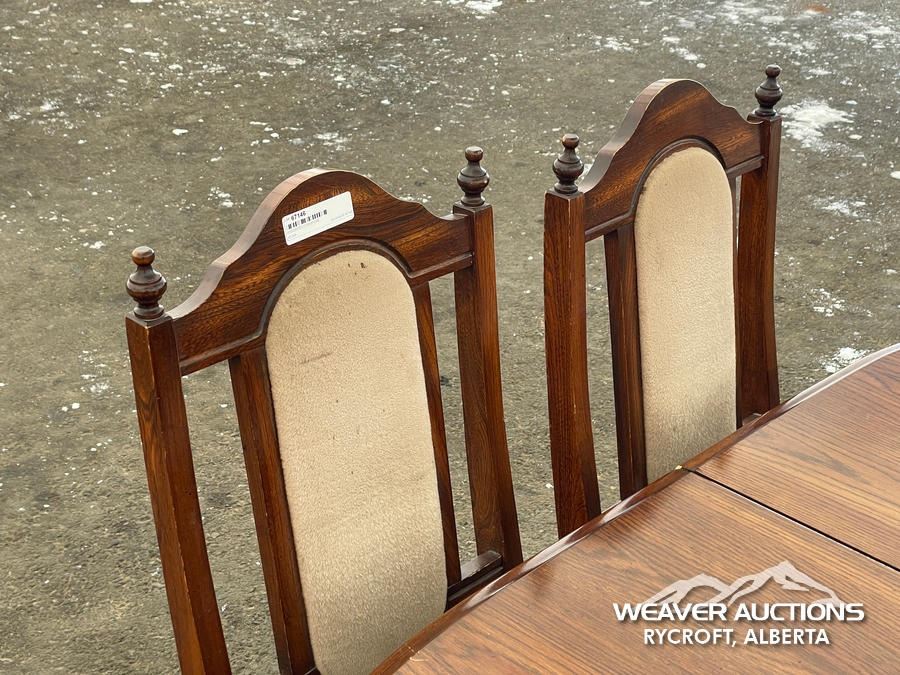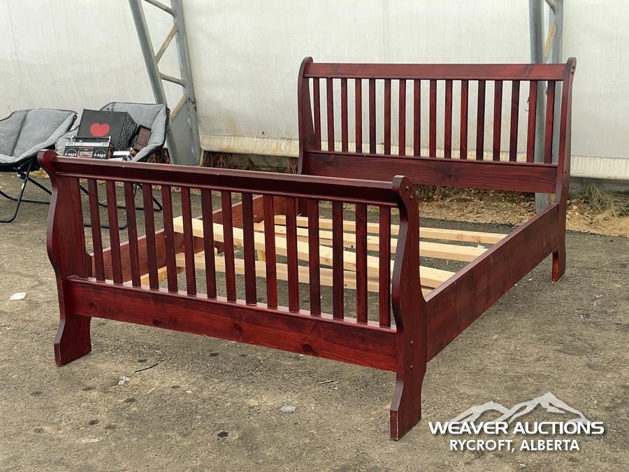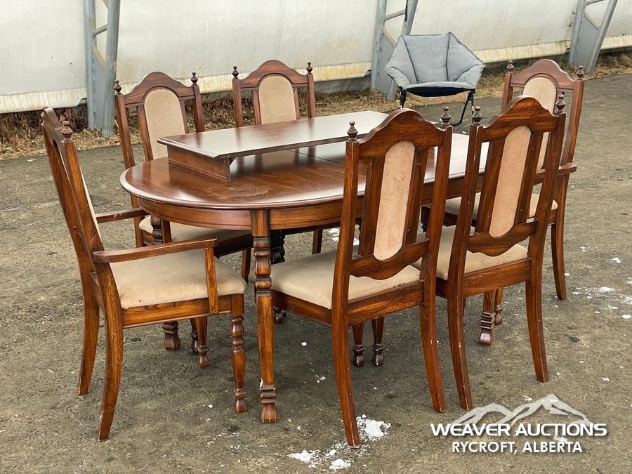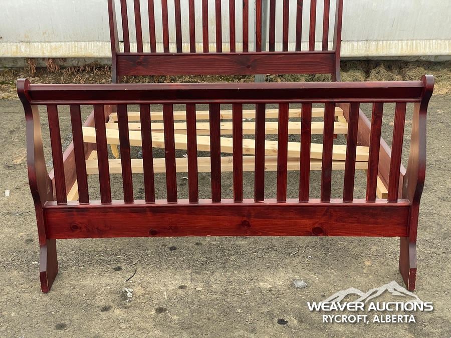 Specifications: SLEIGH BED FRAME, 2 PAPASON CHAIRS, OVAL WOODEN DINNING TABLE, (4) SIDE CHAIRS, (2) END TABLE CHAIRS, (1) TABLE LEAF, (1) CASSET PLAYER W/ASSORTED "BOOK ON TAPE" CASSETTS, (1) ORNAMENTAL CLOCK