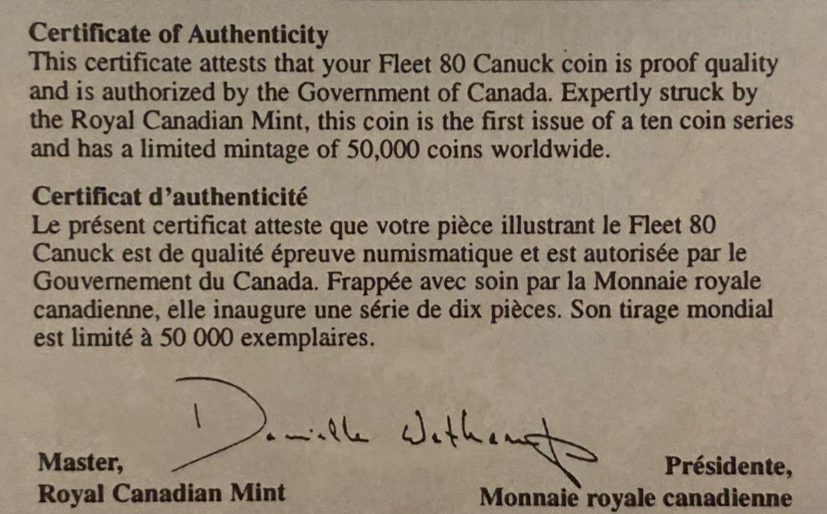 Lot 49 1990 $20 The Fleet 80 Canuck One Troy Ounce Proof Coin 92.5% Silver
