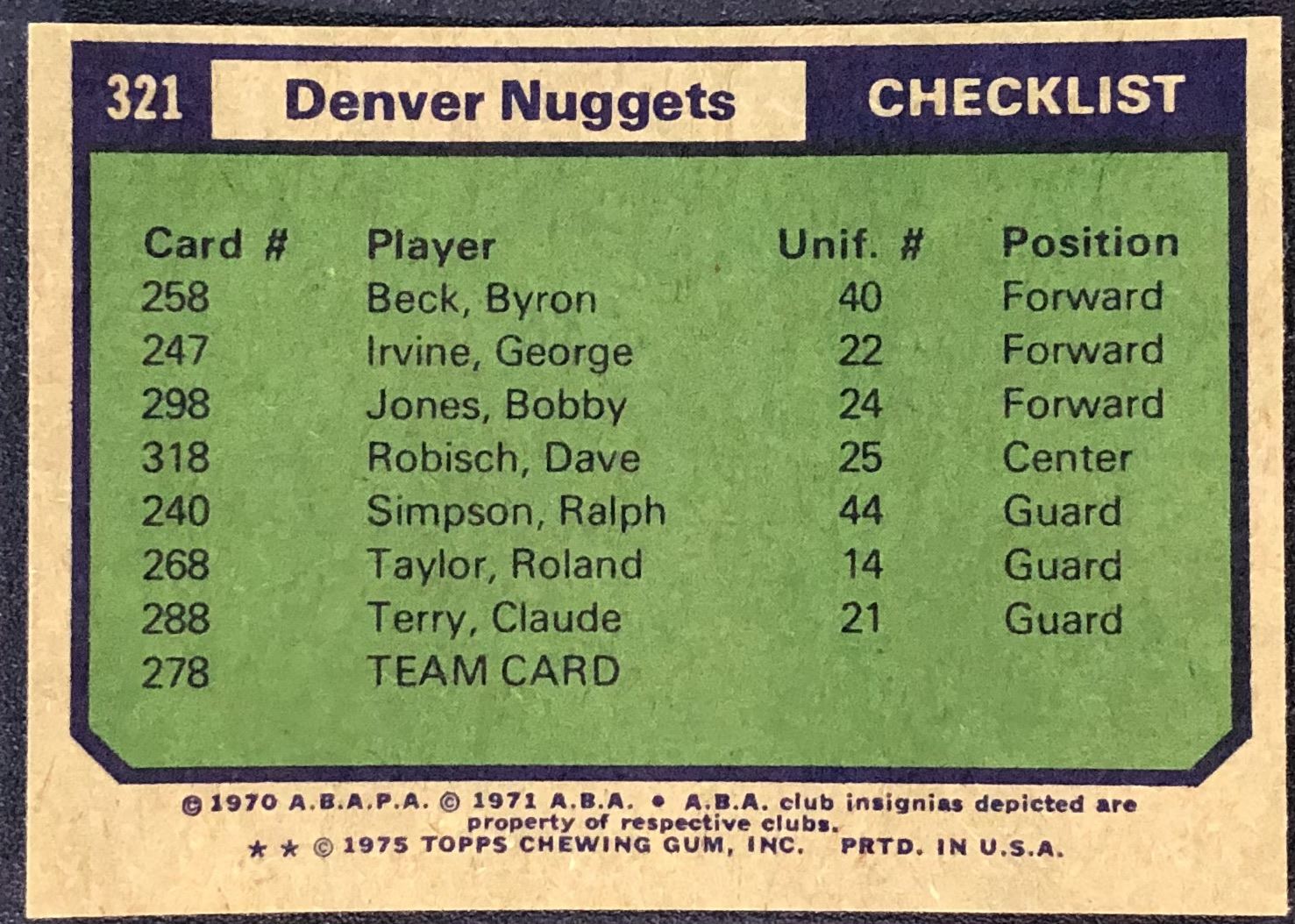 Lot 61 1975-76 TOPPS NBA DENVER NUGGETS