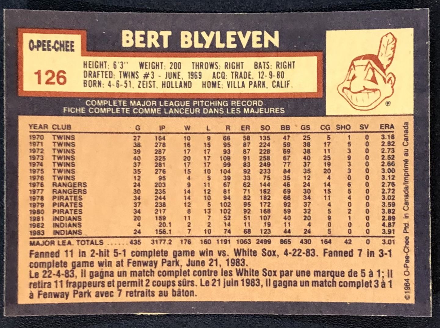Lot 131 1984 O-PEE-CHEE BERT BLYLEVEN (HOF)