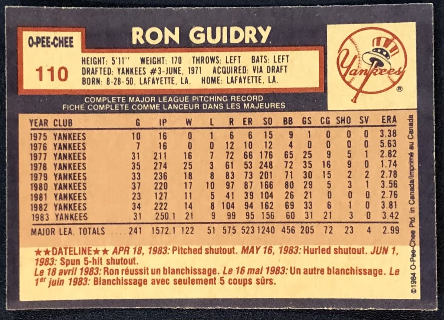 Lot 184 1984 O-PEE-CHEE RON GUIDRY