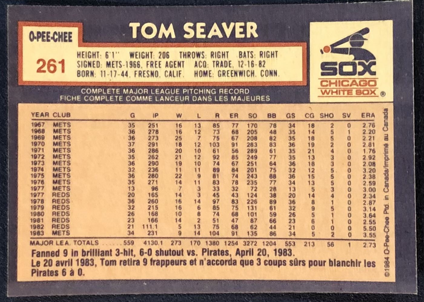 Lot 192 1984 O-PEE-CHEE TOM SEAVER (HOF)