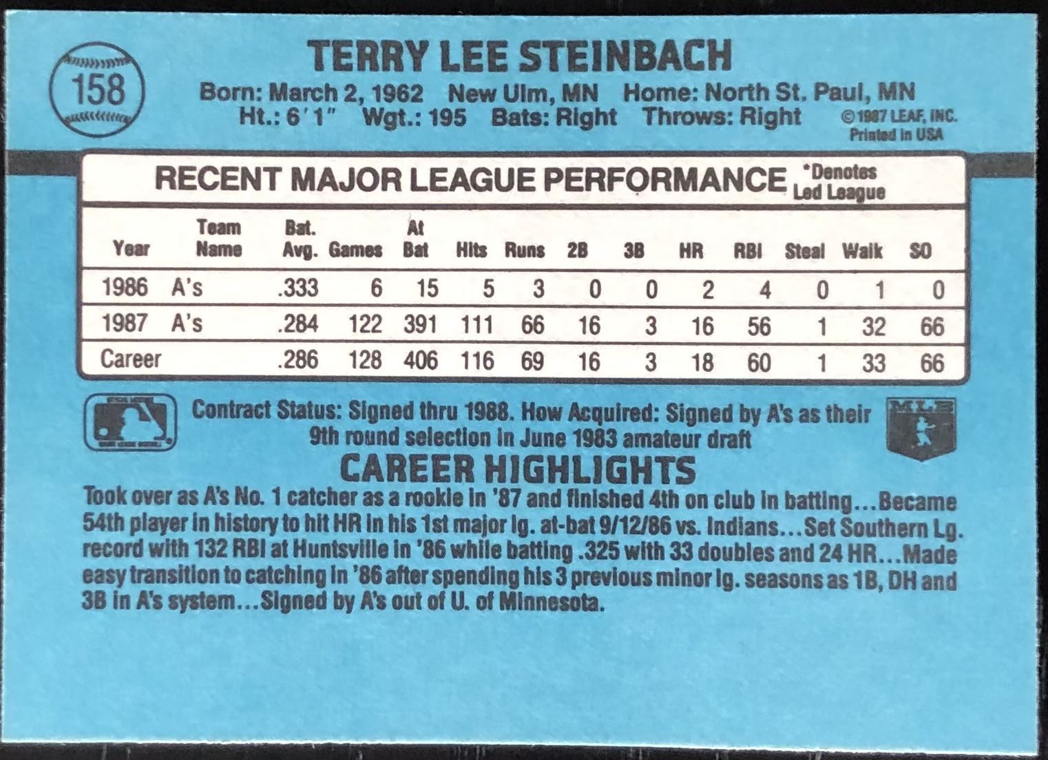 Lot 226 1988 DONRUSS TERRY STEINBACH ROOKIE CARD