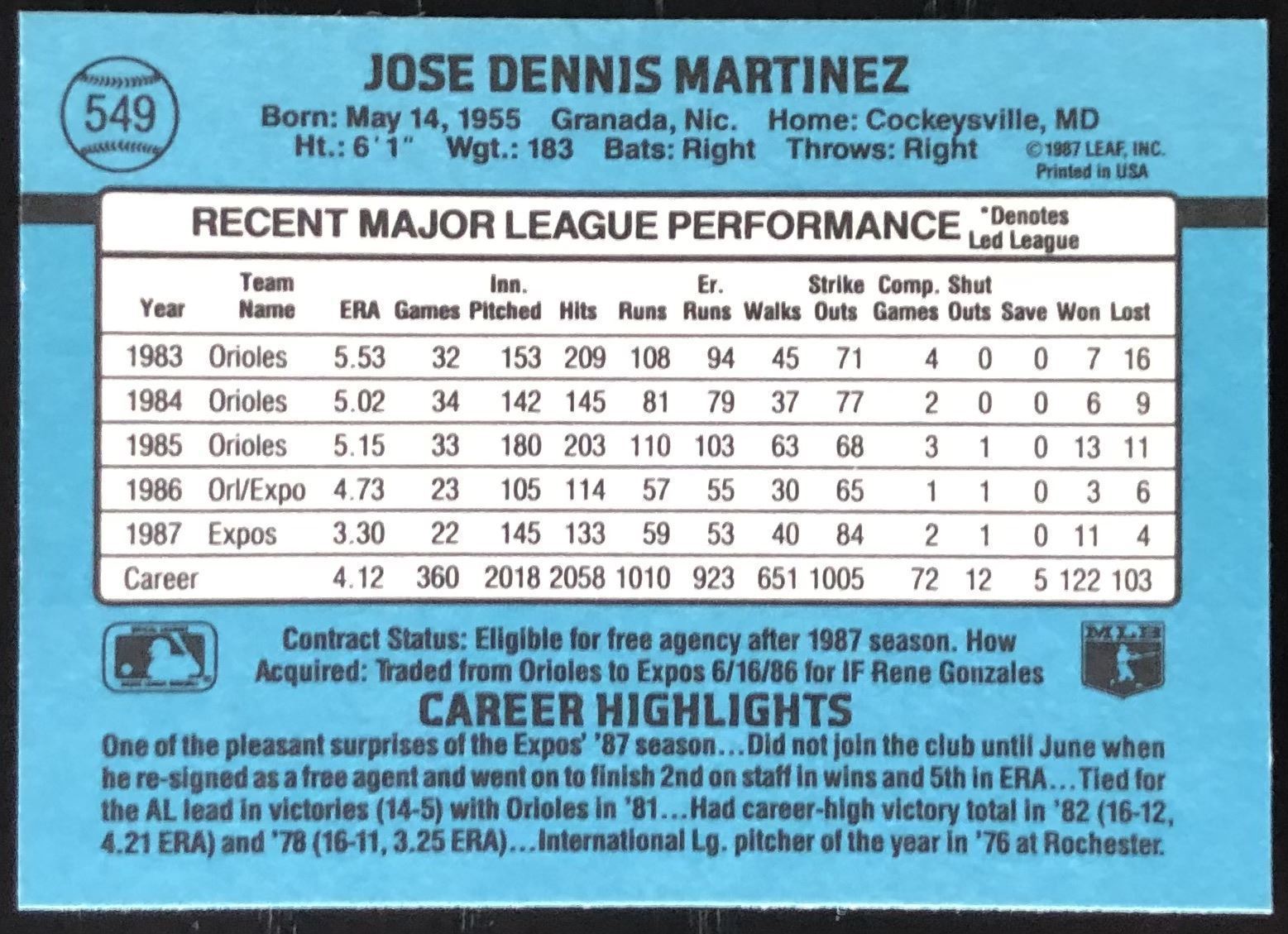 Lot 239 1988 DONRUSS DENNIS MARTINEZ