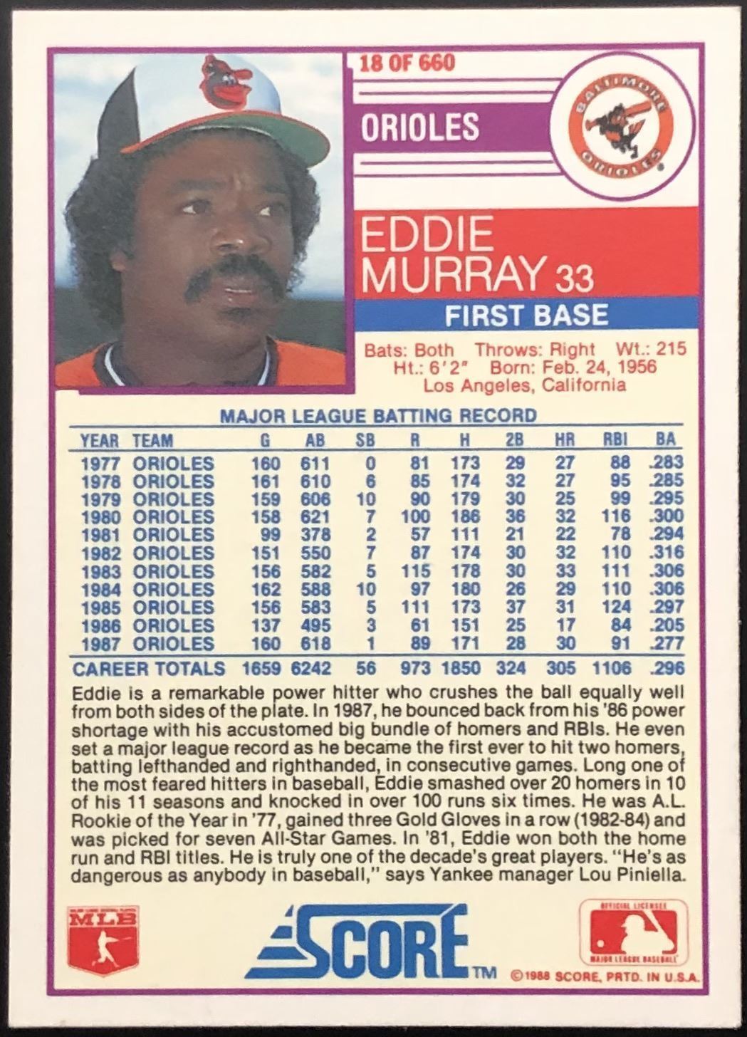 Lot 270 1988 SCORE EDDIE MURRAY (HOF)