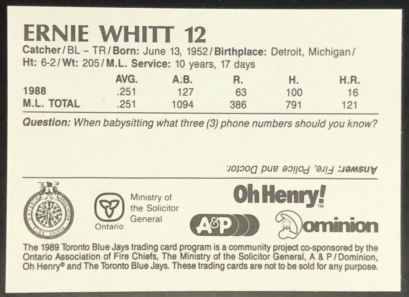 Lot 287 1989 TORONTO BLUE JAYS FIRE DEPT - ERNIE WHITT
