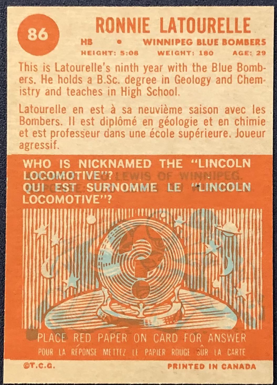 Card #86 vintage, CFL, OPC, football