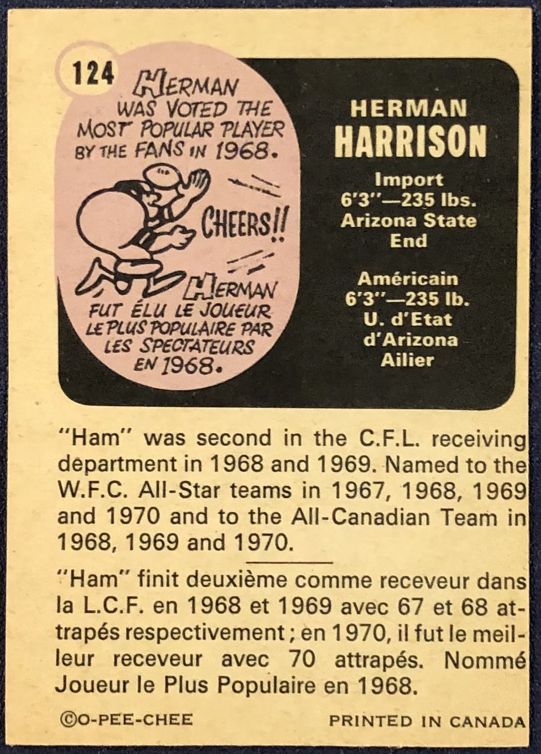 Card #124 CFL, football, vintage, OPC, hall of fame