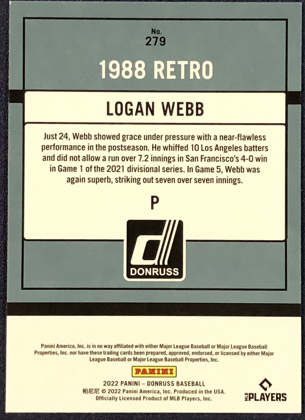 Lot 399 2022 DONRUSS YELLOW FLASH RETRO LOGAN WEBB