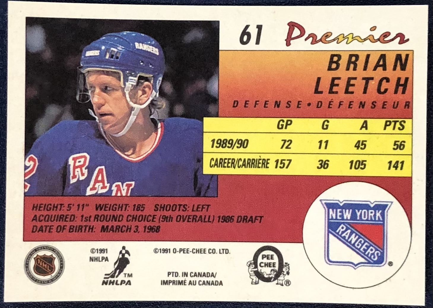Lot 443 1990-91 O-PEE-CHEE PREMIER BRIAN LEETCH (HOF)
