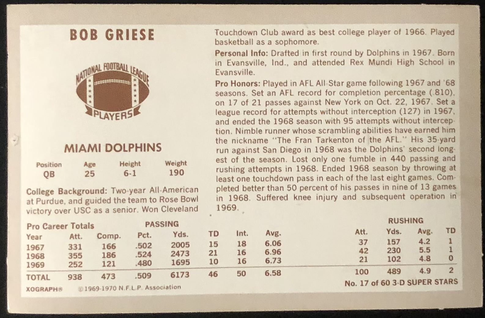 Lot 514 1970 KELLOGGS BOB GRIESE (HOF)