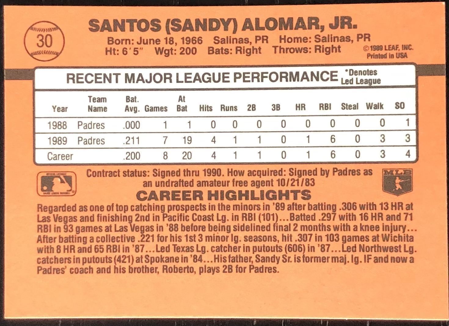 Lot 556 1990 DONRUSS SANDY ALOMAR JR. ROOKIE CARD