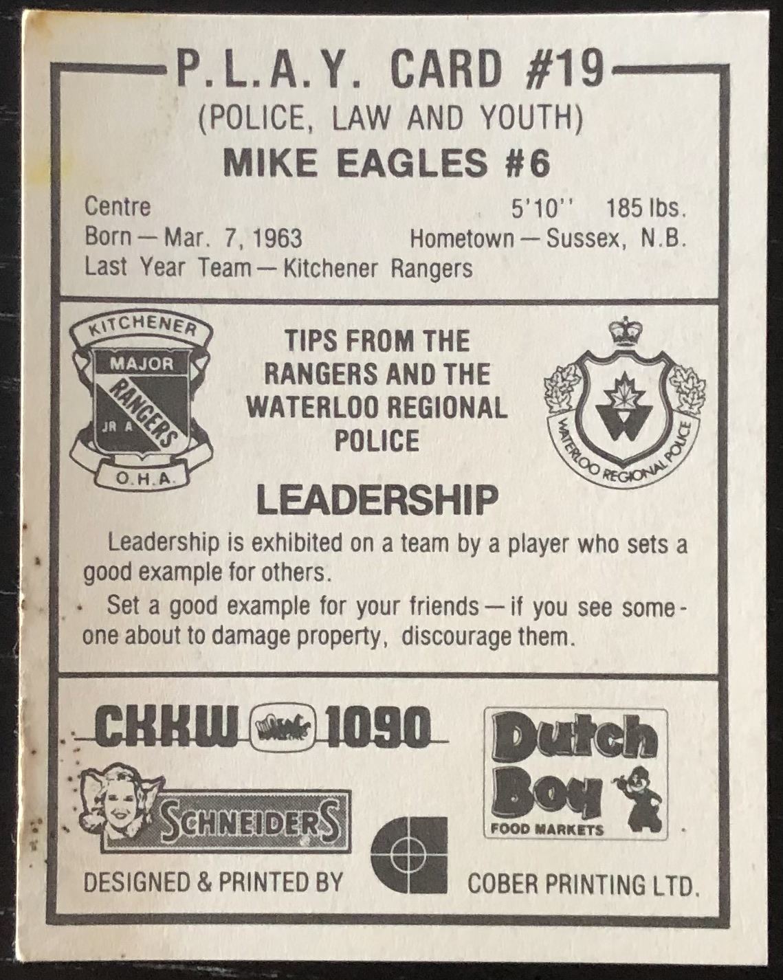 Team set issued by Waterloo (ON) Reginal Police, card #19 CHL, OHL, vintage, rookie