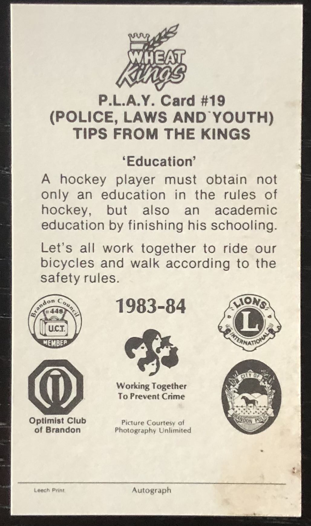 Team set issued by Brandon (ON) Reginal Police, card #19 CHL, WHL, vintage, rookie