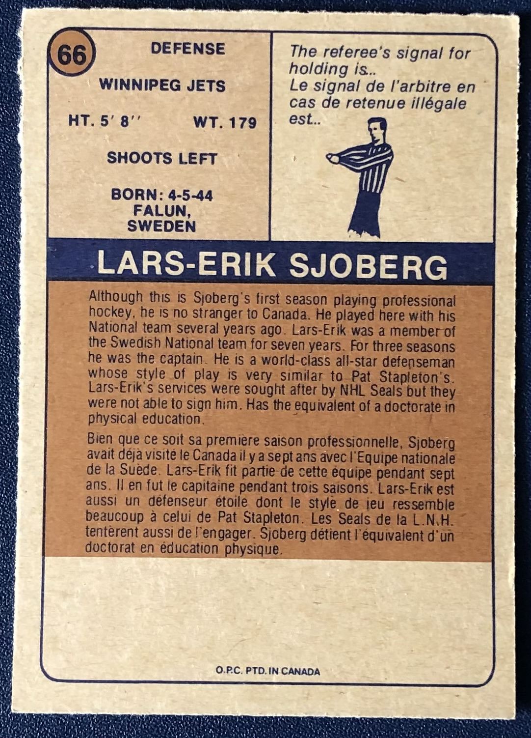 Lot 833 1974-75 O-PEE-CHEE WHA LARS-ERIK SJOBERG ROOKIE CARD