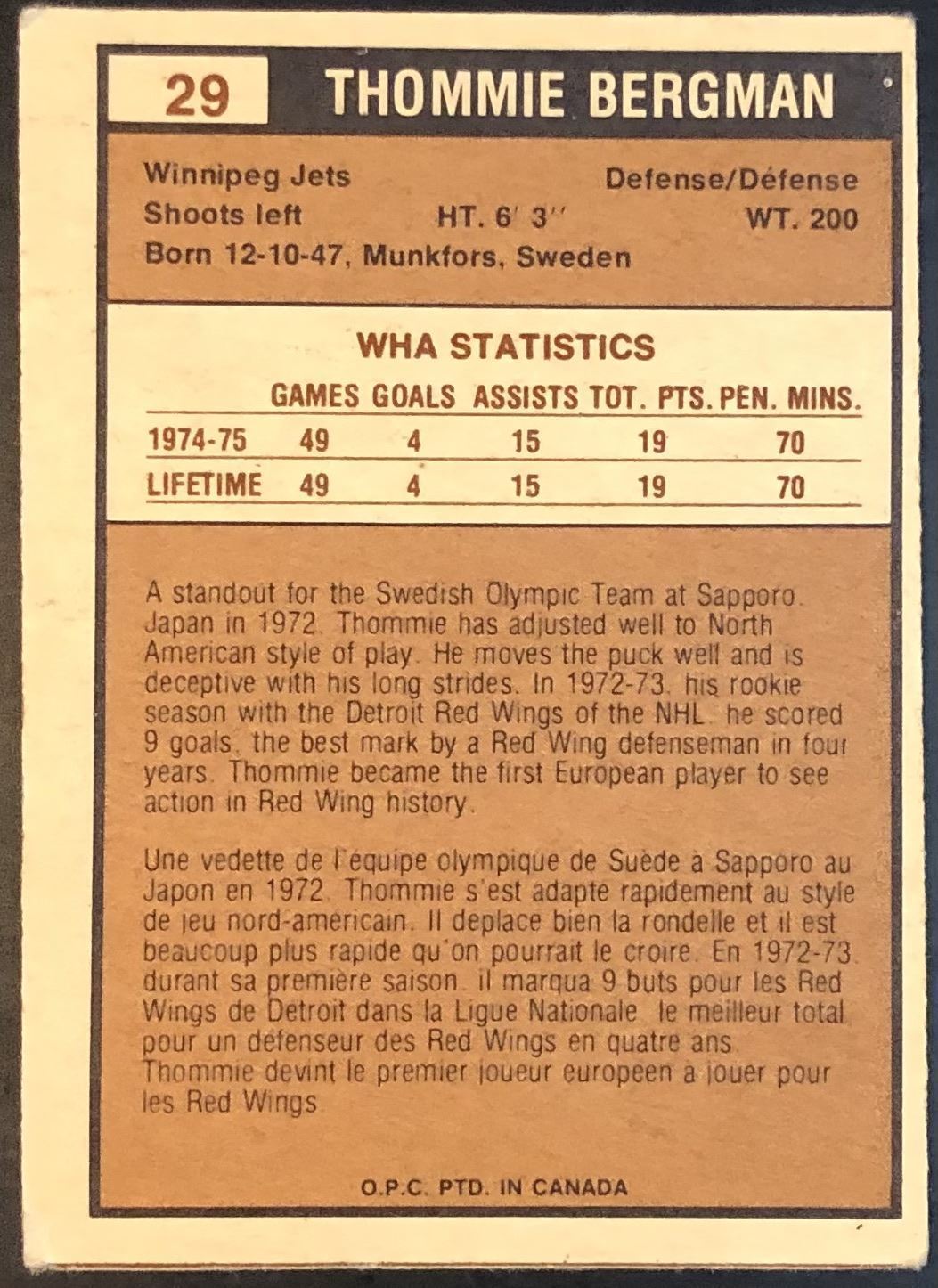 Lot 845 1975-76 WHA O-PEE-CHEE THOMMIE BERGMAN ROOKIE CARD