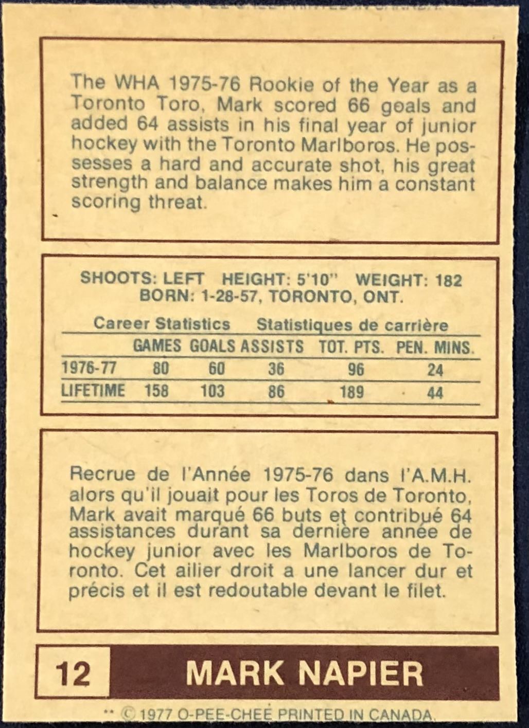 Lot 867 1977-78 O-PEE-CHEE WHA MARK NAPIER