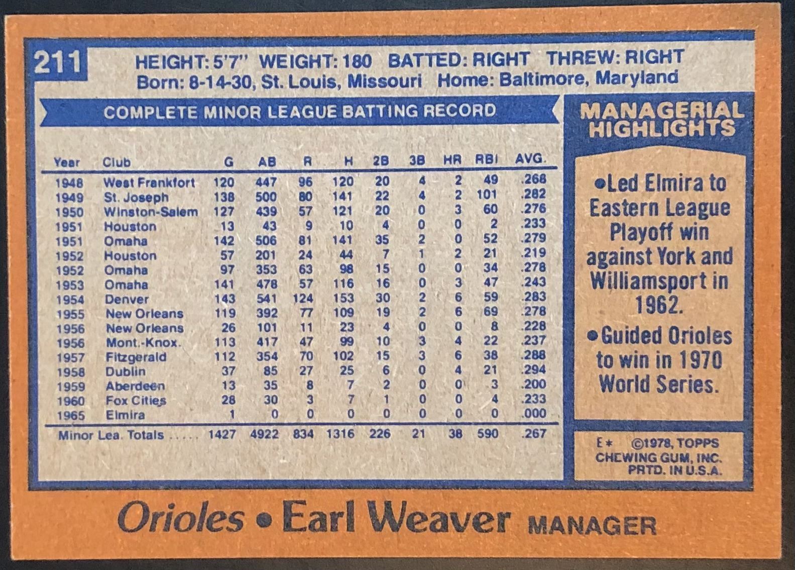 Lot 910 1978 TOPPS EARL WEAVER (HOF)
