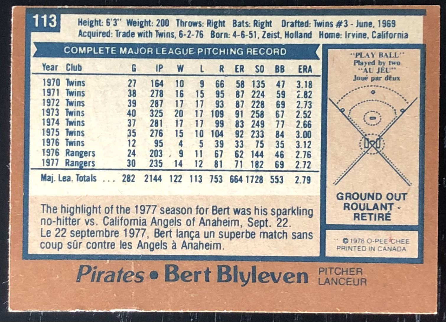 Lot 919 1978 O-PEE-CHEE BERT BLYLEVEN (HOF)
