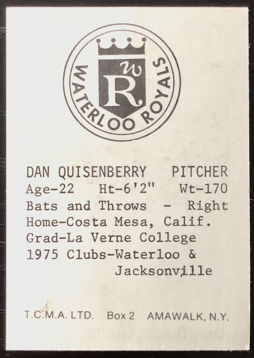 Lot 926 1976 WATERLOO ROYALS DAN QUISENBERRY ROOKIE CARD