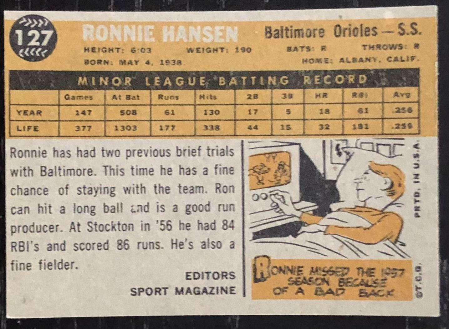 Lot 1113 1960 TOPPS GRAY BACKS RONNIE HANSEN
