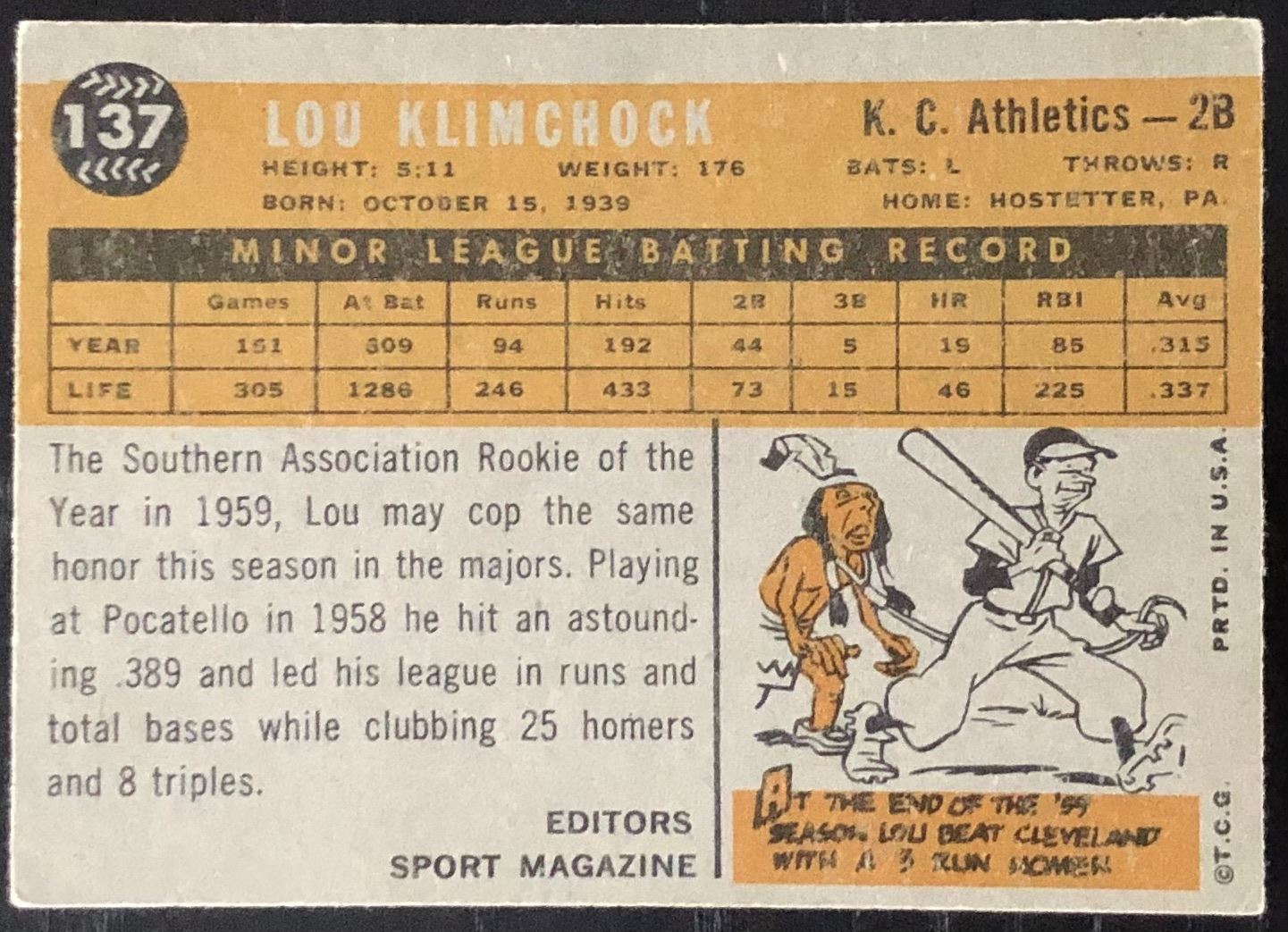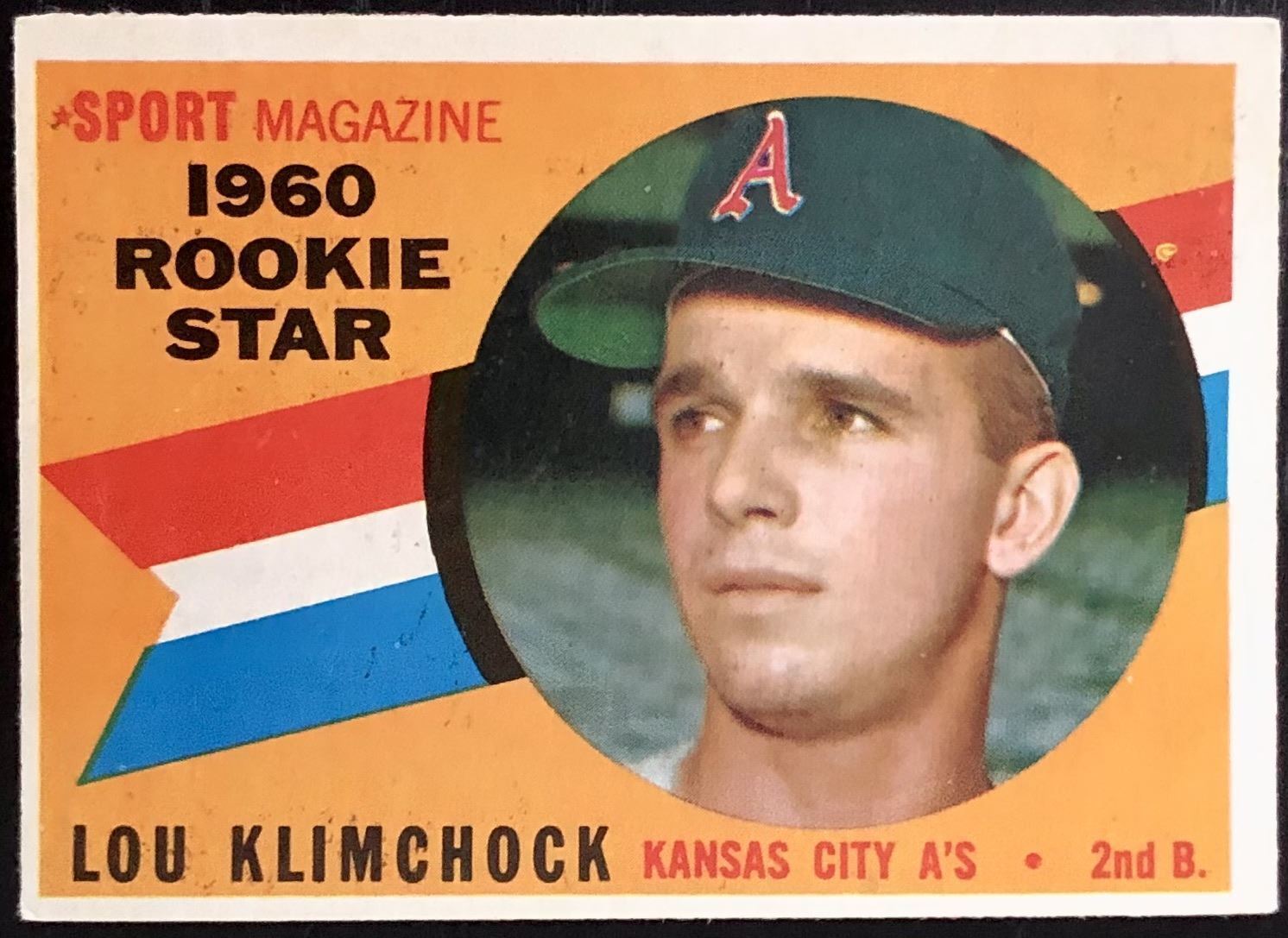 Lot 1142 1960 TOPPS GRAY BACK LOU KLIMCHOCK ROOKIE CARD